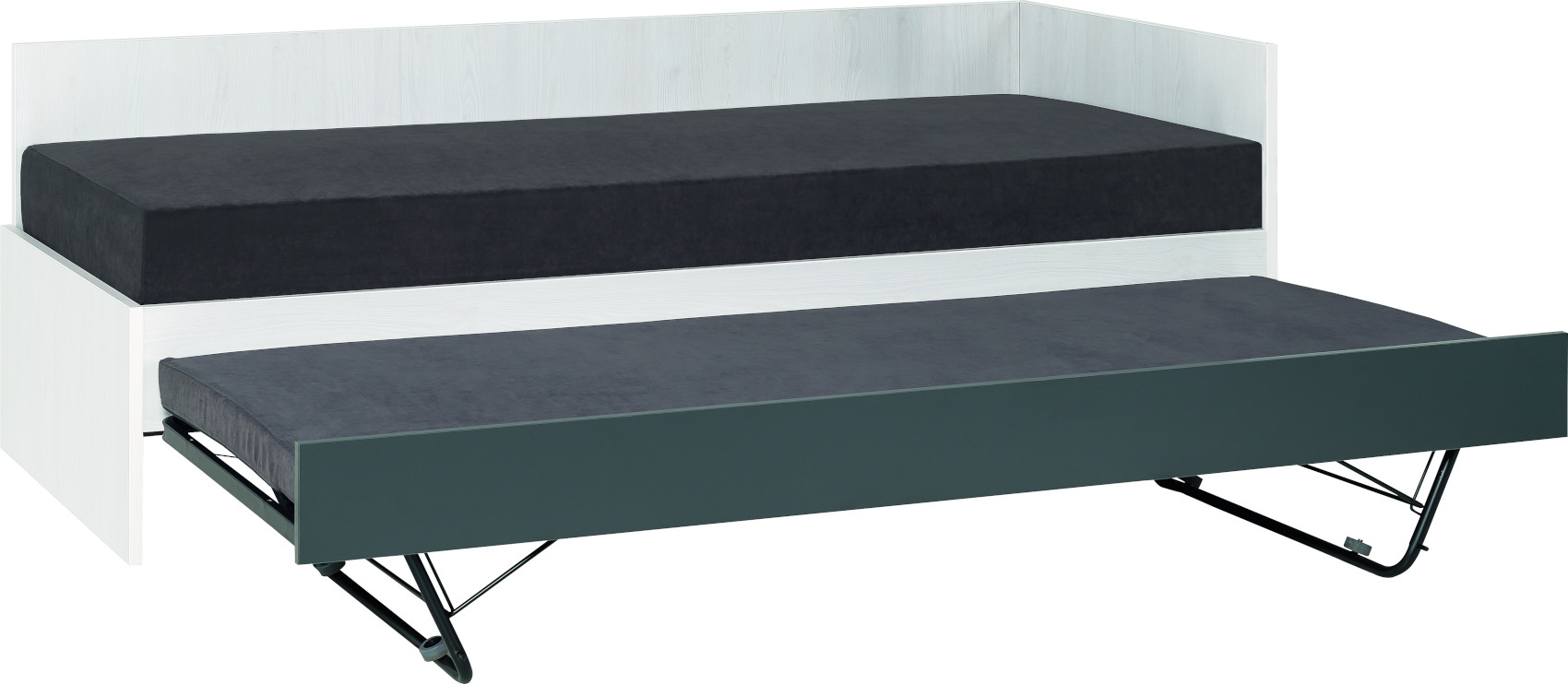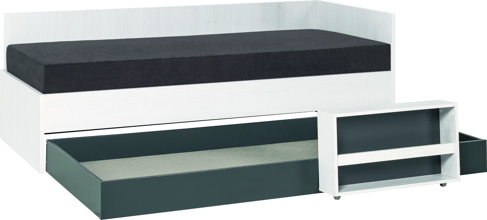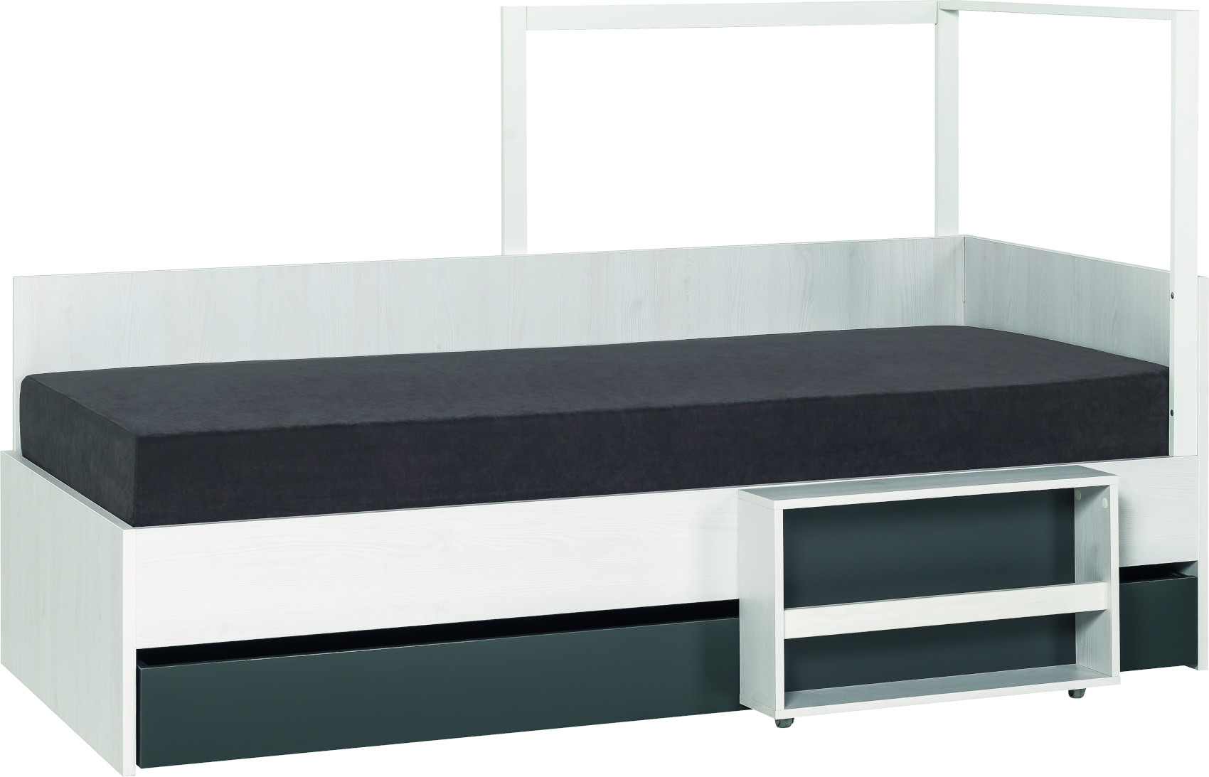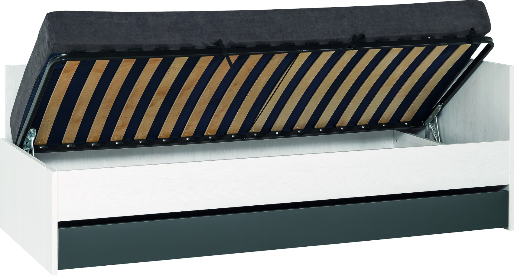 Součástí je výklopný lamelový rošt, pod kterým je prostor k uložení ložního prádla nebo přikrývky. Matrace není součástí kanape, ale můžete si ji doobjednat v kategorii Matrace a rošty. Ve spodní části je plné čelo v barvě grafitu. Do volného prostoru za čelem lze dokoupit úložnou zásuvku nebo přídavné lůžko k občasnému přespání, které je vybaveno lamelovým roštem bez matrace. V naší nabídce naleznete také skříňku ke kanapi Nest, do které si vystavíte své oblíbené knihy, dekorace nebo rámečky s fotografiemi.