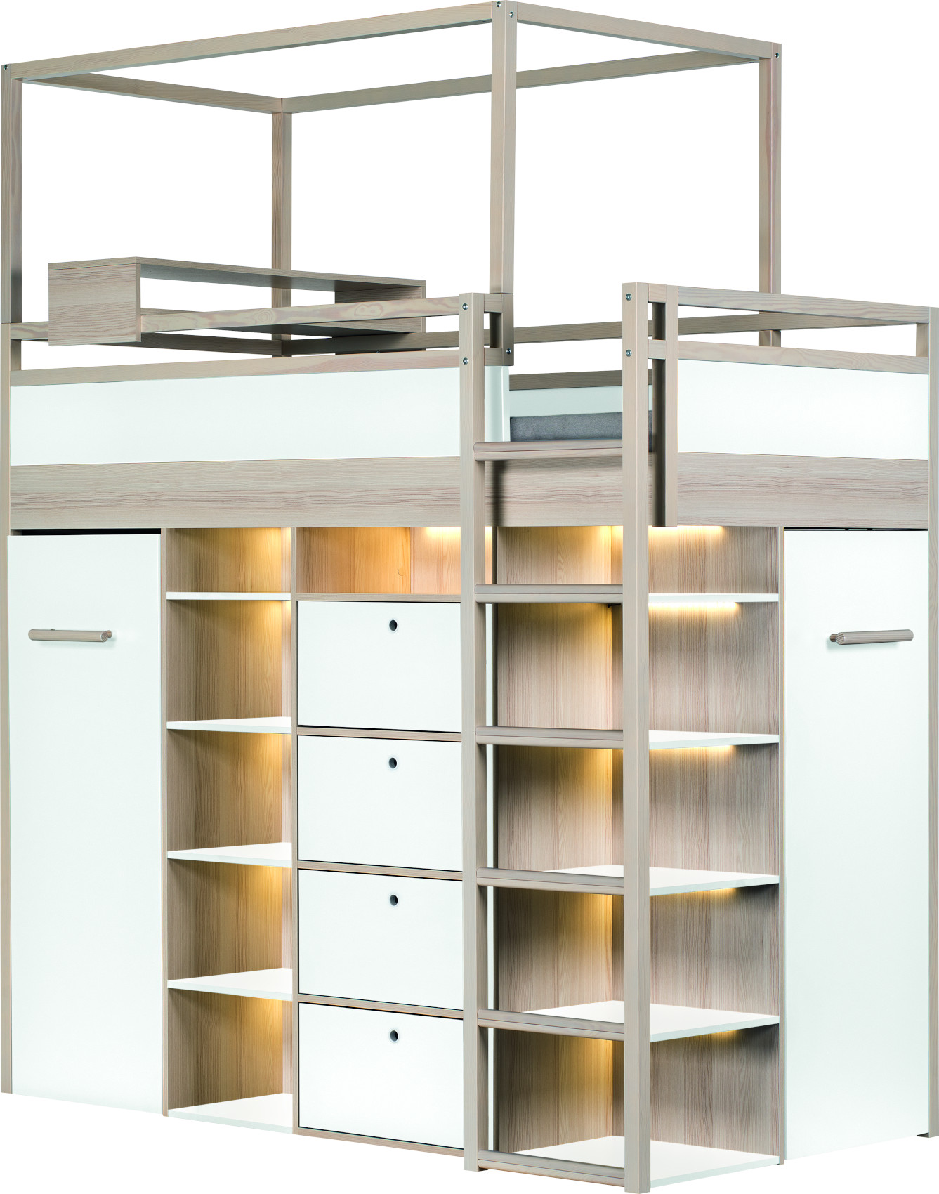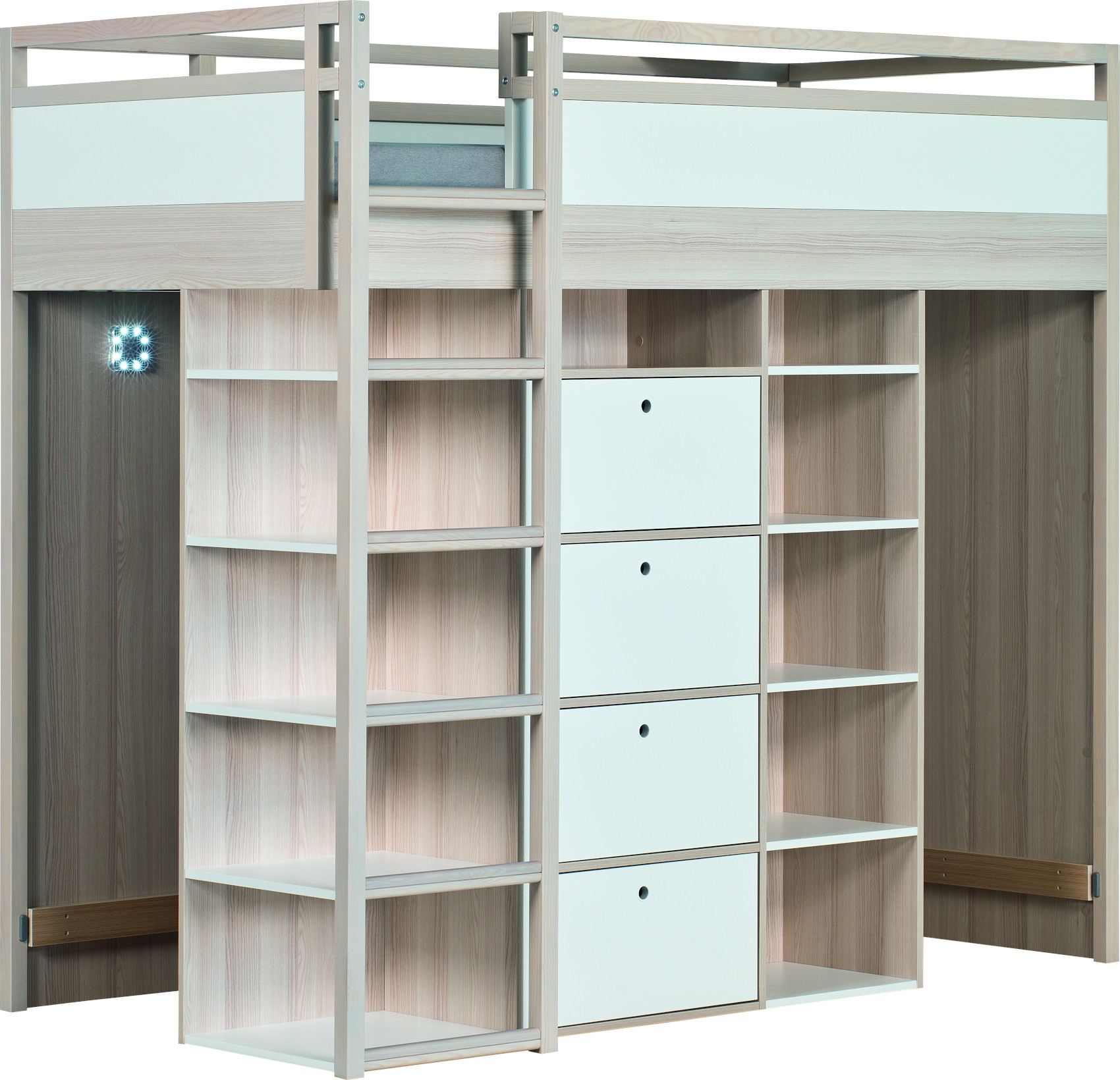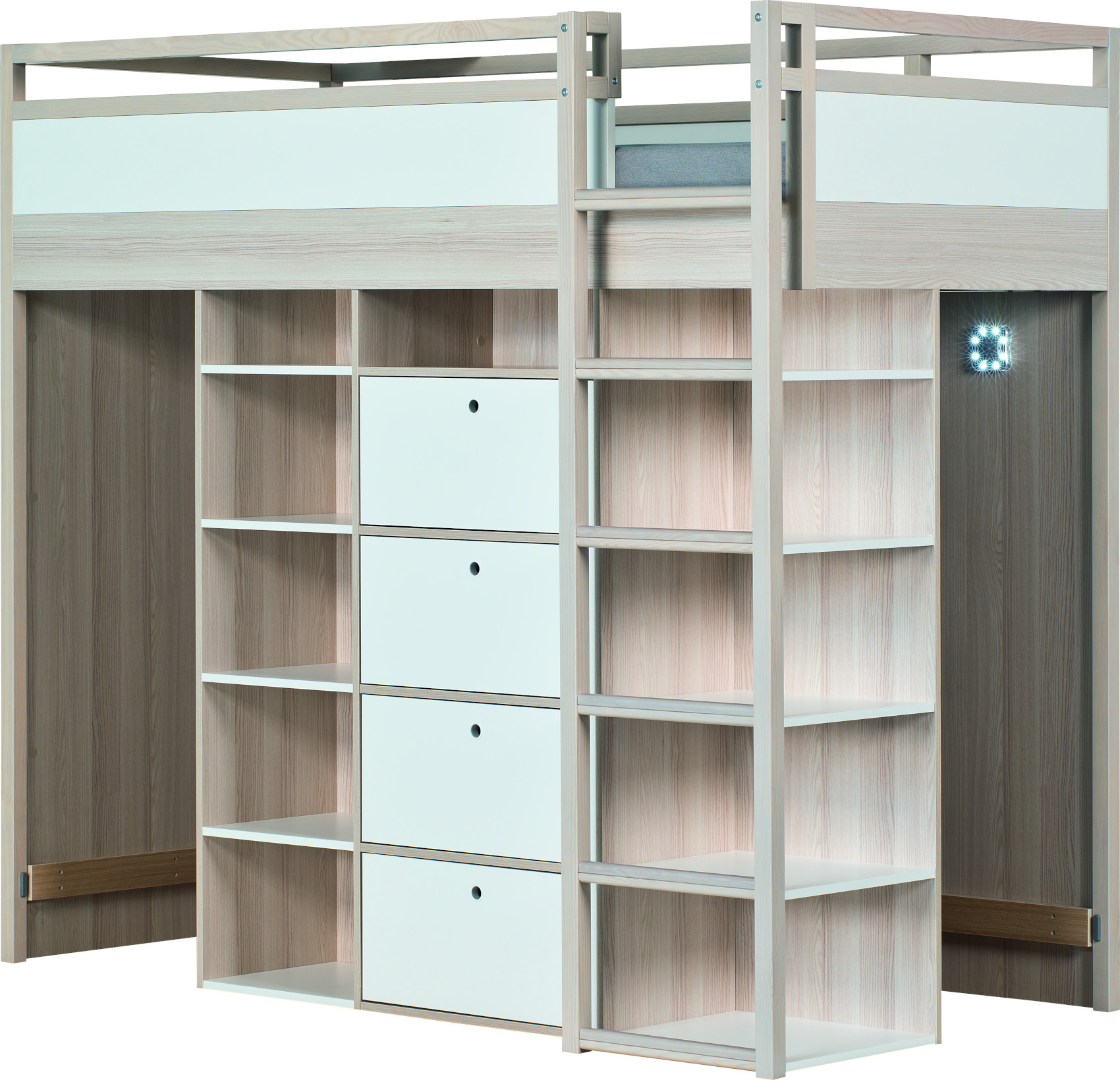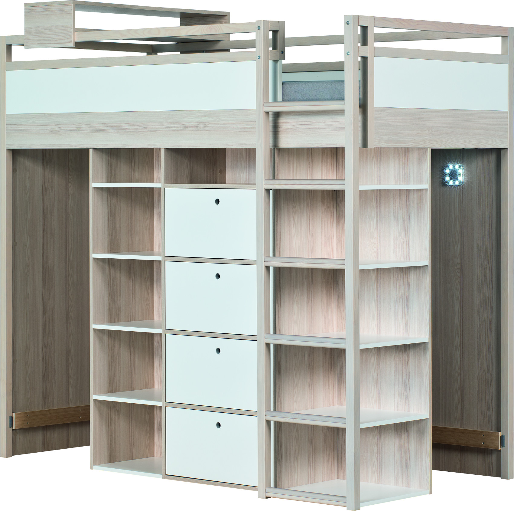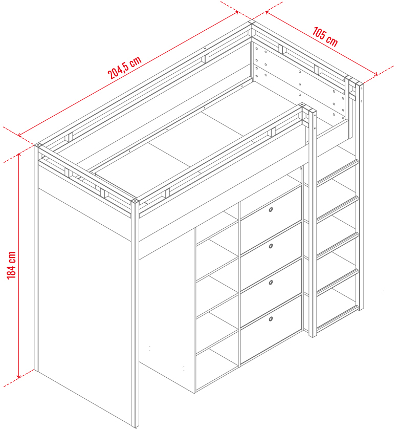 Součástí patrové postele je postel, komoda se 4 zásuvkami na kovových pojezdech a skříň. V prostřední části pod postelí je policový systém se 4 lakovanými policemi osvícené LED zářivkou. V přední části jsou 2 regály se 4 lakovanými policemi k umístění knih, dekorací nebo oblečení.