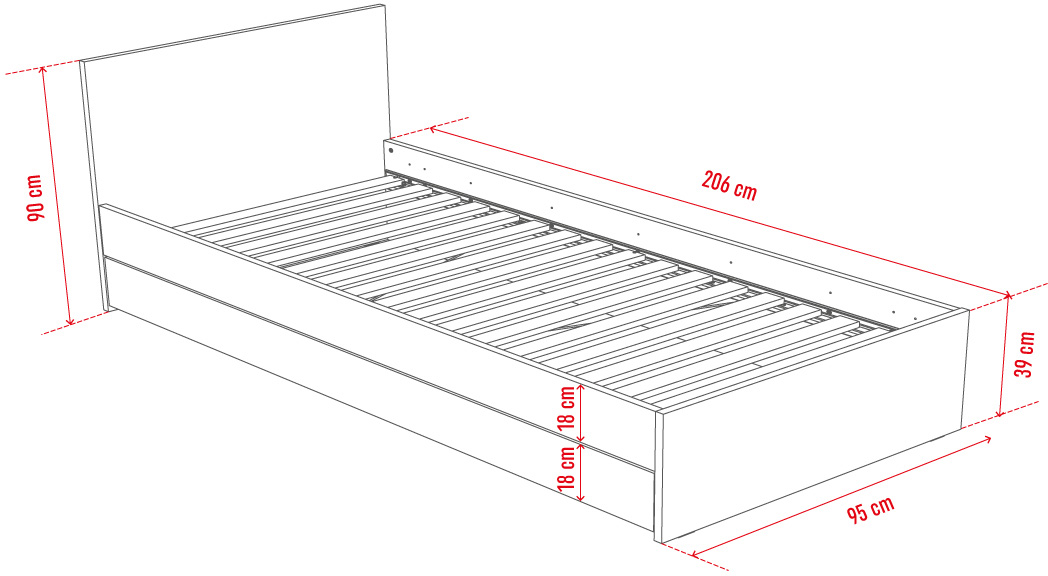 Součástí postele není rošt ani matrace. Rošt i matraci o rozměrech 90x200 cm je potřeba si dokoupit v kategorii Matrace a rošty. Na čelo postele si lze dokoupit také záhlavek Simple. Pod názvem úložný prostor pro kanape a postel si lze dokoupit úložnou zásuvku k uložení ložního prádla nebo přikrývky.