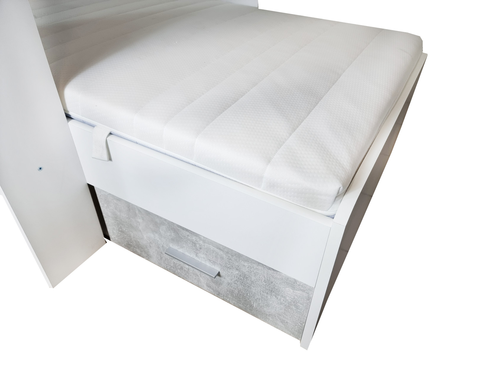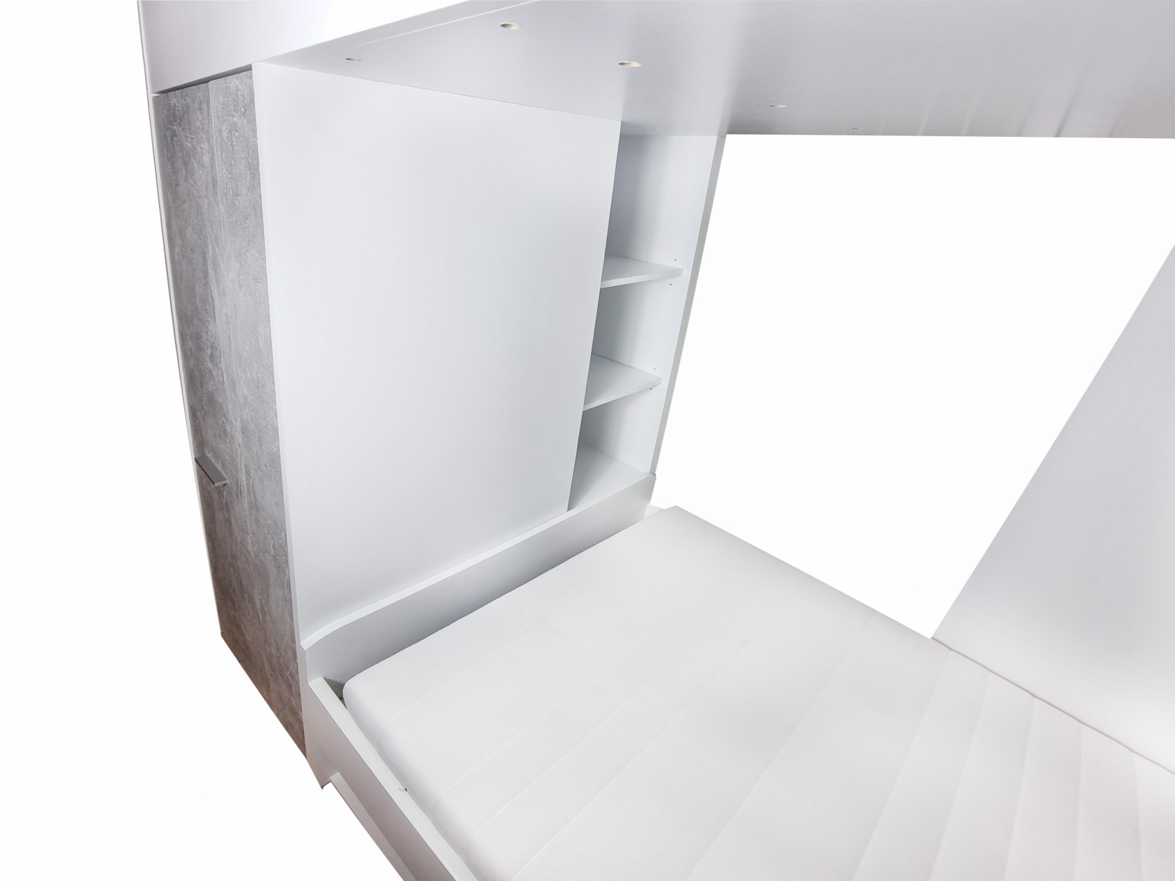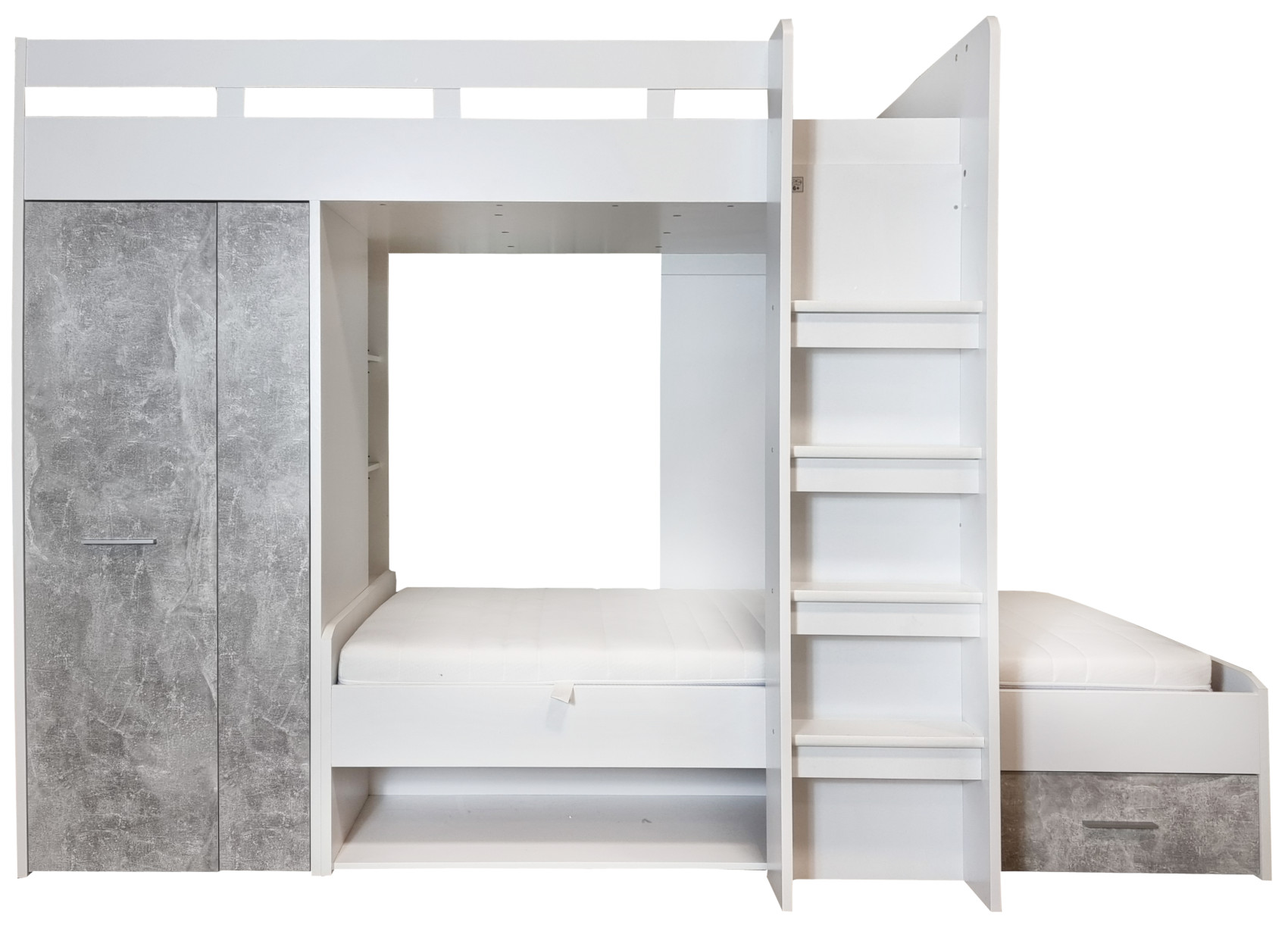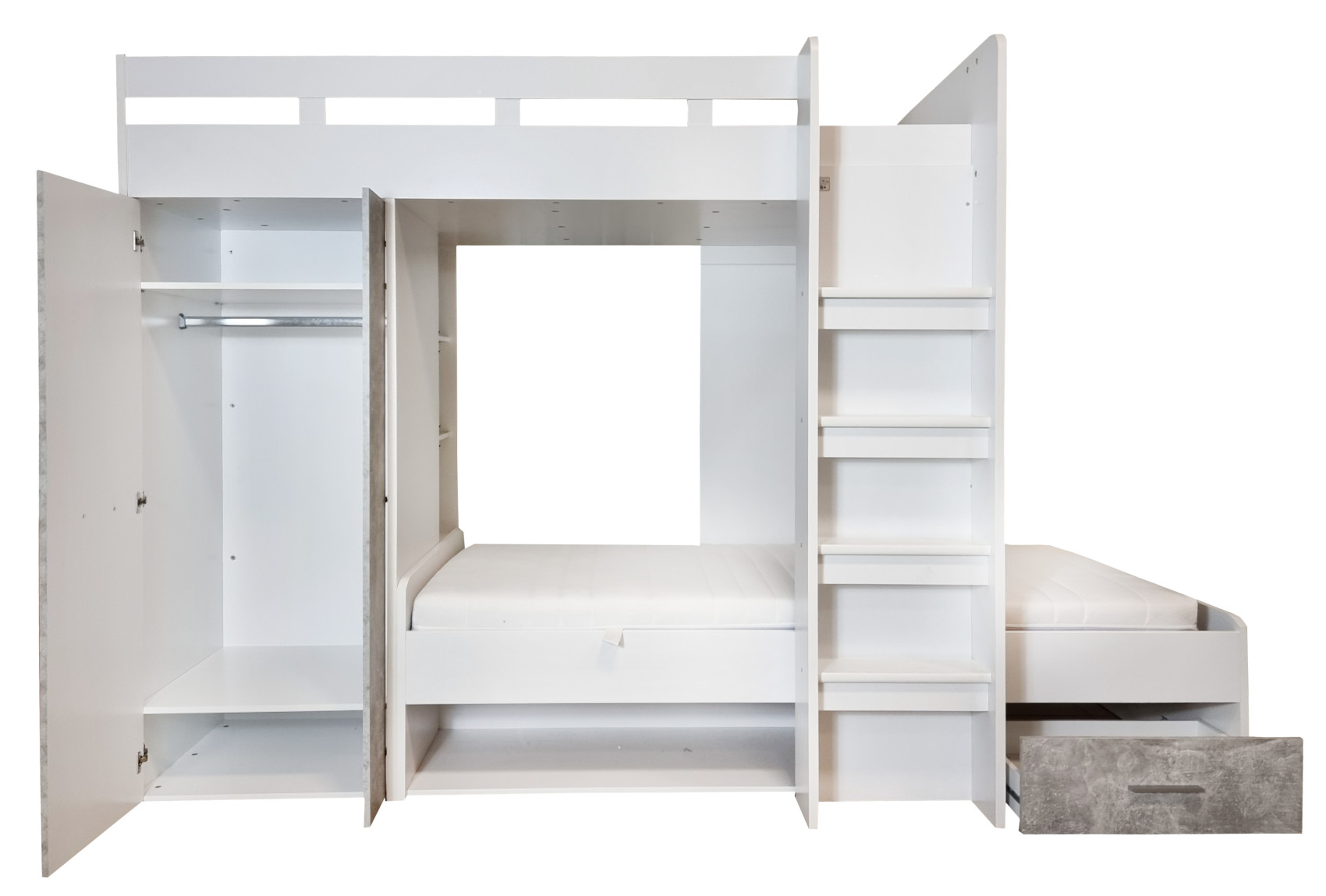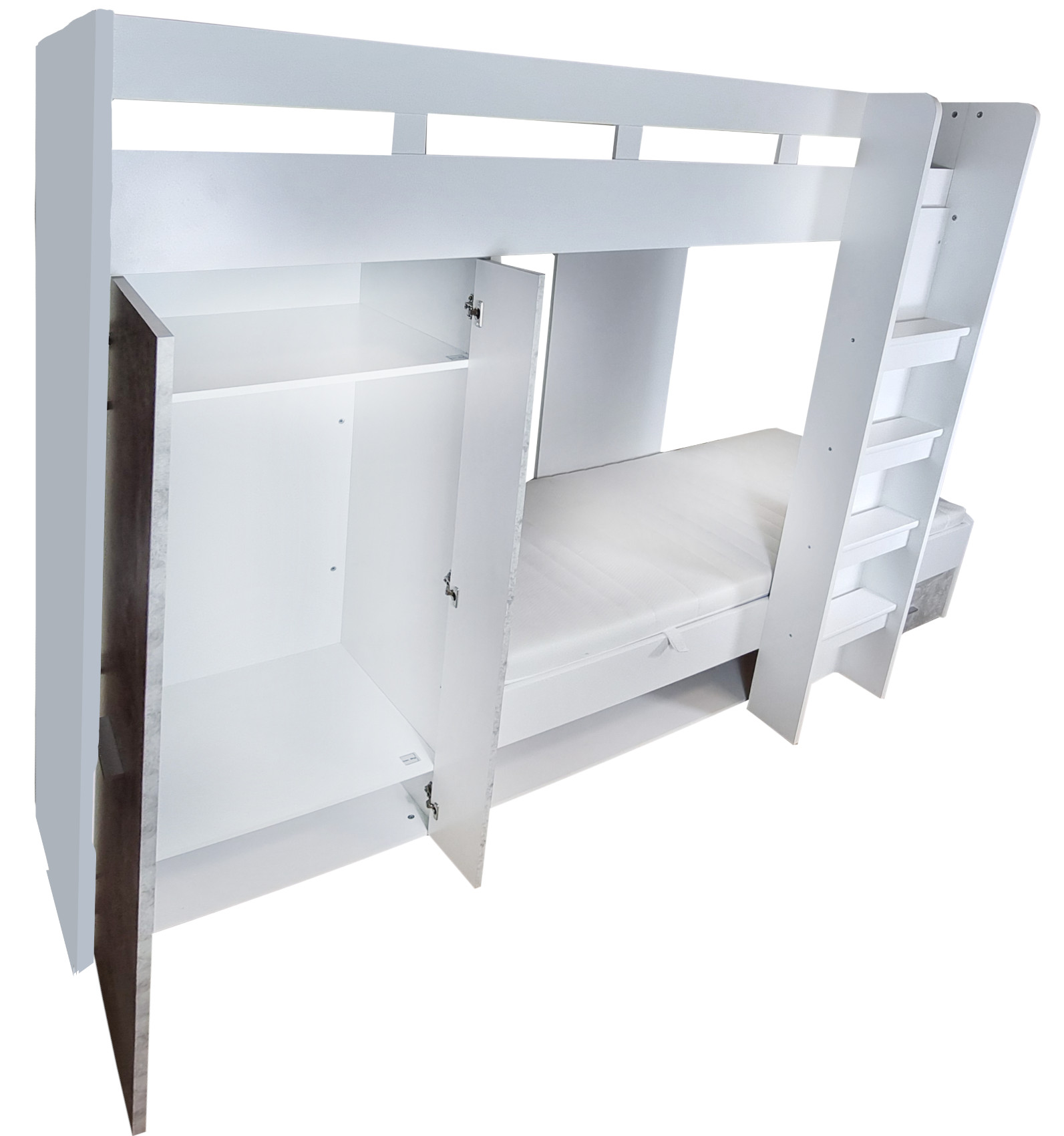 Součástí postele jsou 2 lůžka - horní a spodní. Na levé straně jsou dvířka, za kterými je menší úložná skříň. Ve spodní části nad postelí jsou 3 police k vystavení oblíbených knih, dekorací nebo rámečků s fotografiemi. Pod lůžkem je další otevřená nika a zásuvka na kovových pojezdech. Žebřík je součástí postele.