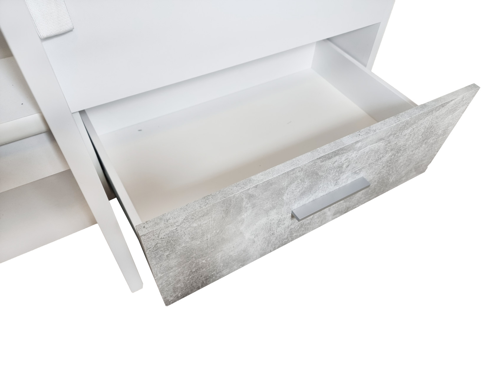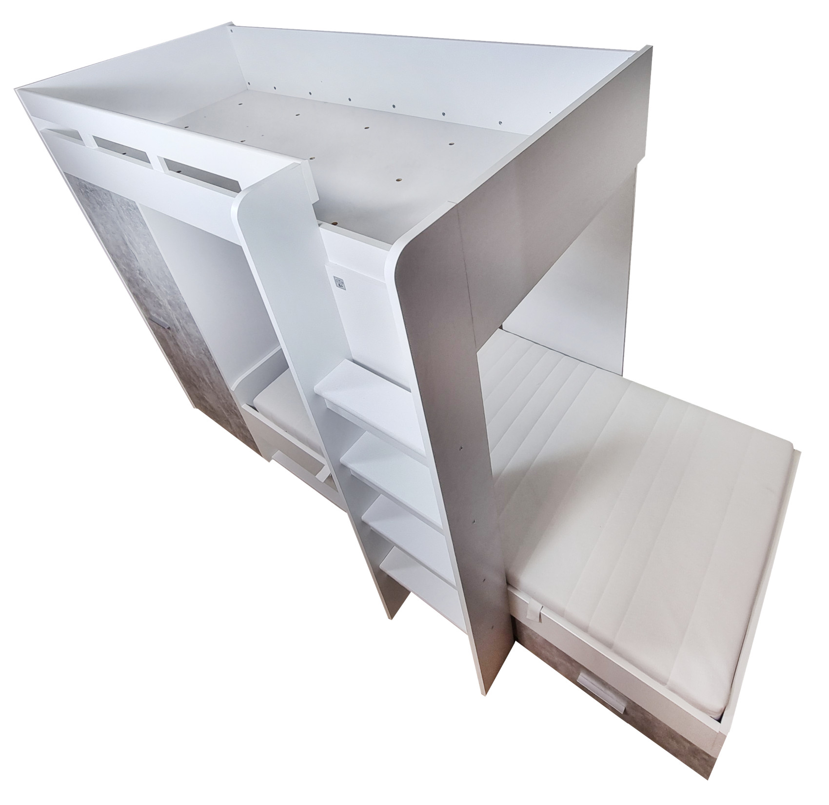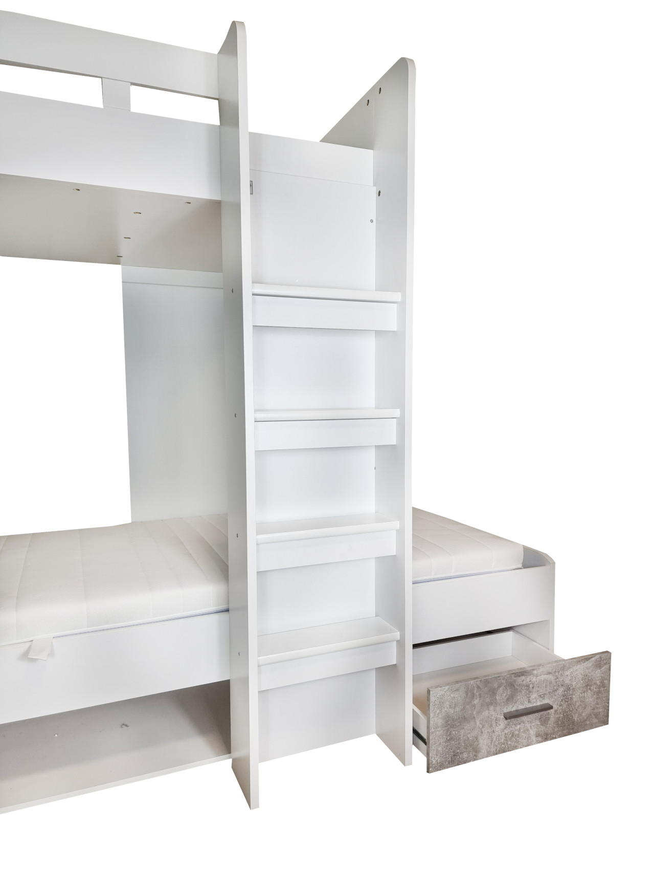 Moderní patrová postel Max I vás zaujme svým jednoduchým a elegantním designem. Je vyrobena z lamina potaženého bílou fólií s šedými detaily.