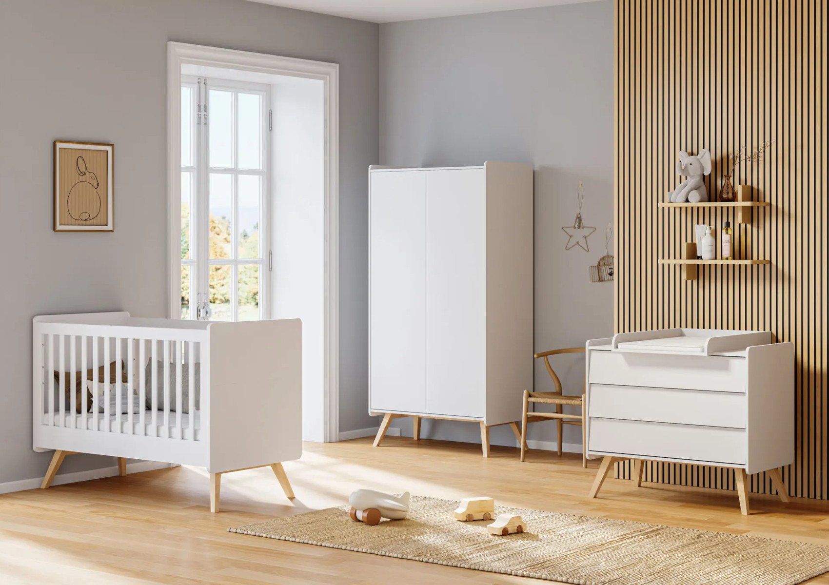 Dětský pokoj Vintage vás zaujme svým jedinečným bílým designem v retro stylu. Komodity jsou vyrobeny z kvalitního lamina odolného vůči poškrábání, nečistotám a vlhkosti. Úzké dlouhé nožky, které provzdušní váš prostoru a dodají nábytku nádech elegance, jsou z masivního dubového dřeva. Zásuvky mají zabudovaný jednoduchý dotykový systém otevírání - Push to open spolu se systémem tichého dovírání.