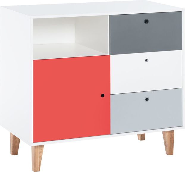 Moderní komoda Concept II vás zaujme svým jedinečným designem. Je vyrobena z kvalitního odolného lamina o tloušťce 16 mm a nožky o výšce 18 cm jsou z lakovaného dubového dřeva. Přední část komody si můžete vybrat ze 6 barevných variant - šafrán, modrá, červená, dub, černá a růžová. Rukojetí je kulatý otvor se silikonovým povrchem. Dvířka i zásuvky v celém systému mají systém tichého dovírání.