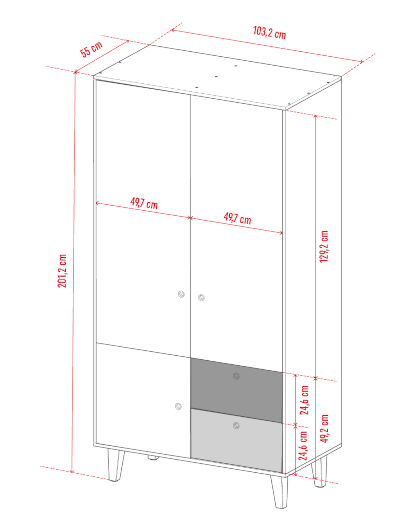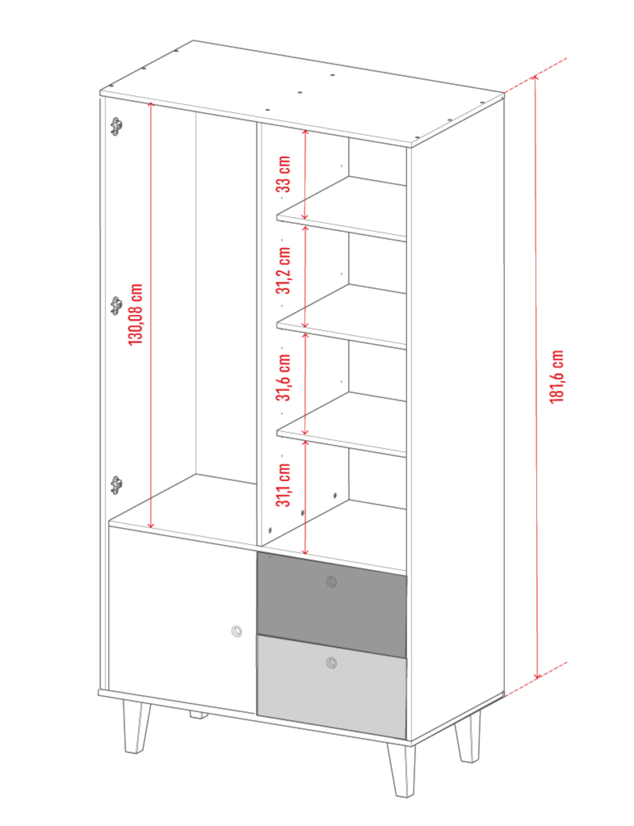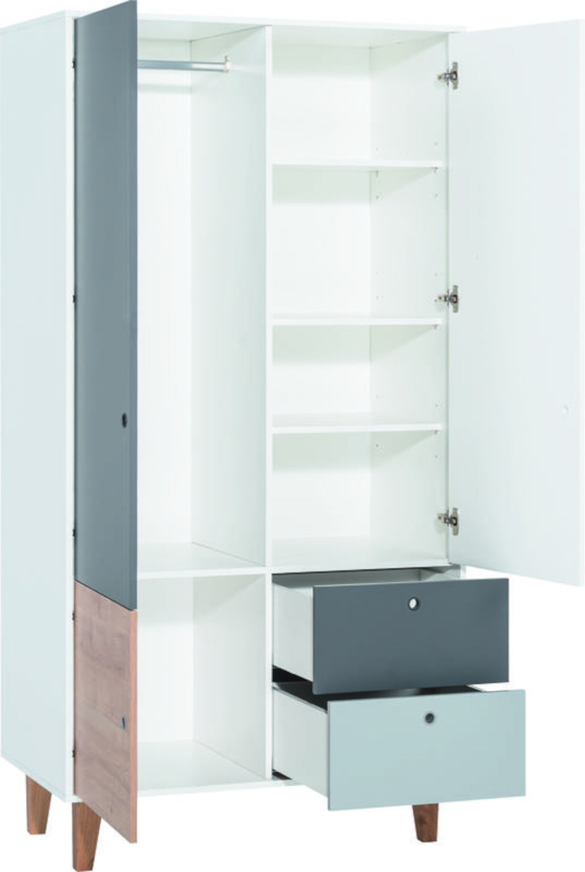 Součástí skříně jsou 2 dvířka, 2 zásuvky na kovových pojezdech Quadro a malá skříňka ve spodní části. Ve vnitřním prostoru je vložena 1 šatní tyč a 3 police s libovolně nastavitelnou výškou.