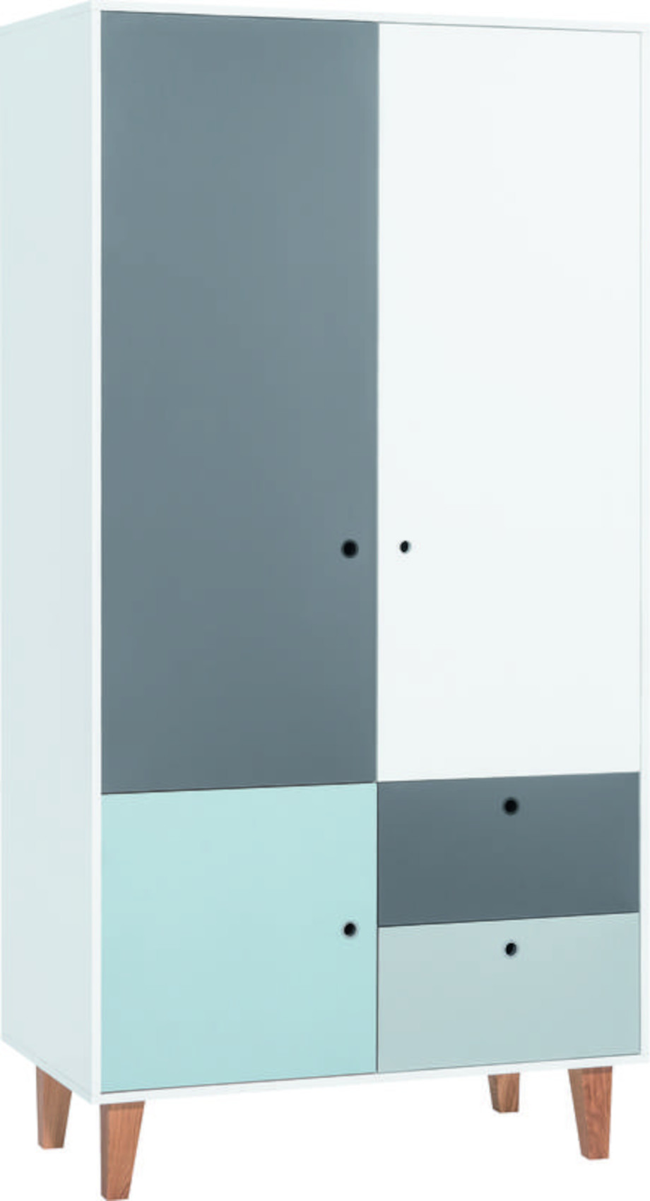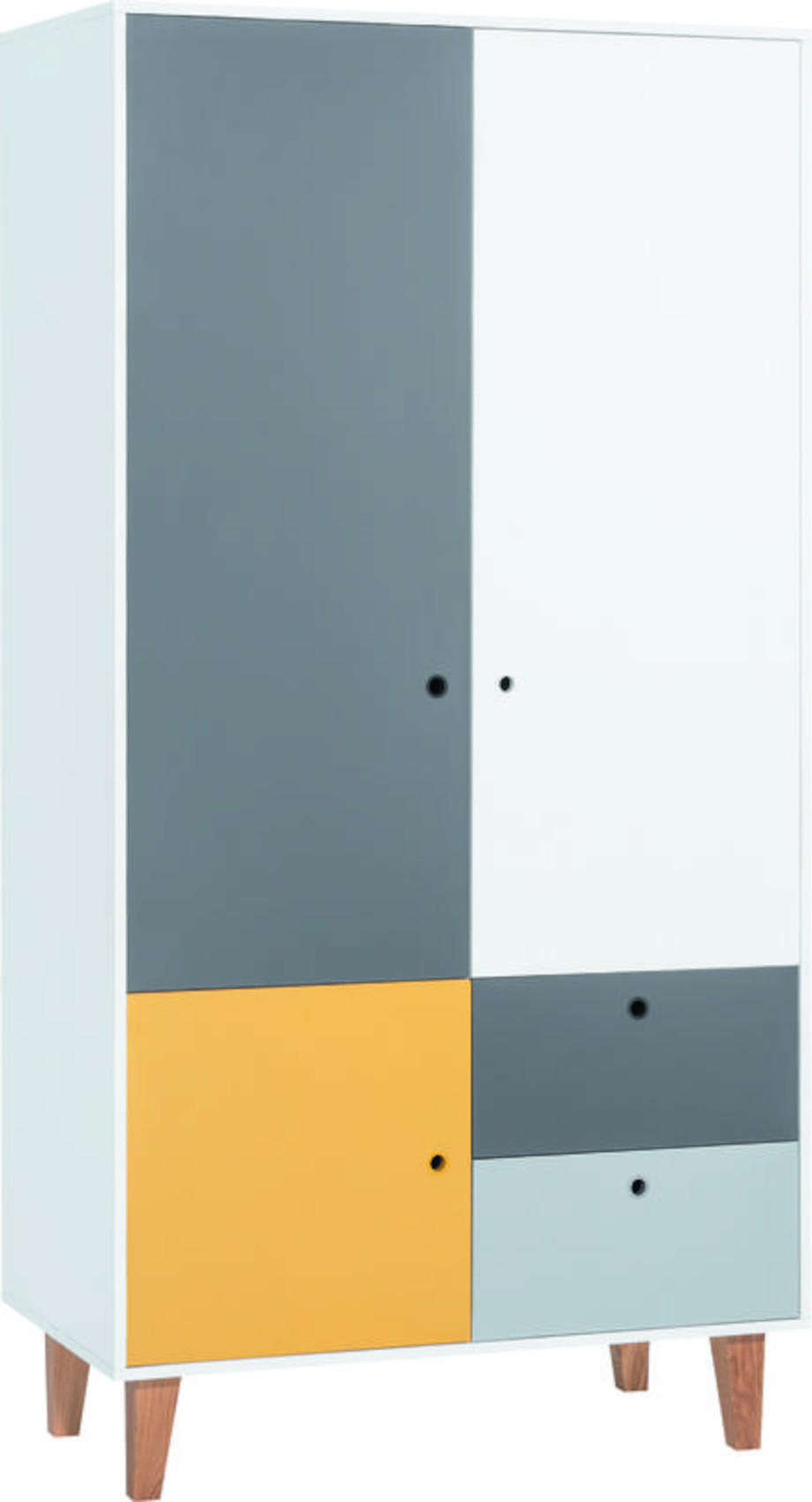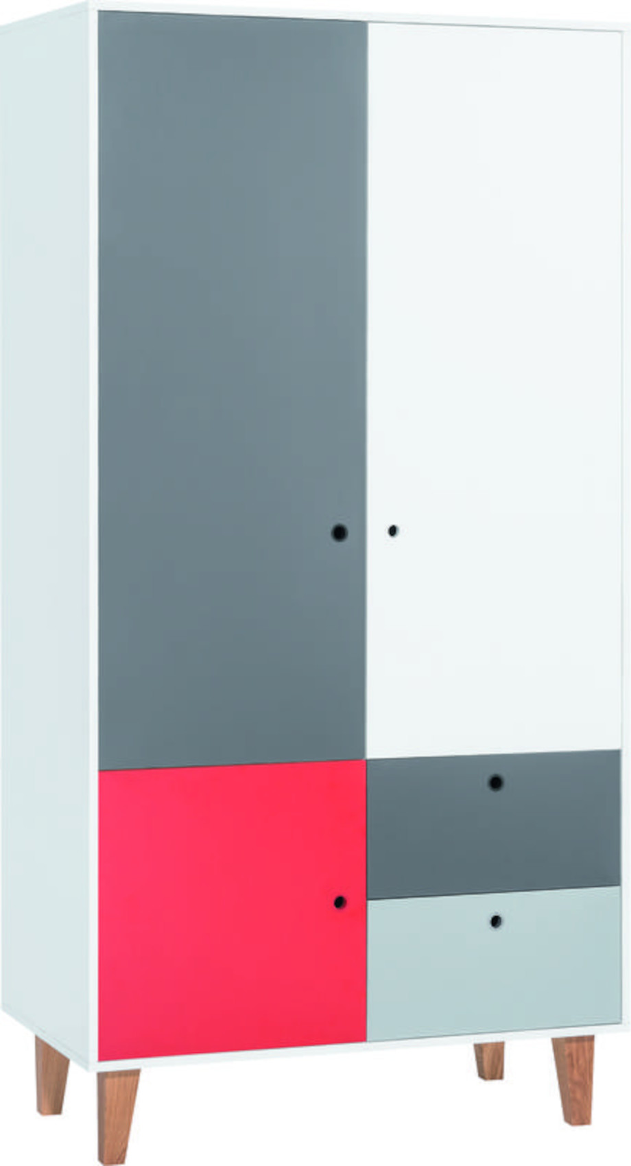 Moderní šatní skříň Concept 2D vás zaujme svým jedinečným designem. Je vyrobena z kvalitního lamina o síle 16 mm, které je odolné vůči nečistotám a poškrábání. Nohy o výšce 18 cm jsou z lakovaného dubového dřeva. Základní barevnou kombinací je bílá/grafit a přední doplňkovou barvu si můžete vybrat z dalších 6 variant - šafrán, modrá, červená, dub, černá a růžová. Rukojetí je kulatý otvor se silikonovým povrchem. Dvířka i zásuvky v celém systému mají systém tichého dovírání.