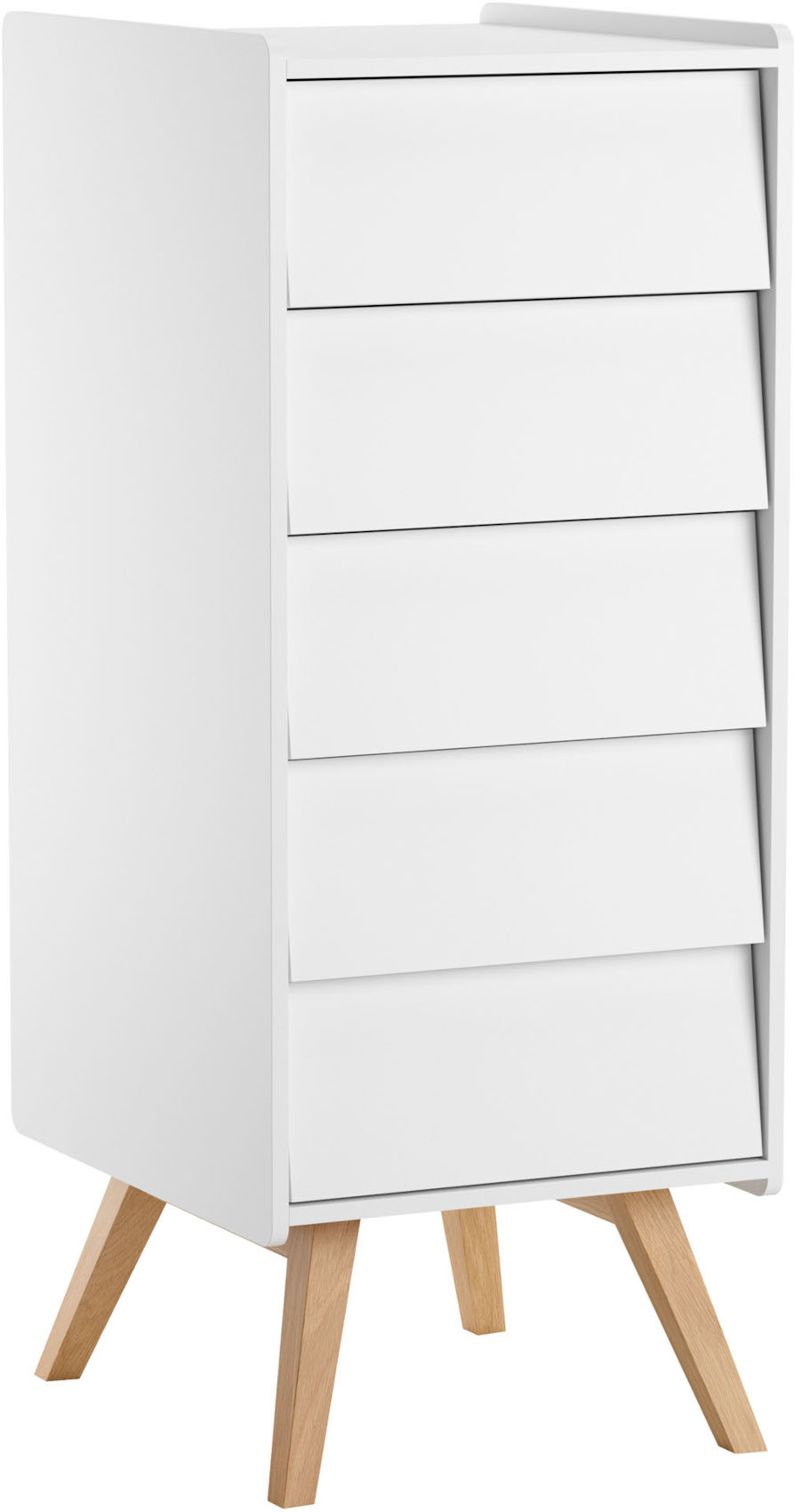 Jednoduchá bílá komoda Vintage s 5 zásuvkami vás zaujme svým jedinečným designem v retro stylu. Je vyrobena z kvalitního lamina odolného vůči poškrábání, nečistotám a vlhkosti. Úzké dlouhé nožky, které provzdušní váš prostoru a dodají nábytku nádech elegance, jsou z masivního dubového dřeva. Zásuvky mají zabudovaný jednoduchý dotykový systém otevírání - Push to open spolu se systémem tichého dovírání.