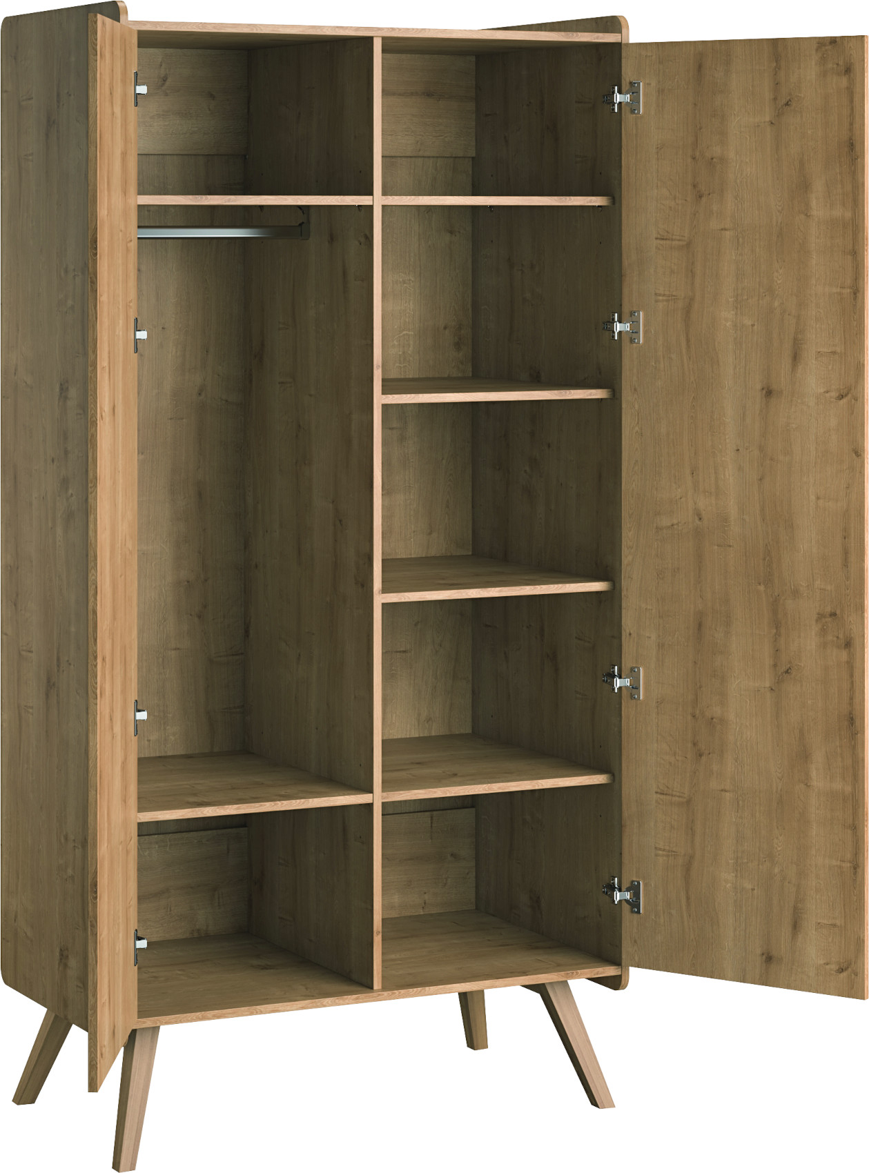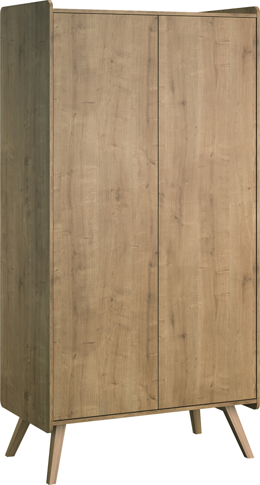 Jednoduchá šatní skříň Vintage 2D vás zaujme svým jedinečným designem v retro stylu. Je vyrobena z kvalitního lamina odolného vůči poškrábání, nečistotám a vlhkosti. Úzké dlouhé nožky, které provzdušní váš prostoru a dodají nábytku nádech elegance, jsou z masivního dubového dřeva. Dvířka mají zabudovaný jednoduchý dotykový systém otevírání - Push to open spolu se systémem tichého dovírání.