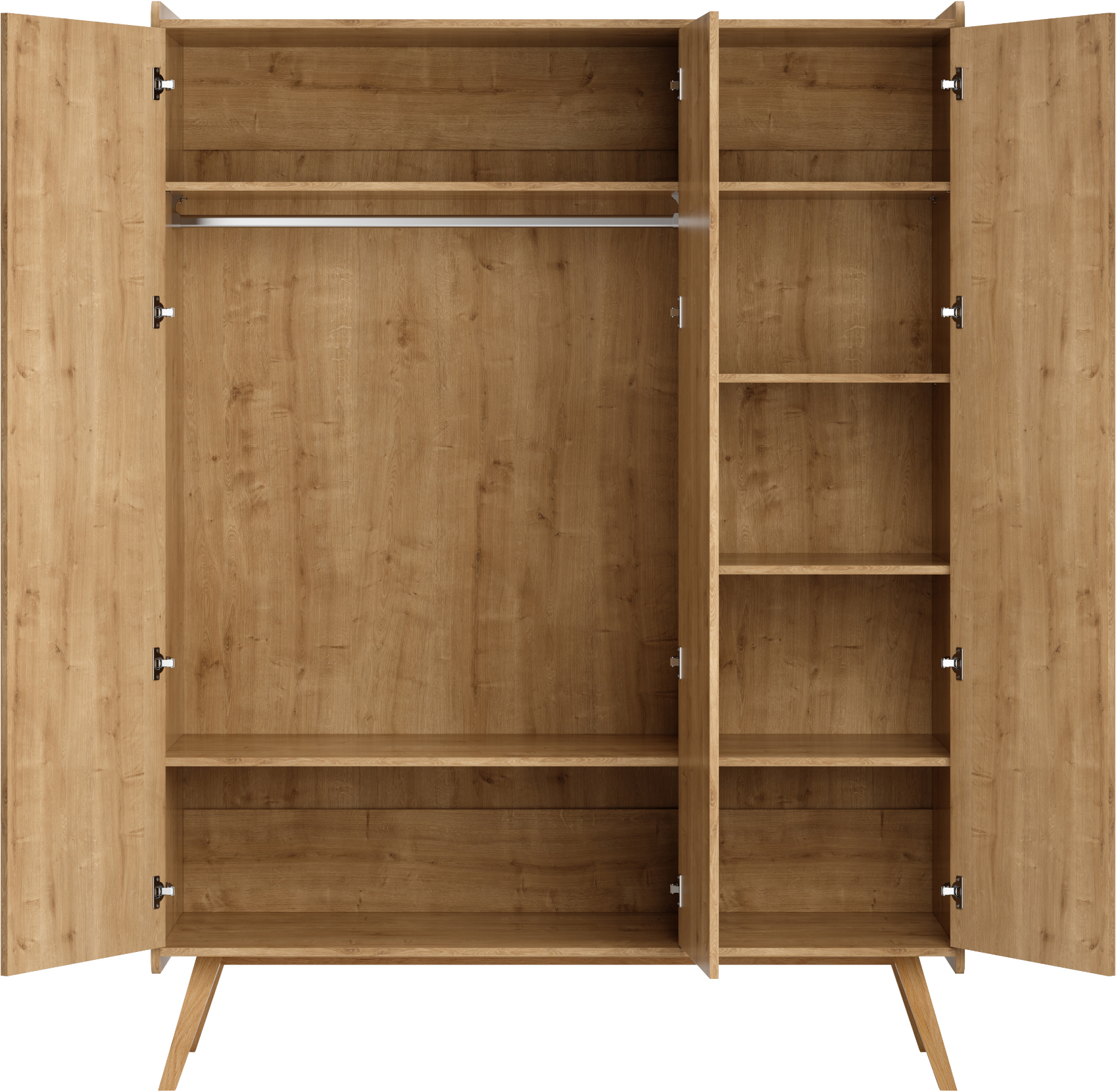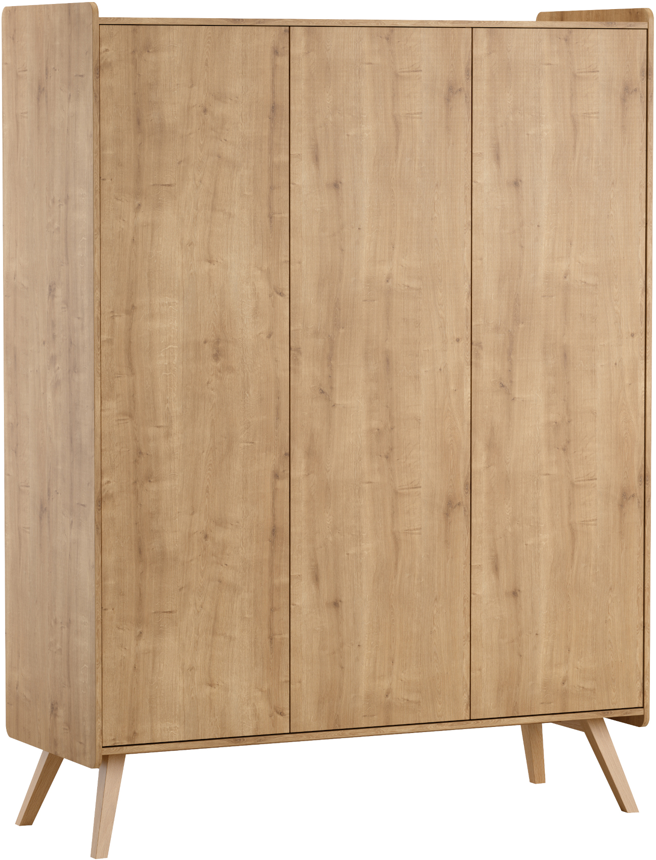 Jednoduchá šatní skříň Vintage 3D vás zaujme svým jedinečným přírodním designem v retro stylu. Je vyrobena z kvalitního lamina odolného vůči poškrábání, nečistotám a vlhkosti. Úzké dlouhé nožky, které provzdušní váš prostoru a dodají nábytku nádech elegance, jsou z masivního dubového dřeva. Dvířka mají zabudovaný jednoduchý dotykový systém otevírání - Push to open spolu se systémem tichého dovírání.