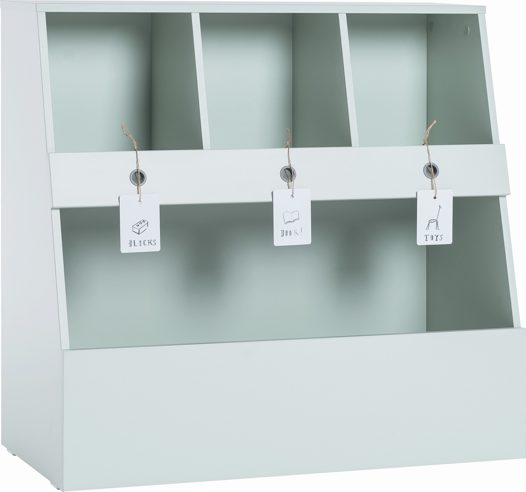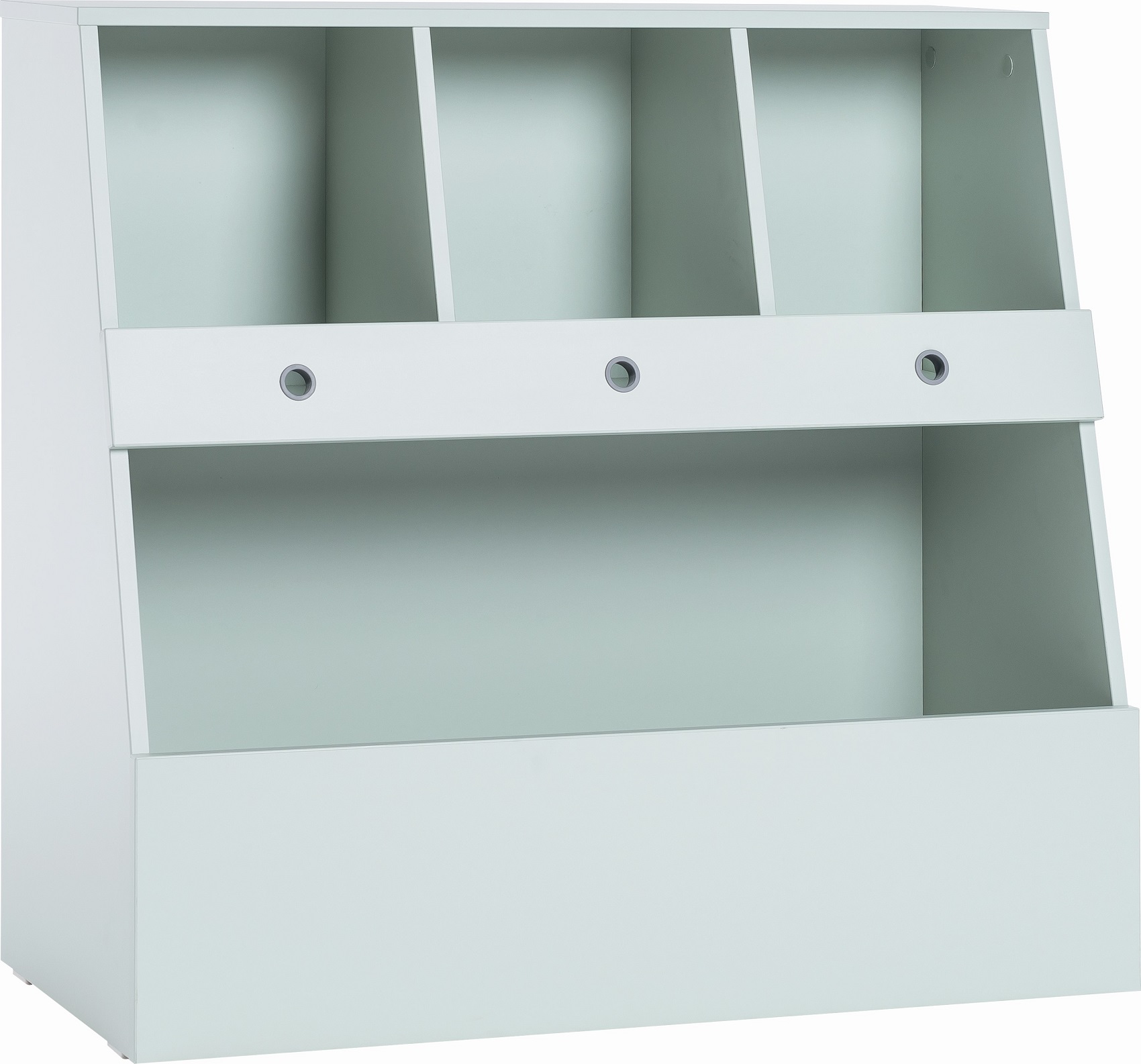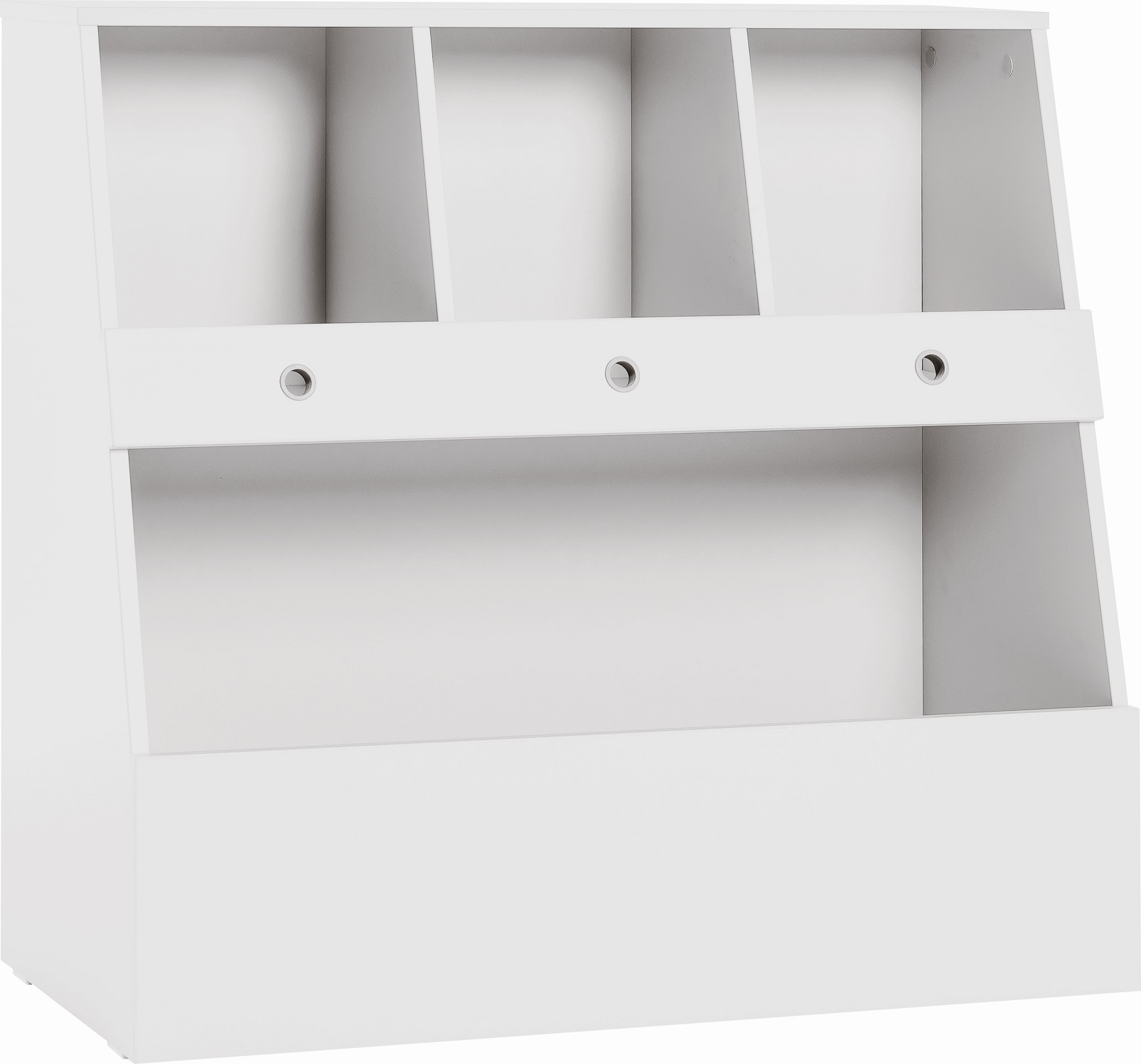 V horní části regálu jsou 3 malé otevřené niky, do kterých můžete vystavit oblíbené dětské knihy nebo menší hračky. Pod nimi je 1 velká prostorná police k uložení větších hraček nebo her.