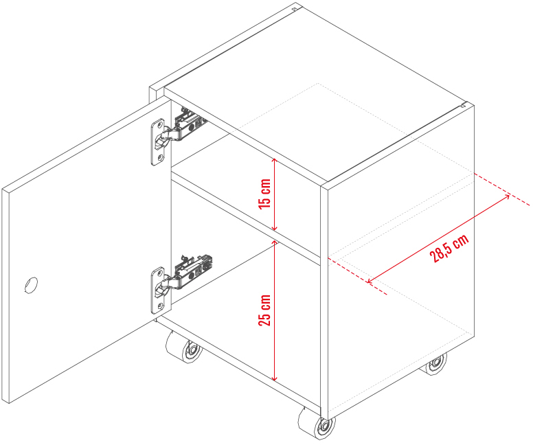 Za dvířky je vložena 1 lakovaná police. Horní část je vyvýšené, která chrání různé předměty před spadnutím.