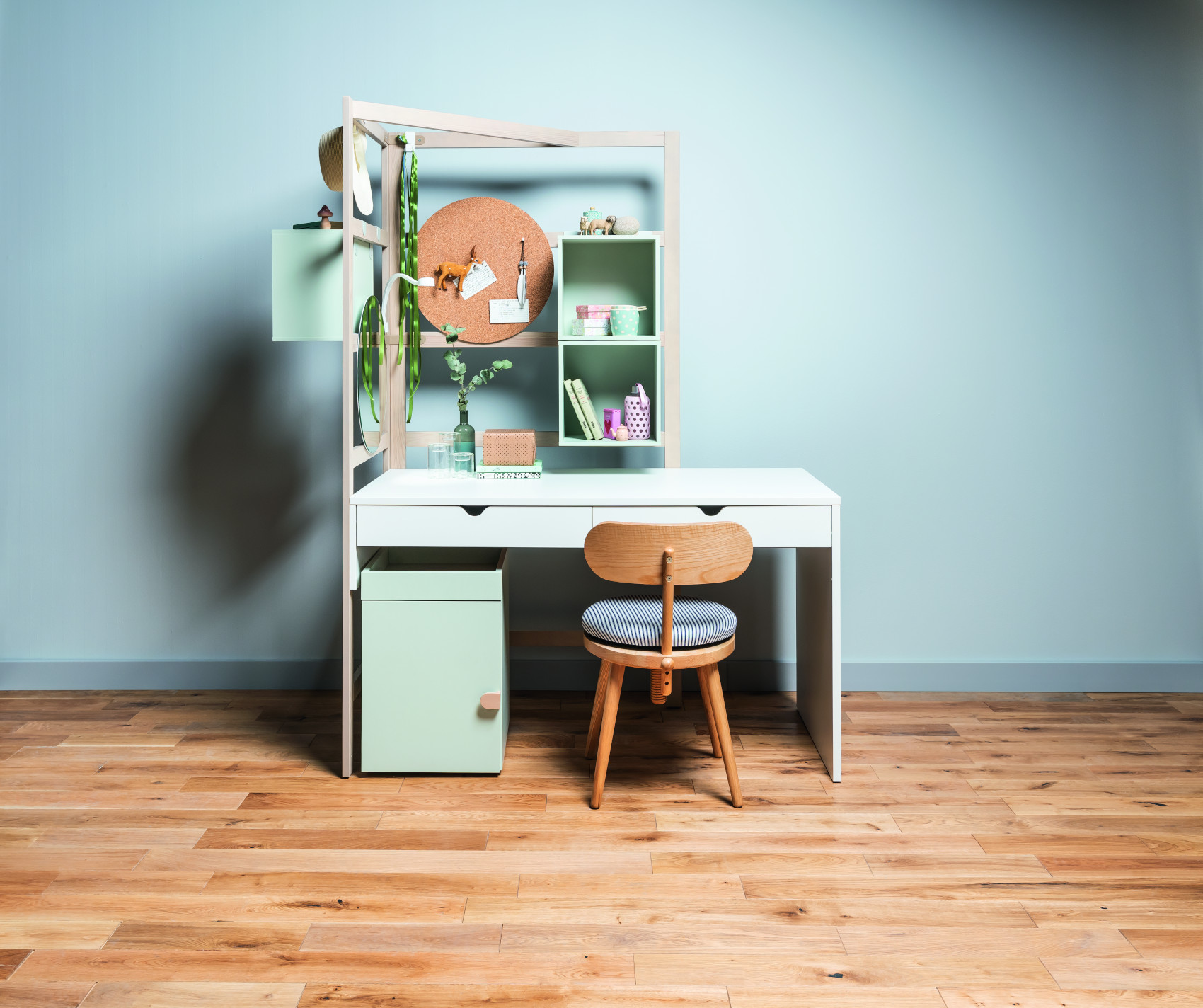 Závěsná skříňka Stige vás zaujme svým jednoduchým a přírodním designem. Je vyrobena z kvalitního lamina o síle 12 mm, které je odolné vůči poškrábání a nečistotám. Háčky jsou z práškově lakovaného kovu. Nabízíme vám 3 barevné varianty - borovice, modrá a pistáciová.