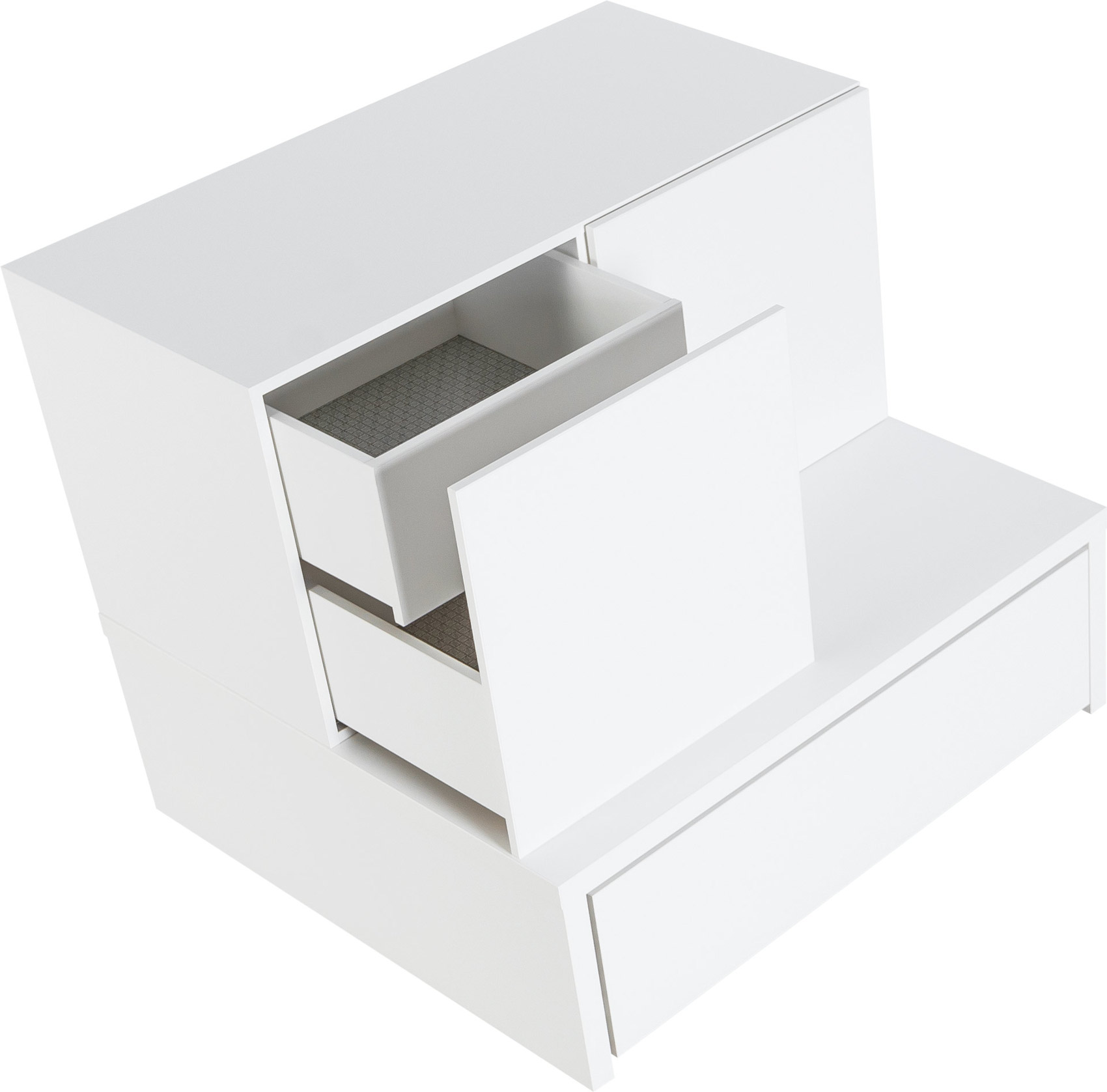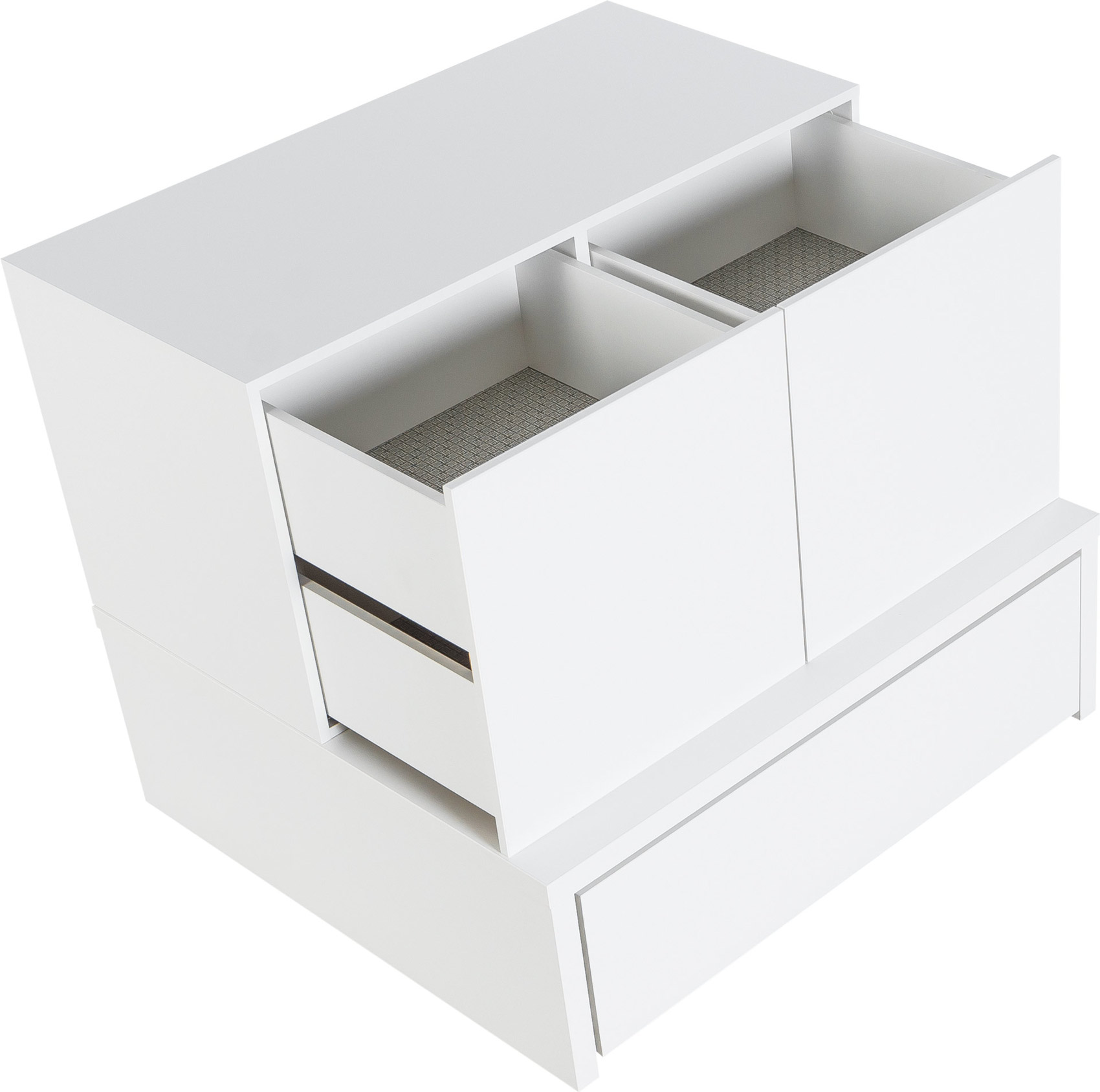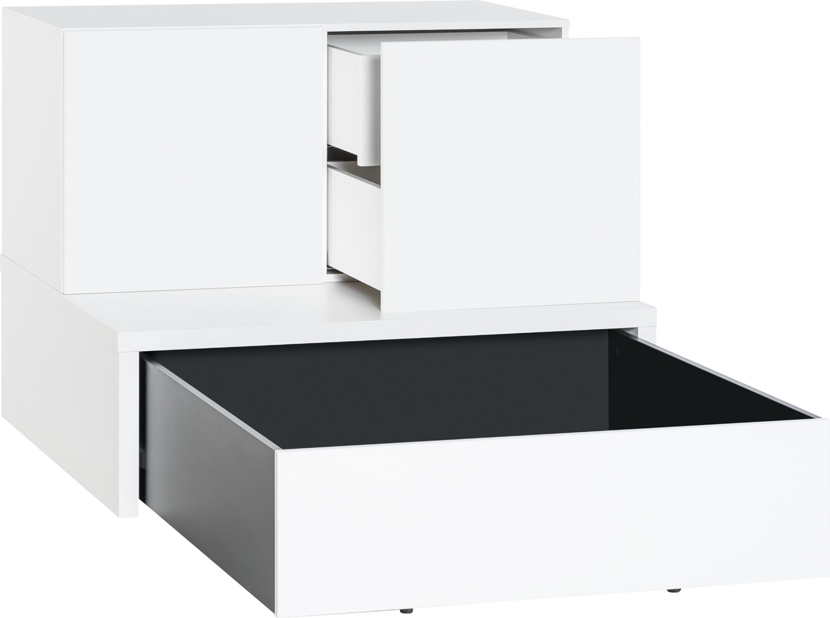 Ve vnitřním prostoru skříňky jsou vloženy 2 police s libovolně nastavitelnou výškou. Součástí podesty je zásuvka k uložení ložního prádla nebo přikrývky. Zásuvka je oboustranná, tudíž si lze zvolit barevnou variantu přední strany - černá nebo bílá.