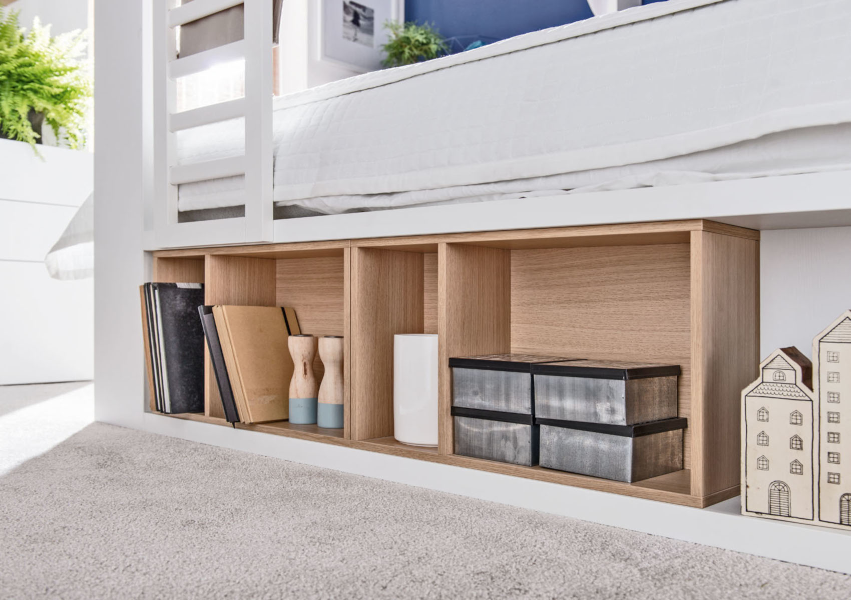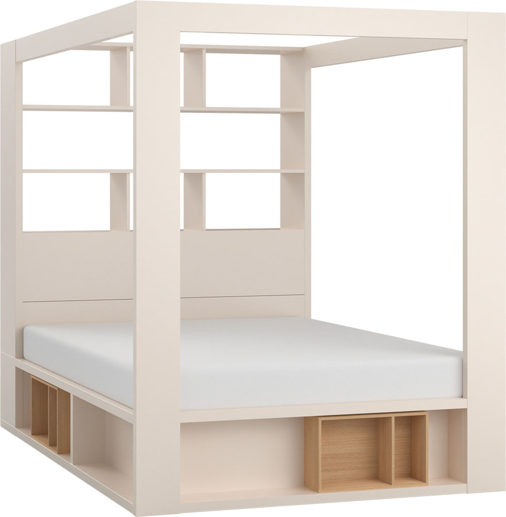 Zadní čelo postele je navrženo ve formě regálu s policemi k vystavení vašich oblíbených knih nebo rámečků s fotografiemi. Jednotlivé niky lze vyplnit také úložnými schránkami, které naleznete pod názvem úložná schránka 4You velká, úložná schránka 4You malá a úložná schránka k posteli 4You. Na baldachýn, připevněný k posteli, můžete zavěsit látku a vytvořit si tak útulný a intimní prostor ke spánku. Součástí je boční žebřík, na který lze pověsit látkové organizéry nebo květiny.