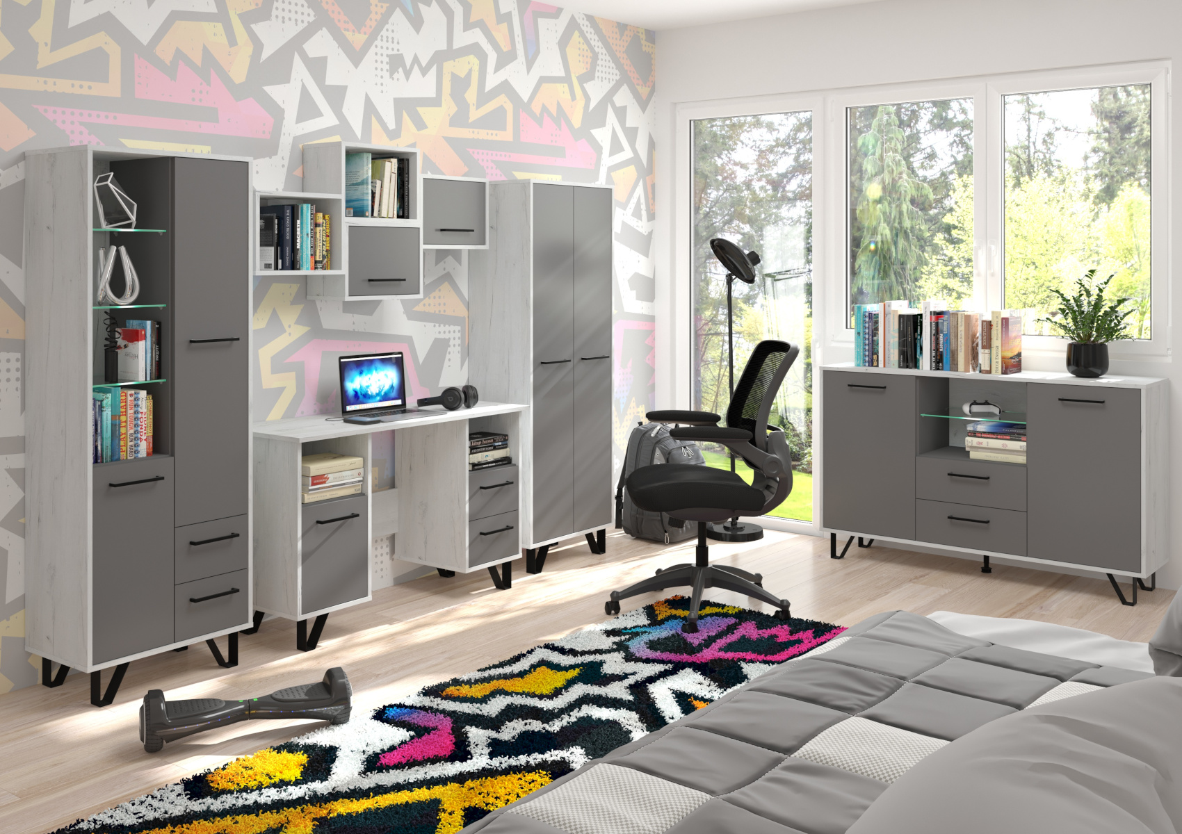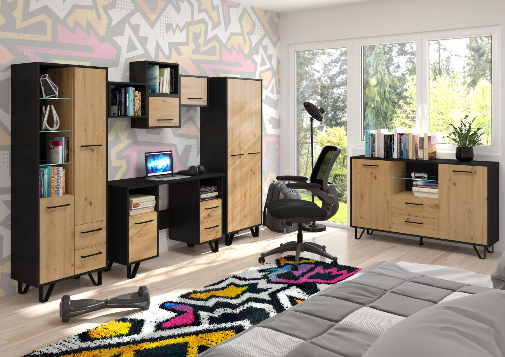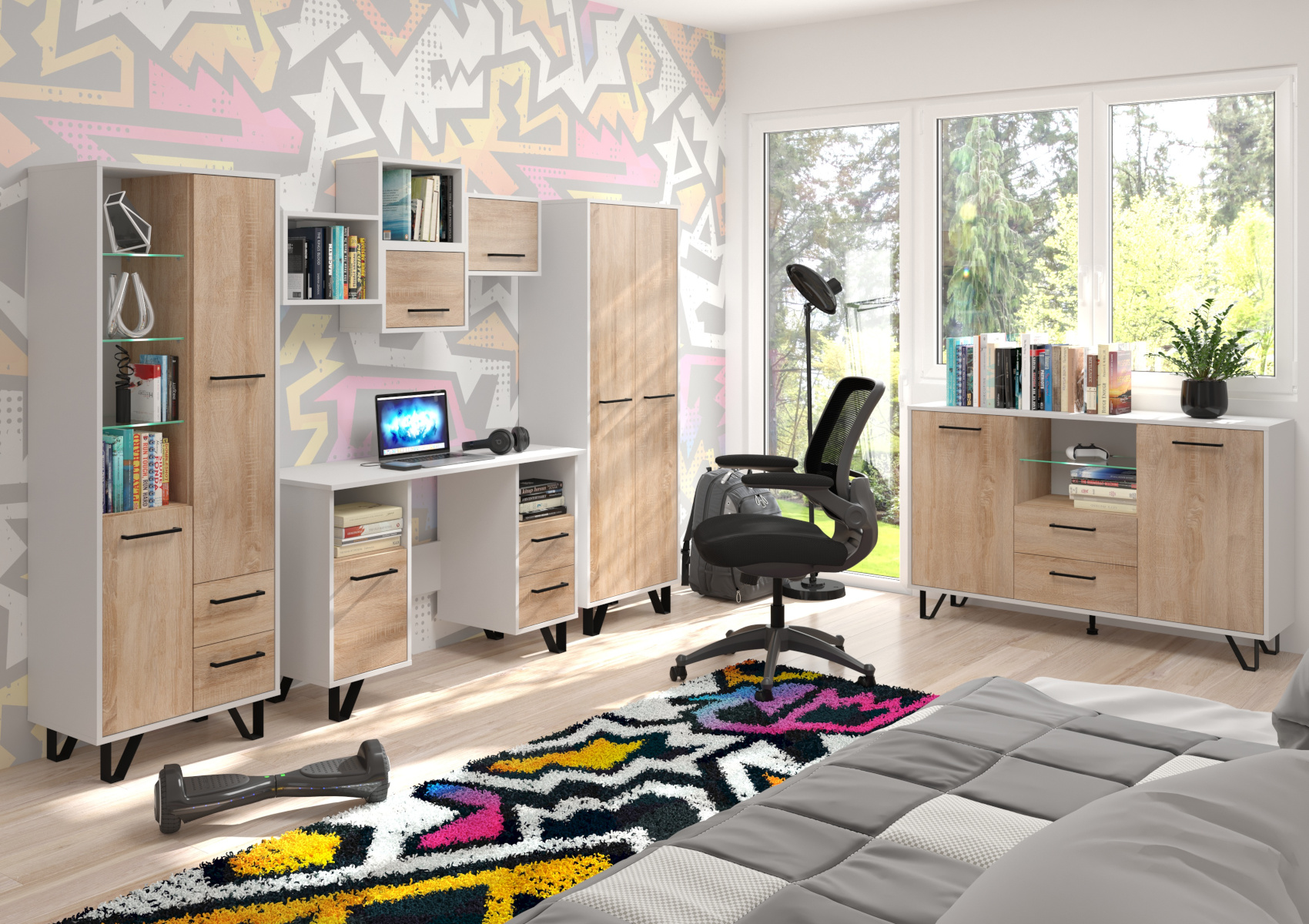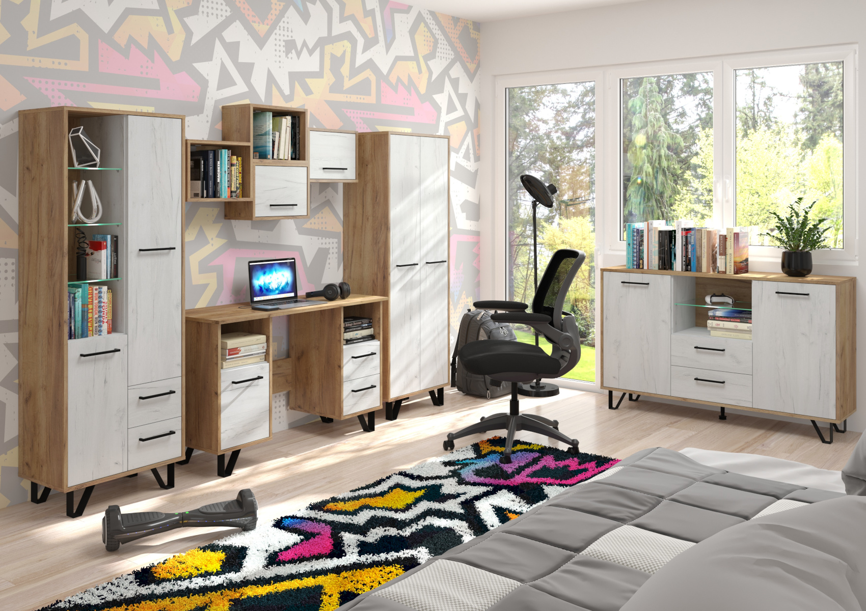 Studentský pokoj Boss vás zaujme svým moderním elegantním designem a barevným provedením s přírodními detaily. Jednotlivé komodity jsou vyrobeny z kvalitních lamino desek o síle 16 mm. Desky mají ABS hranění, které zvyšuje odolnost pro odštípnutí hran. Součástí zásuvek a dvířek jsou jednoduché kovové úchyty a zároveň mají zabudovaný systém tichého dovírání. Nábytek stojí na kovových nožkách, které provzdušní váš interiér. Nabízíme vám několik barevných variant.