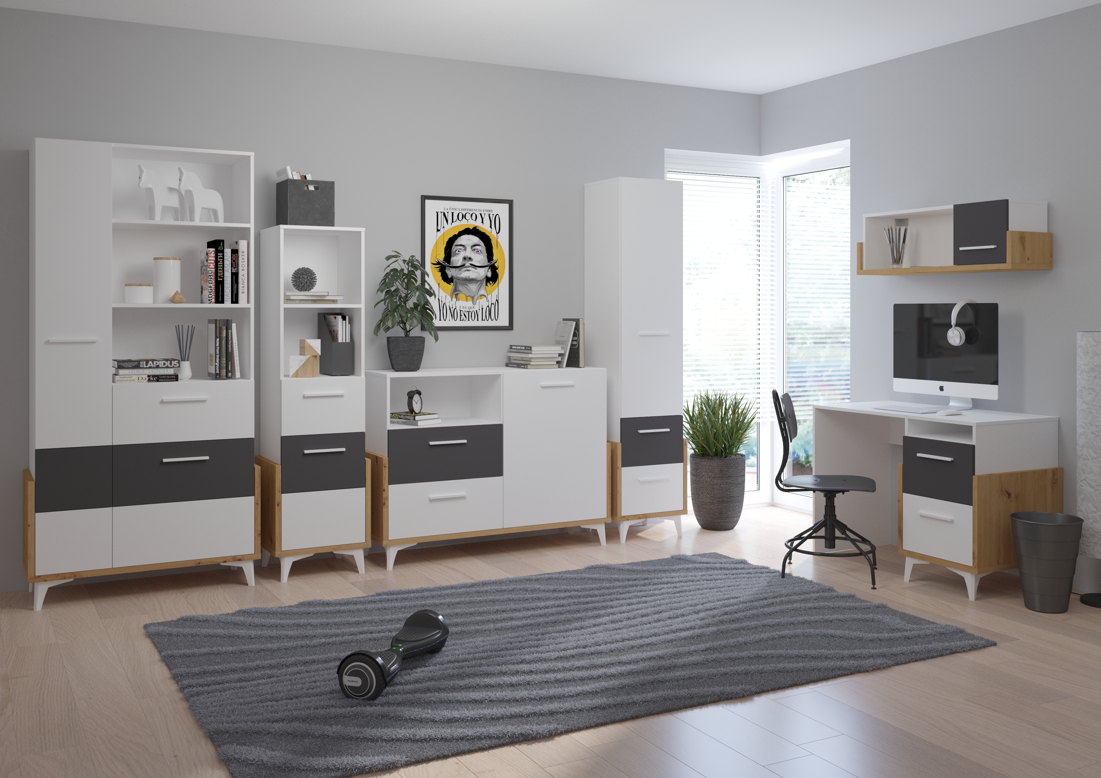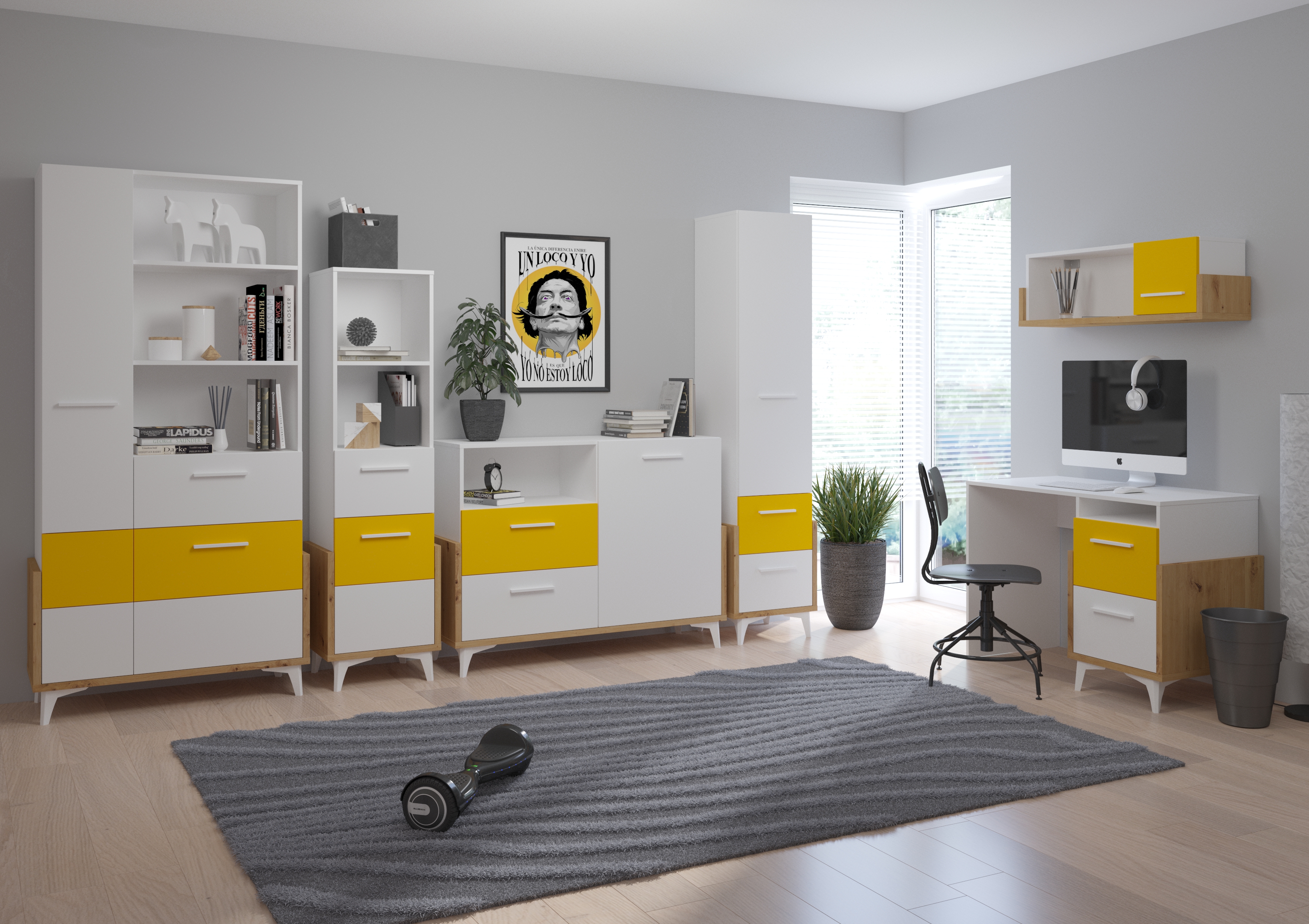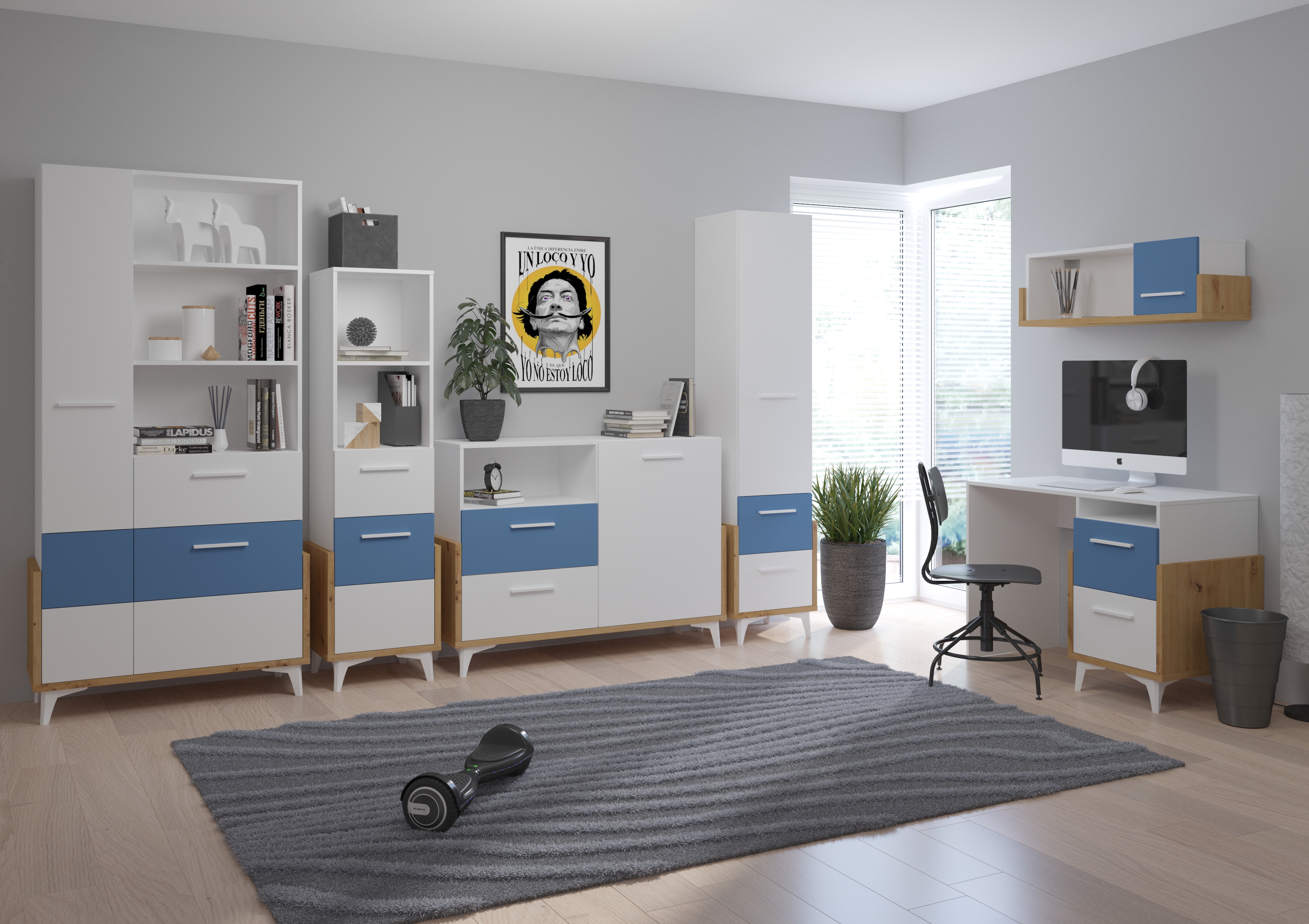 Studentský pokoj HEY 2 obsahuje - skříňku Hey 02, psací stůl Hey 03, komodu Hey 09, regál Hey 13, regál Hey 18 a závěsnou skříňku Hey 22.