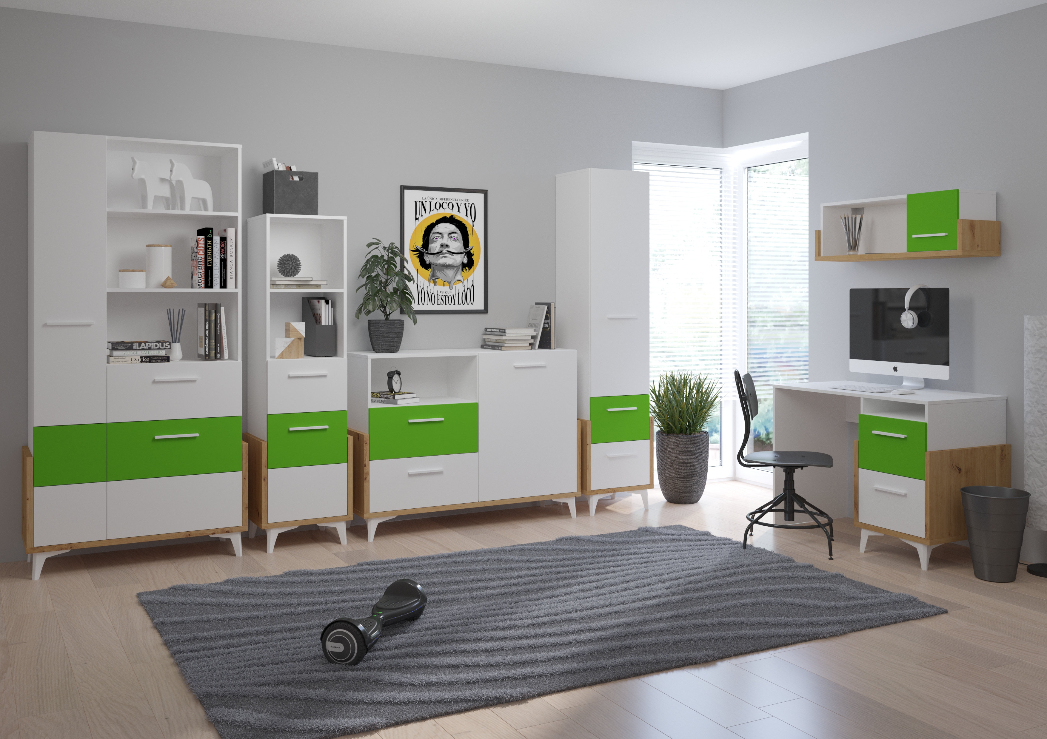 Studentský pokoj Hey 2 patří ke kolekci nábytku HEY, který je nadčasový a díky svému modernímu designu vhodný do dětských a studentských pokojů. Produkty jsou vyrobené z kvalitního lamina s ABS úpravou hran, čímž je minimalizované riziko mechanického poškození či odštípnutí hrany. Korpusy mají sílu 25 mm, fronty a ostatní části mají sílu 16 mm. Dvířka i zásuvky jsou vybaveny systémem tichého dovírání. Výrazným prvkem systému jsou bílé 12 cm vysoké nožky z tvrzeného plastu, které jistě při úklidu oceníte. Nabízíme vám výběr z několika barevných dekorů.