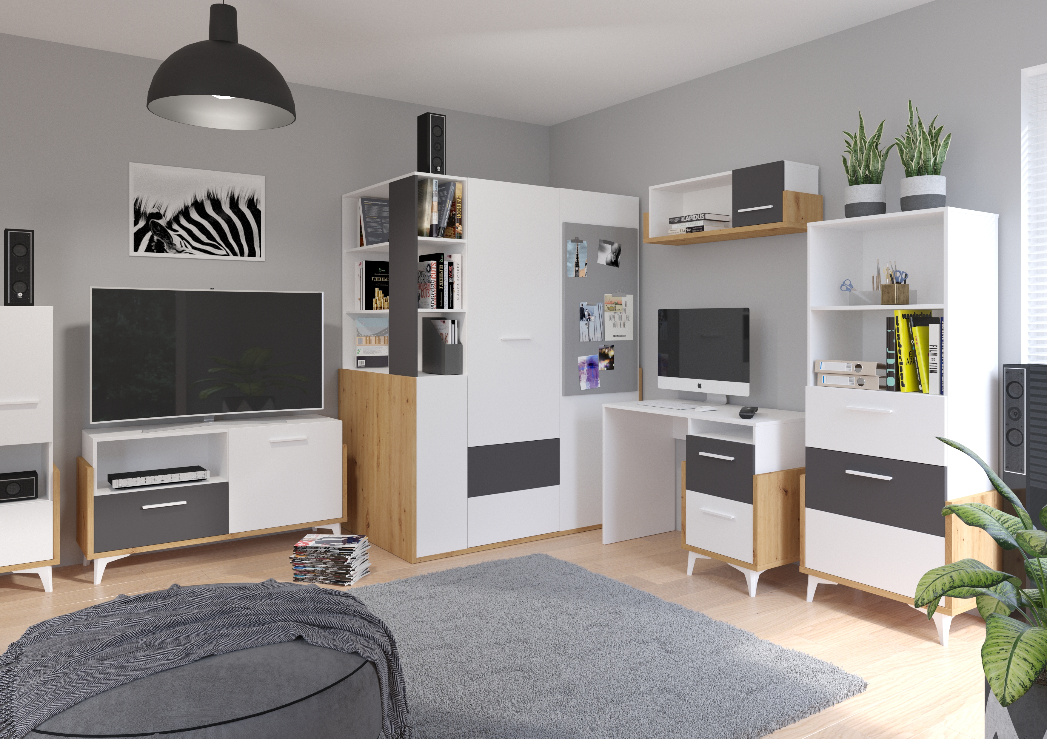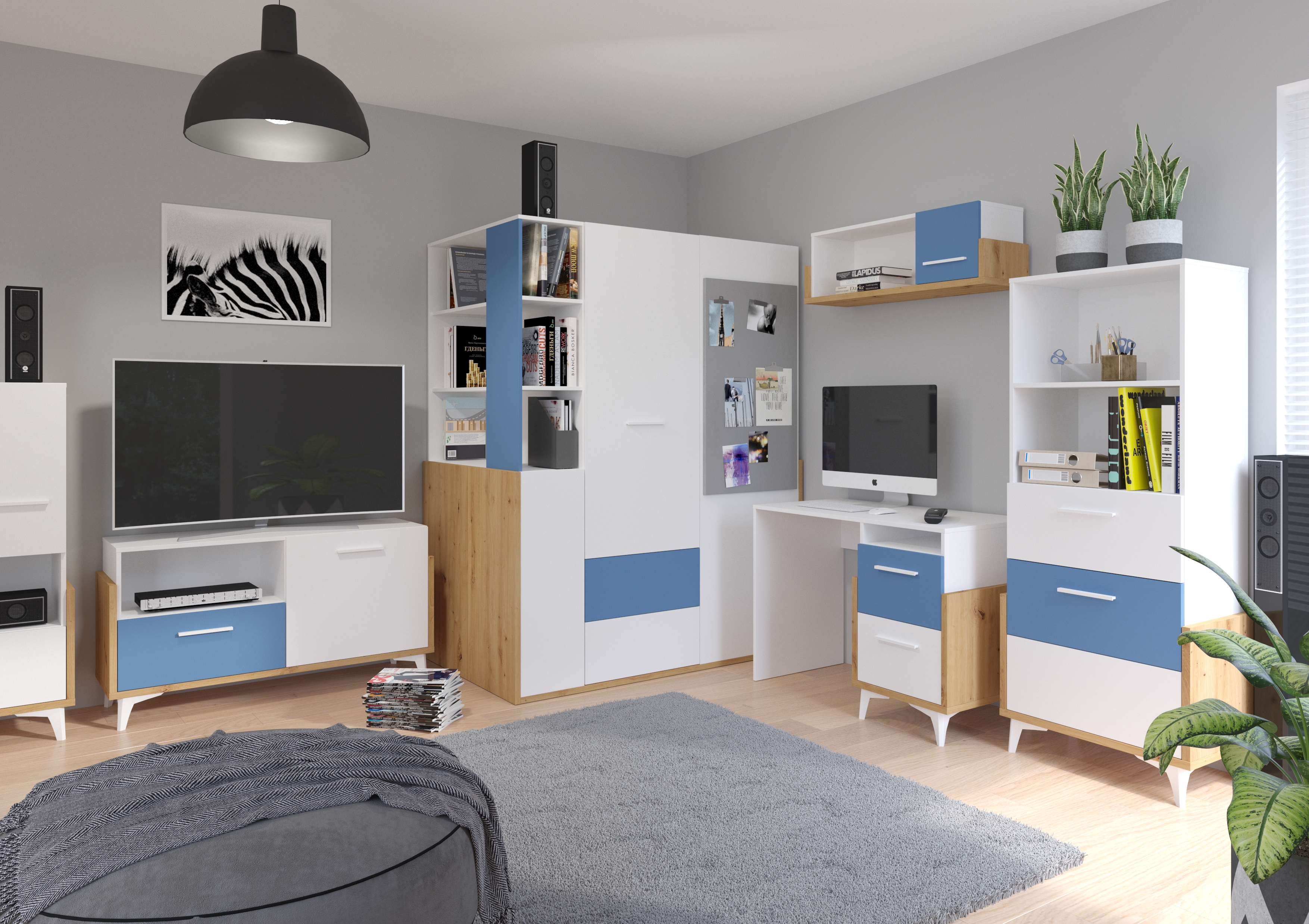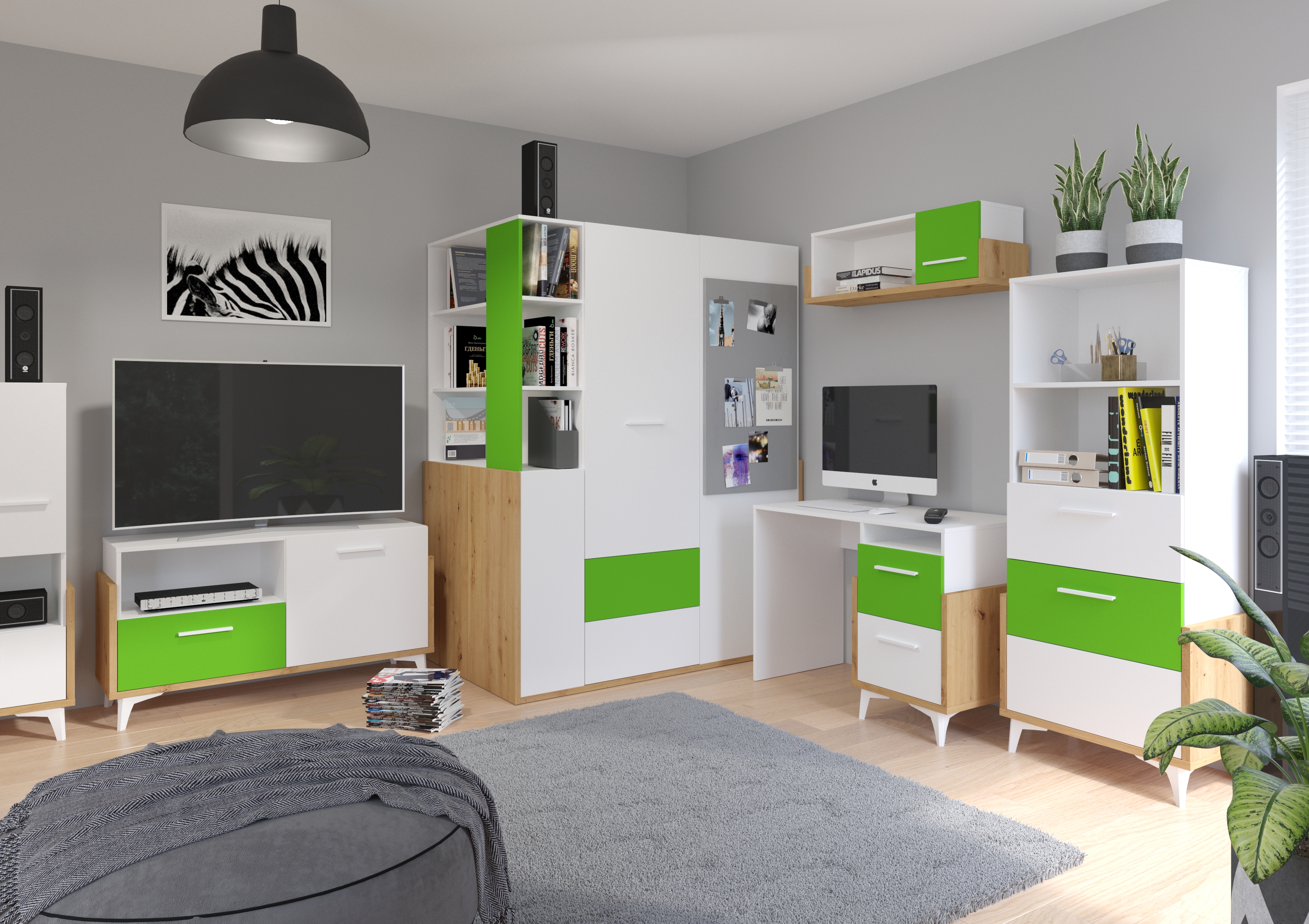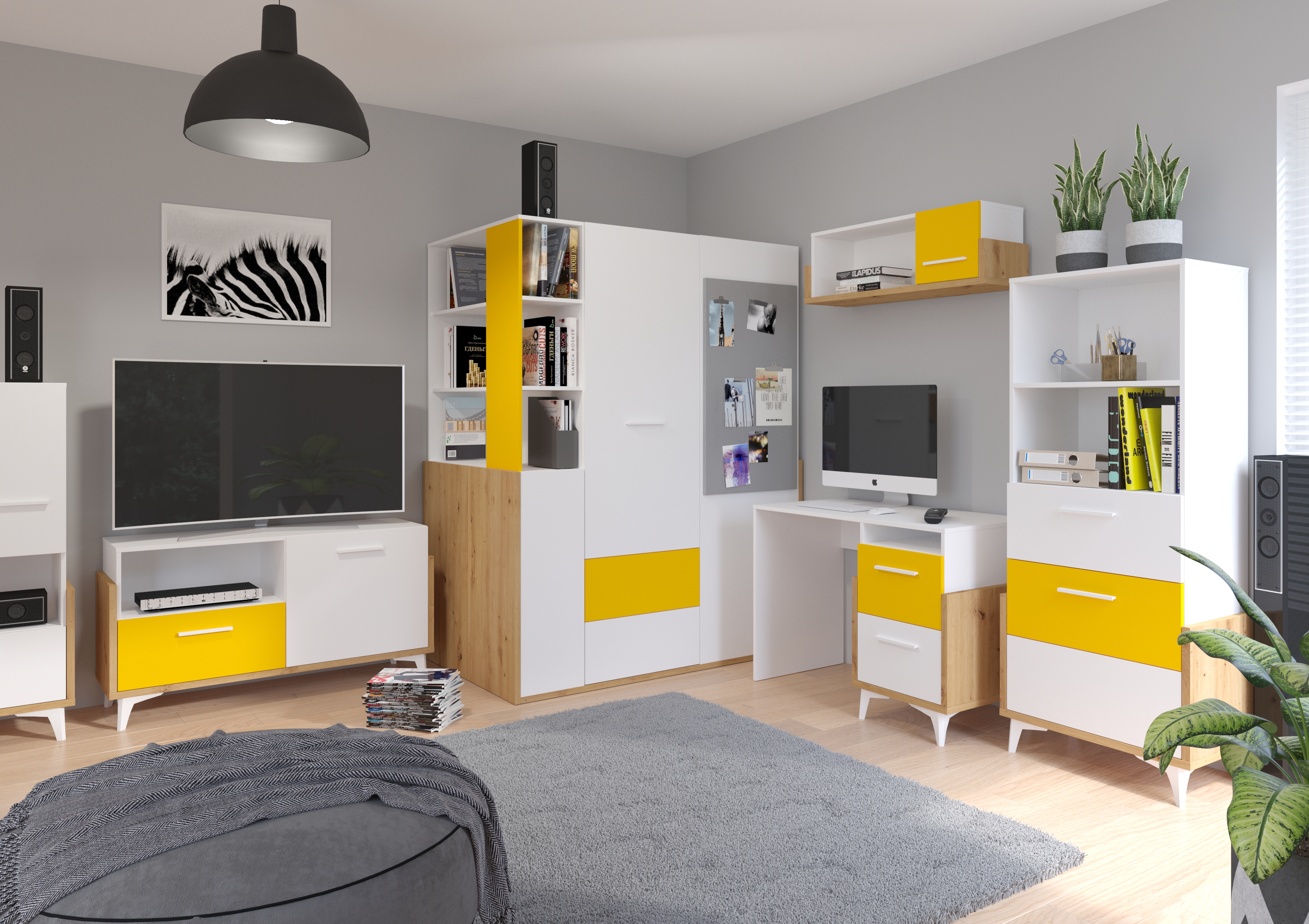 Studentský pokoj HEY 4 obsahuje - psací stůl Hey 03, komodu Hey 08, regál Hey 16, skříň Hey 21 a závěsnou skříňku Hey 22.