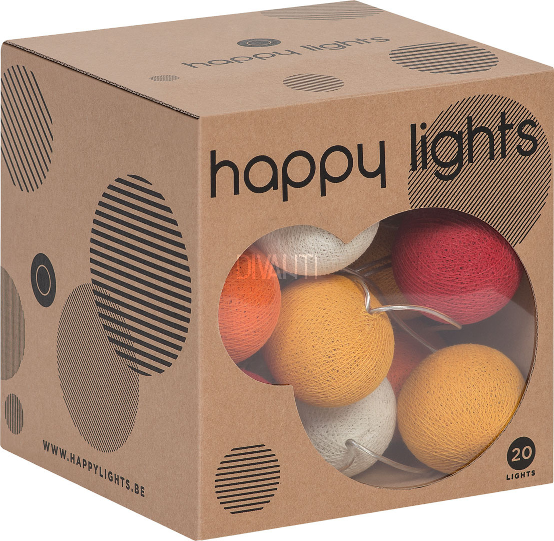 Světýlka Happy Lights pochází z rukou návrhářů dílný Vox. Tito návrháři cílili na design, díky němuž se světla hodí téměr do všech prostorů. Jsou vyrobena z bavlněné příze. V sadě naleznete 20 kuliček, které v sobě mají zabudované LED osvětlení. Průměr jednotlivých kuliček je 6,5cm. Délka dvojité šňůry se světly je 150cm, celková délka kabeláže pak je 290cm. Světýlka Happy Lights Vám nabízí možnost jakéhokoliv uspořádání, ať už je zavěsíte okolo postele, na komodu, necháte je naaranžovány na zemi, na prádelníku či zvolíte jiný způsob, vždy Vám nabídnou teplé světlo, které bude ve Vašem interiéru tvořit jedinečnou atmosféru. Doporučujeme je do dětských pokojů, studentských pokojů, ložnic, obývacích pokojů, pokojů pro hosty či do jakýchkoliv jiných místností, všude budou vypadat krásně!