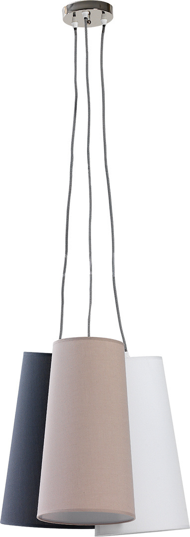 Závěsná lampa Triple pochází z rukou návrhářů dílný Vox. Tito návrháři cílili na design, díky němuž se lampa hodí téměr do všech prostorů. Je vyrobena ze tří nejoblíbenějších barev: z bílé, tmavě šedé a černé. Díky těmto barvám ji můžete Maximální příkon je 40 W, držák žárovky nese označení E14. Díky třem stínidlům Vám lampa nabízí třikrát více světla, než běžná žárovka. Průměr stínidla je 20 cm, vrchol má vždy 16cm. Lampa je ideálním pomocníkem do pracoven, studentských pokojů či kanceláří.