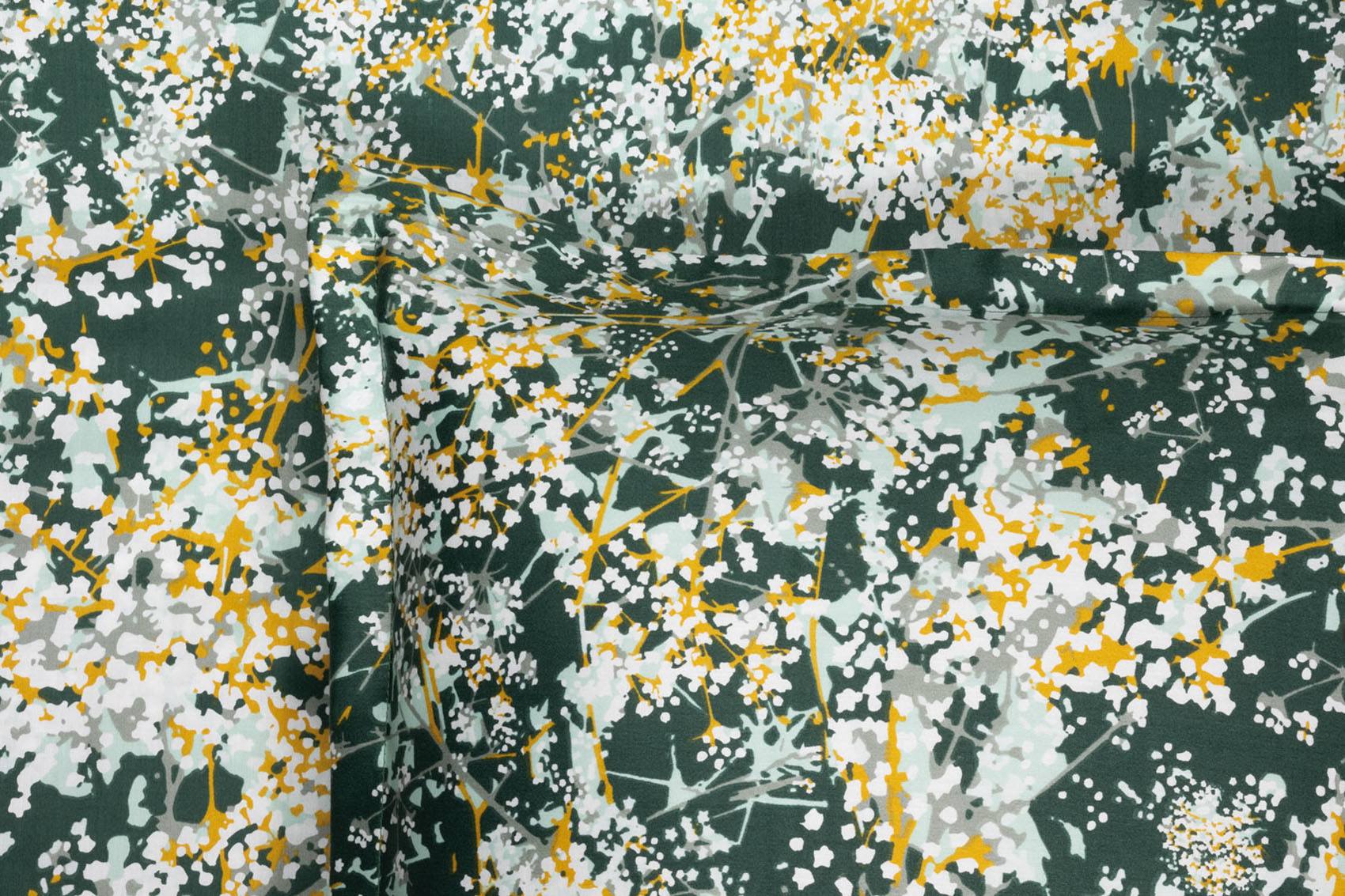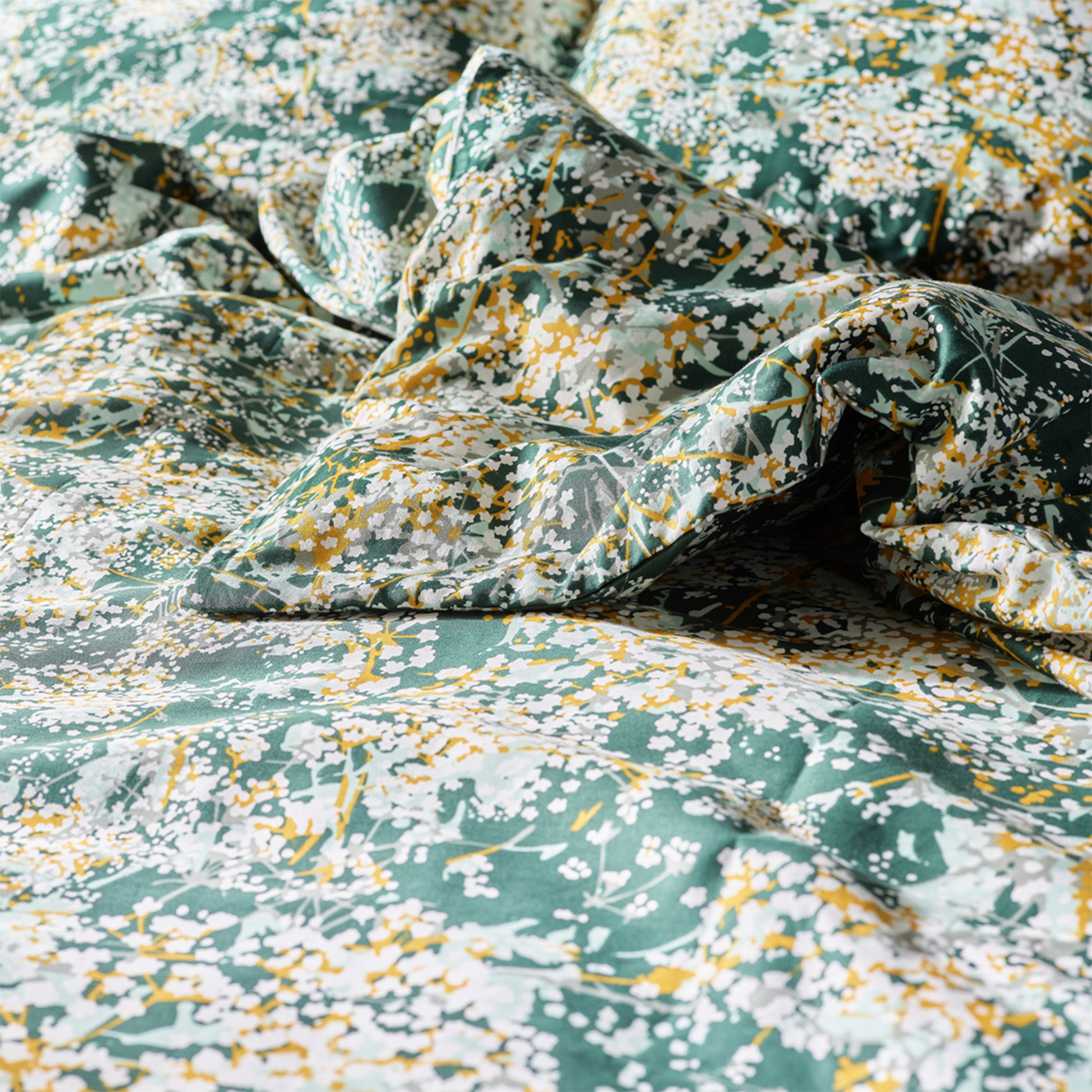 Květinové povlečení Satin Elderflower Caladon je utkané z kvalitní saténové bavlny zaručující odolnost a měkkost. Máte možnost si vybrat ze 2 rozměrů - 160x200 s 2 povlaky na polštář 50x60 cm nebo rozměr 200x200 cm s 2 povlaky na polštář 50x60 cm.