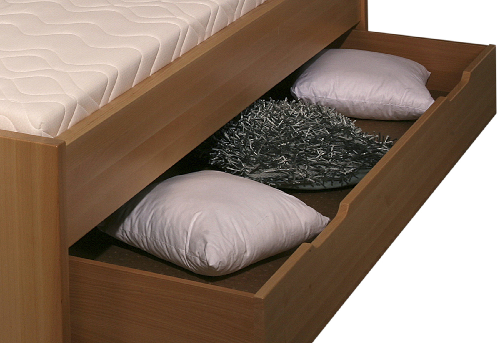 Úložná zásuvka pod postel je vyrobena z přírodní dýhy, přední část je z masivního dřeva o tloušťce 2 cm a rošt je ze smrkového dřeva. Box poslouží k uložení ložního prádla, přikrývky nebo polštářů. Na spodní straně jsou připevněna gumová kolečka ke snadnější manipulaci po místnosti.