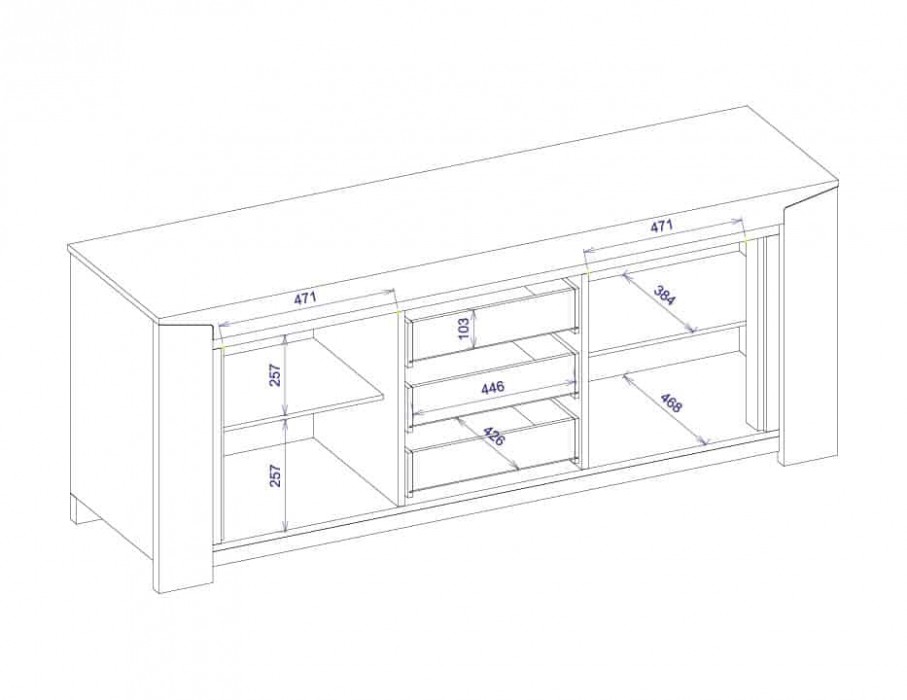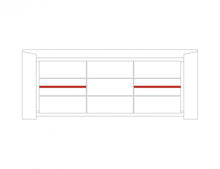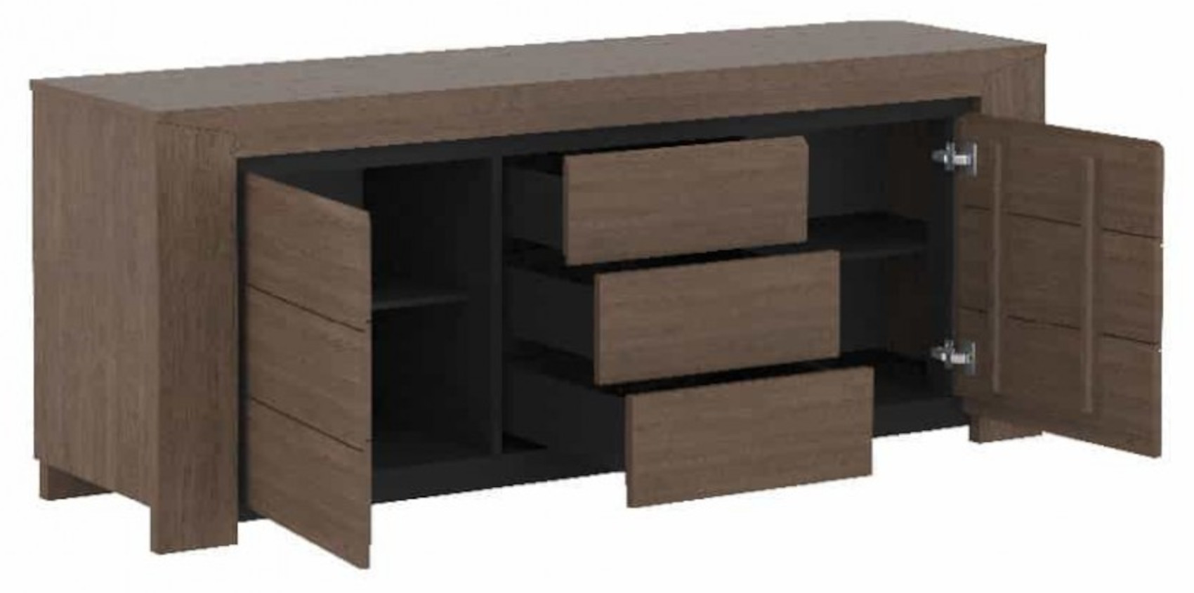 Vnitřní prostor komody je rozdělen do 3 částí. Krajní části mají samostatná dvířka a ve střední části jsou 3 zásuvky na kovových pojezdech.