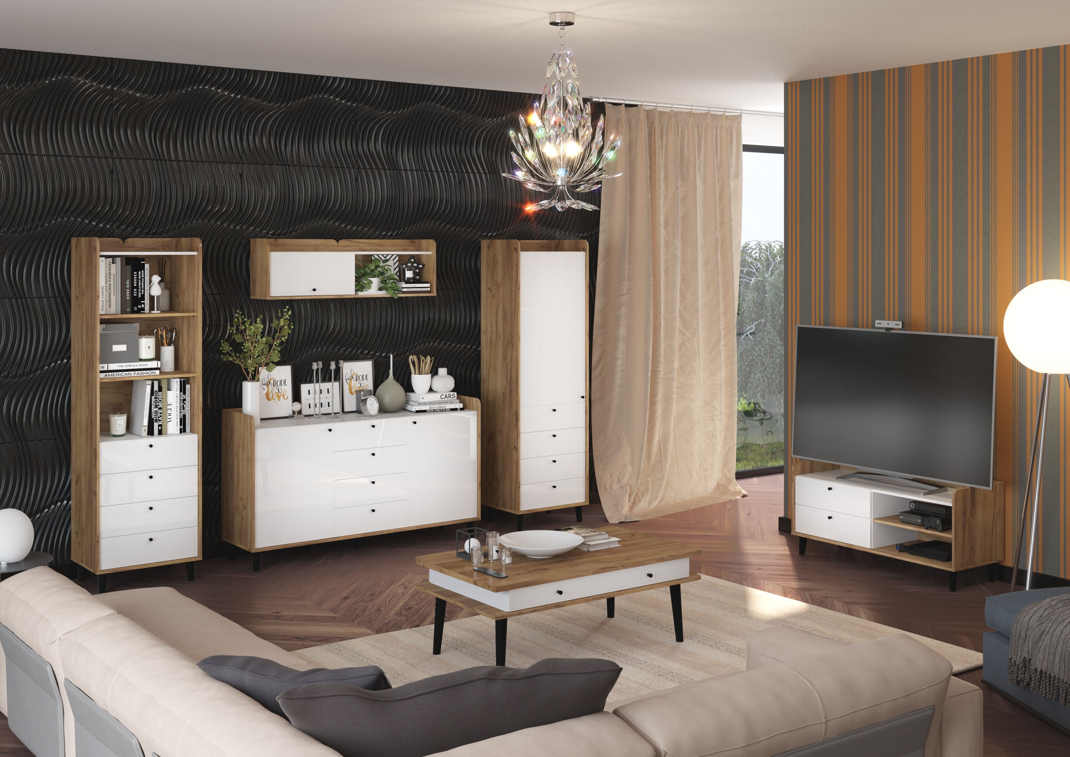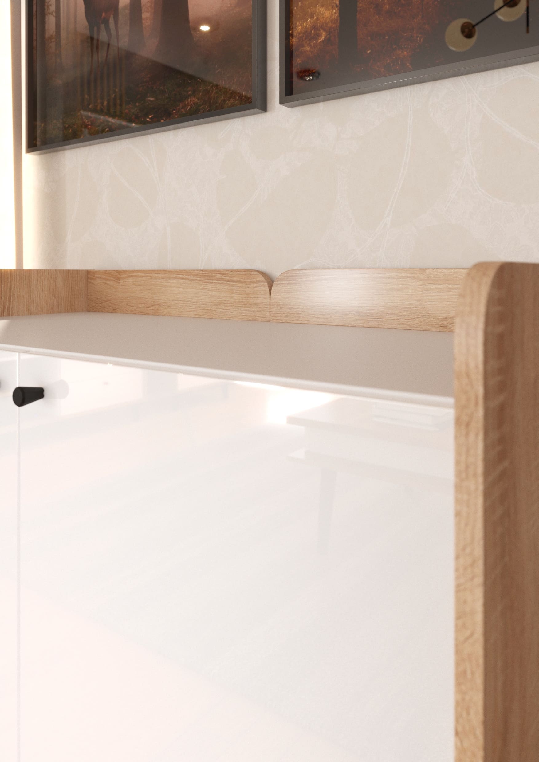 Výrazným prvkem jsou černé dřevěné nožky různých výšek, které dodají celé kolekci originální vzhled. A nejen to, vyšší nožky jsou také praktické při uklízení. Vitríny jsou vybavené kouřovými skly, které ještě více zdůrazní originální vzhled systému. Černou barvu mají i úchyty a spolu s bílým leskem na předních plochách skvěle doplňují dřevodekory reflektující moderní trendy v bydlení. S kolekcí Dolce nemůžete šlápnout vedle!