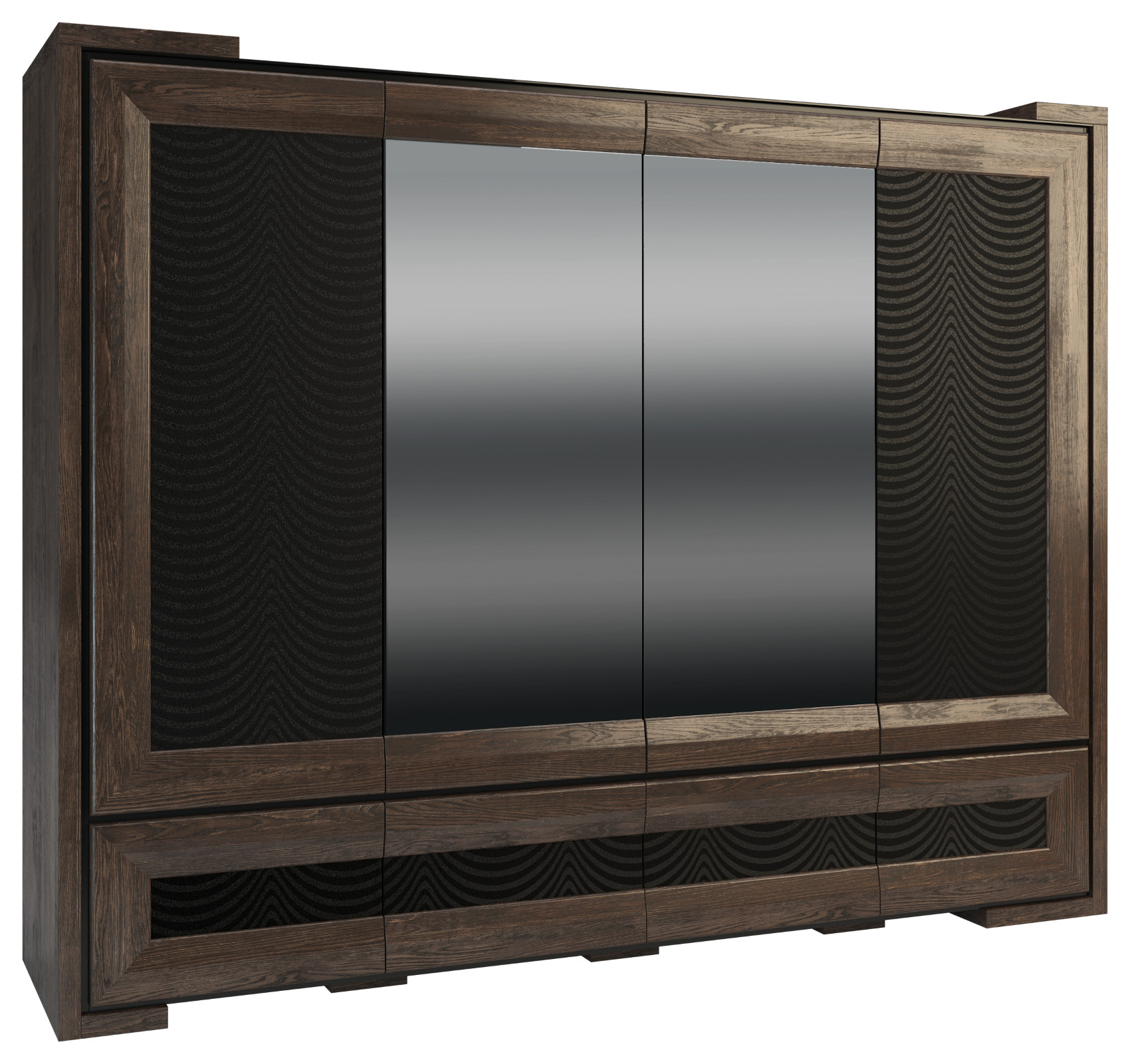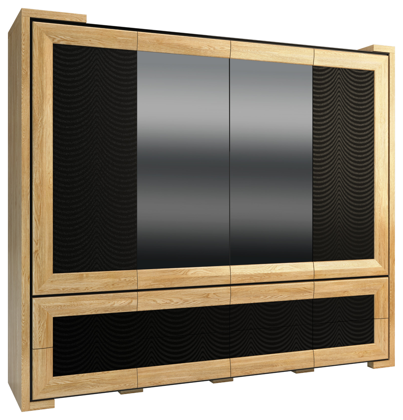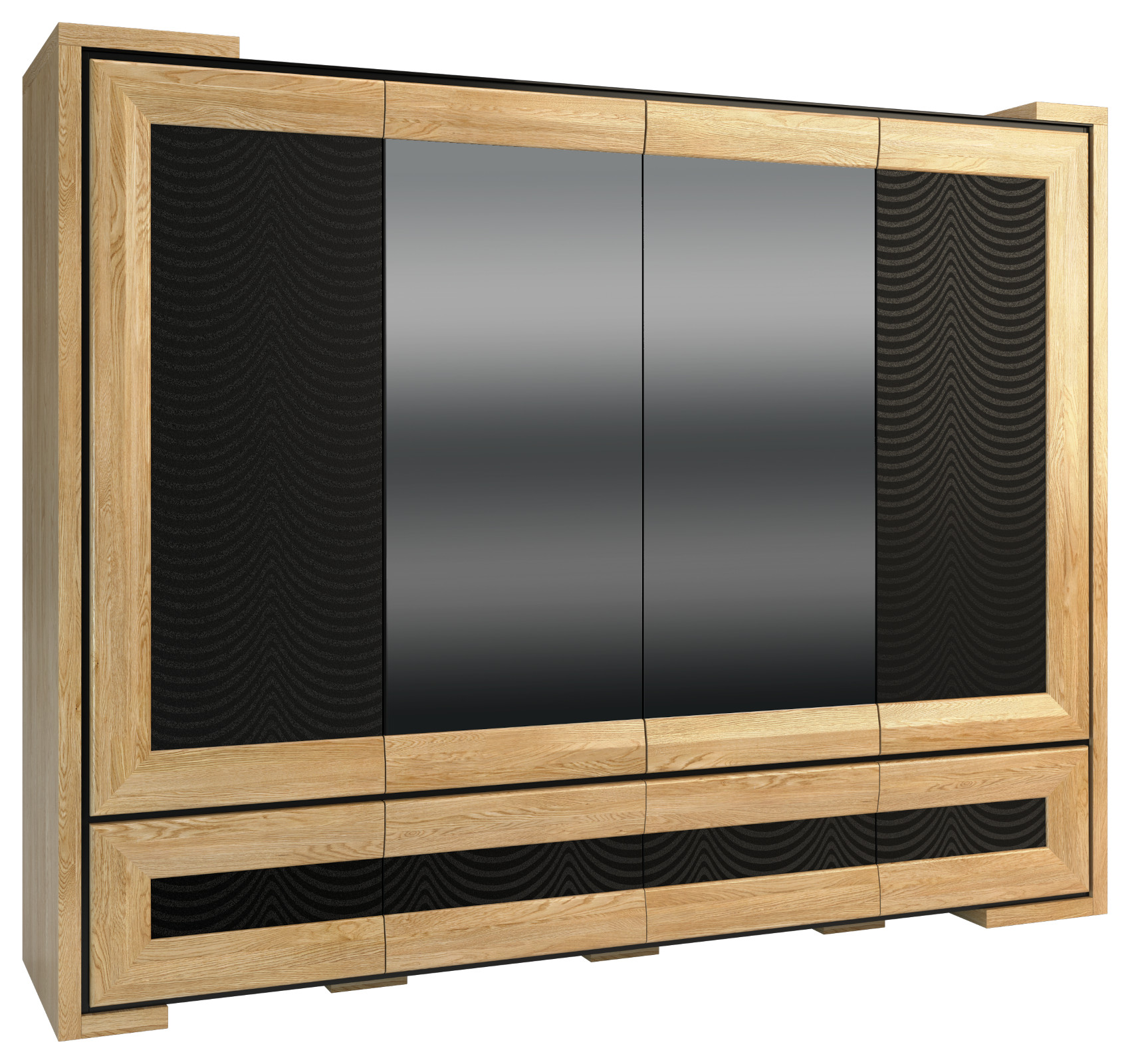 Ložnice Corino vás zaujme moderní a luxusním designem. Jedinečnými prvky jsou přesné geometrické tvary, černé ohraničení a detaily ze skla Lacobel. Jednotlivé komponenty jsou vyrobeny z masivního dubového dřeva, černého skla Lacobel a některé z nich jsou očalouněné potahovou látkou.