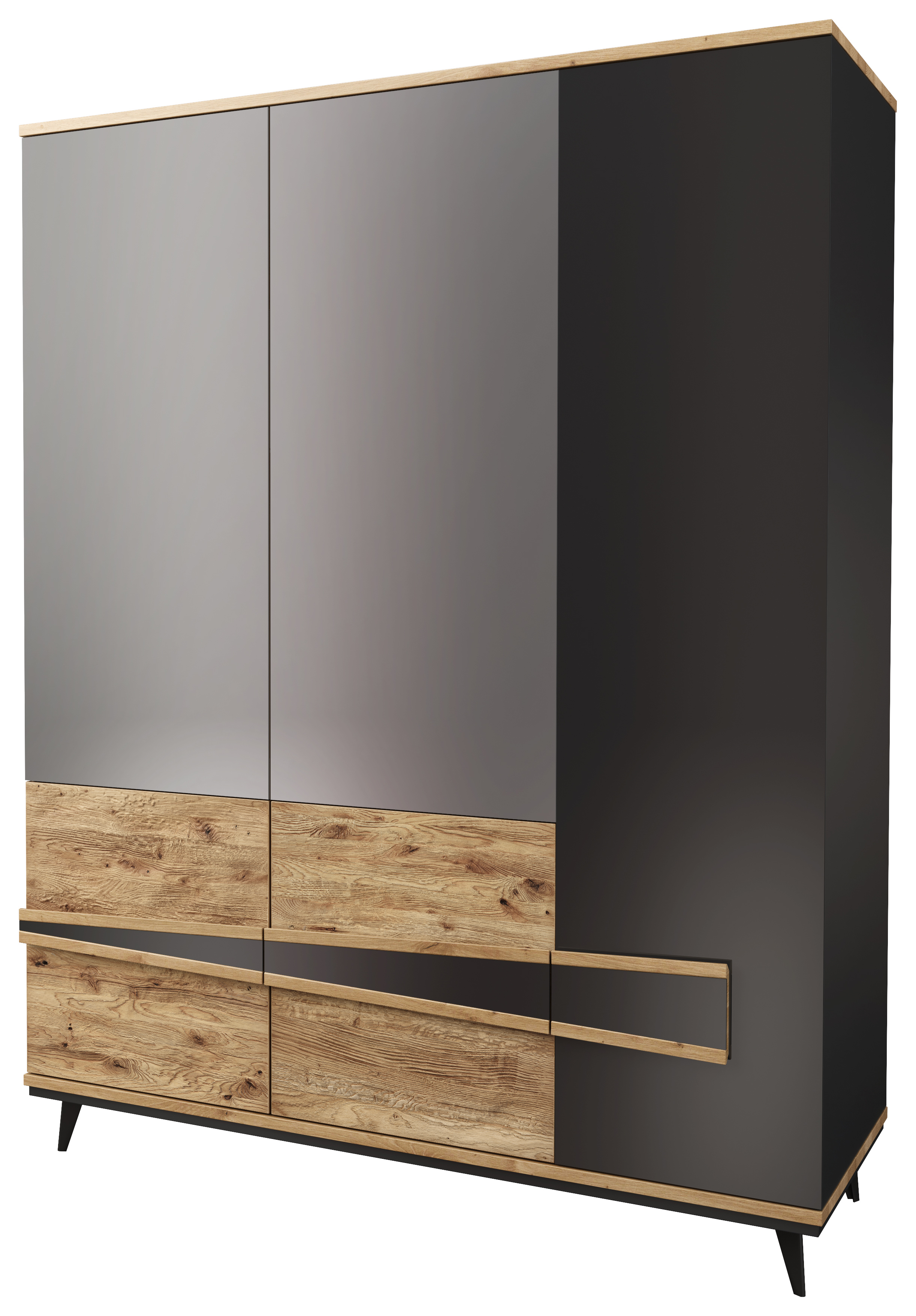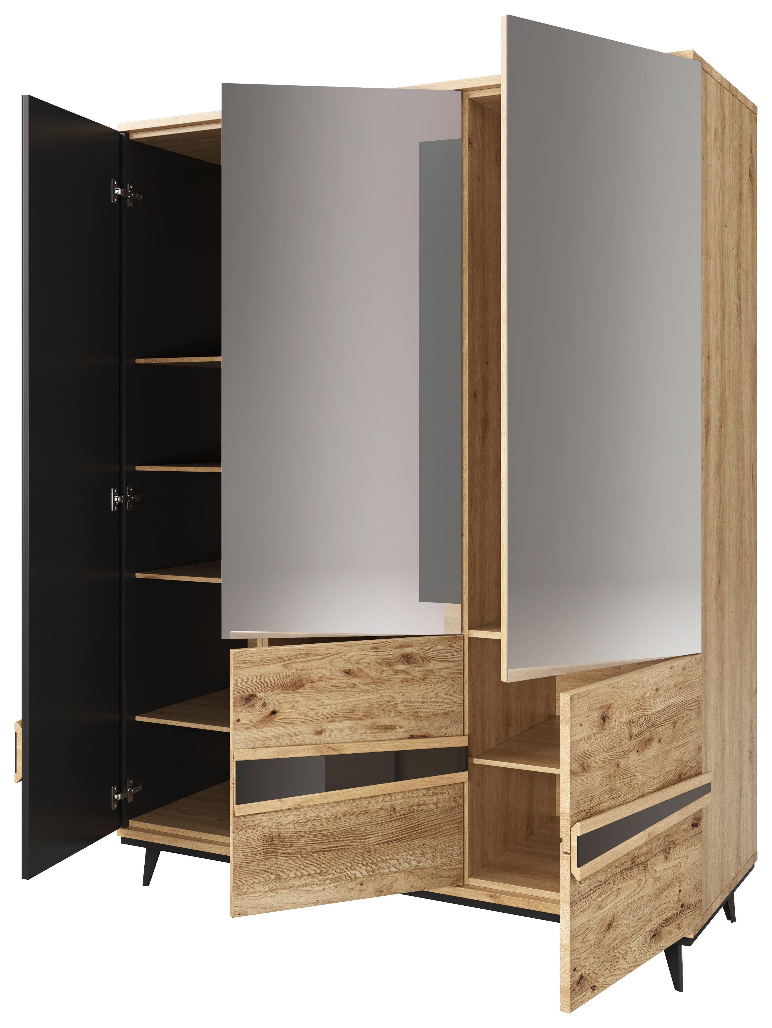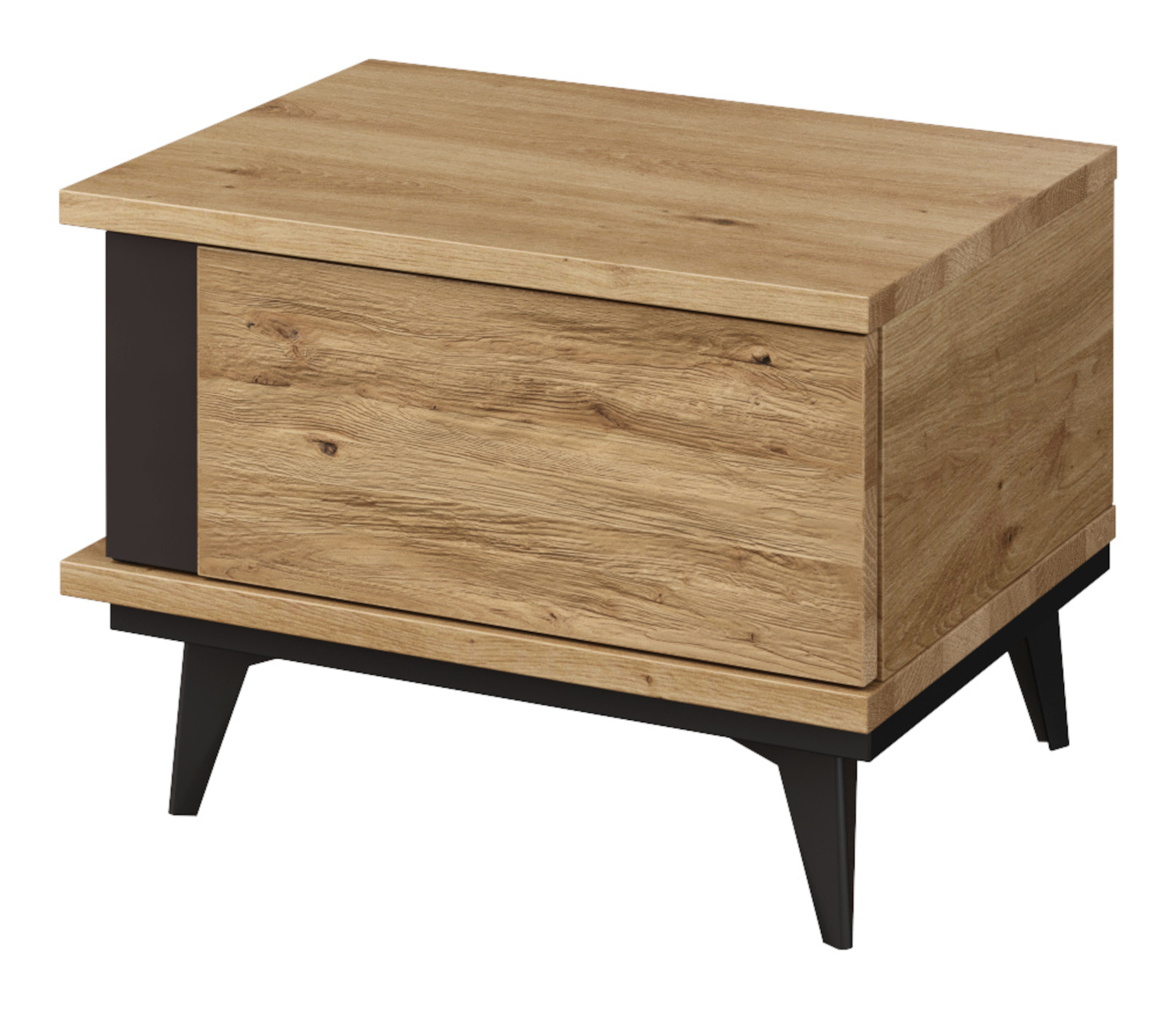 Ložnice Etna vás zaujme svým industriálním designem. Jedinečným prvkem jsou zvláštní rukojeti na dvířkách, které dodají nábytku nádech elegance. Produkty jsou vyrobeny z masivního dubového dřeva a přírodní dubové dýhy s černými skleněnými prvky a dvířky. Kvalitní technologie lakování a moření navodí přírodní vzhled dřeva a zvýrazní tak jeho léta. Nábytek stojí na černých kovových nožkách, které provzdušní váš celkový prostor. Dvířka i zásuvky v celém systému mají jednoduchý systém tichého dovírání.