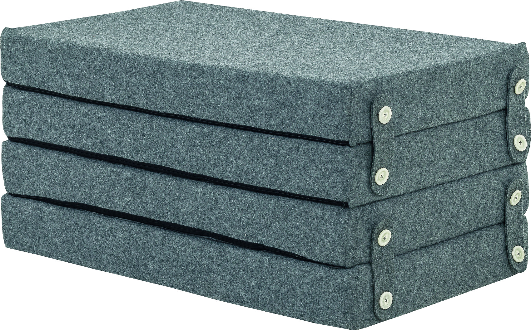 Rozkládací matrace Nest je vyplněna plstí a z boční strany jsou plastové knoflíky. Složenou matraci lze položit na skříňku s kontejnerem Nest.