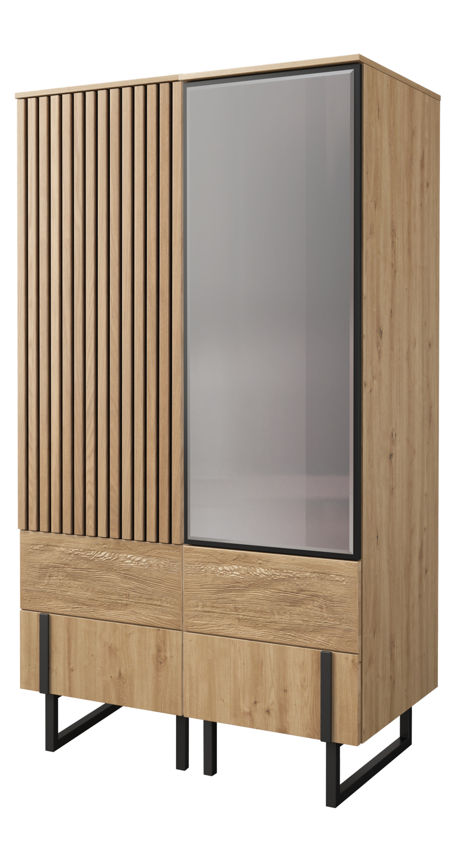 Moderní šatní skříň Gintaro II 4D vás zaujme svým jedinečným designem. Černé lamely na přední straně nábytku dodají nádech elegance a kovové a neobyčejně tvarované nohy provzdušní váš interiér. Skříň je vyrobena z masivního dubového dřeva a přírodní dubové dýhy. Kvalitní technologie lakování a moření navodí přírodní vzhled dřeva a zvýrazní tak jeho léta. Dvířka i zásuvky v celém systému mají tichý jednoduchý dotykový systém otevírání a zavírání - Push to open.