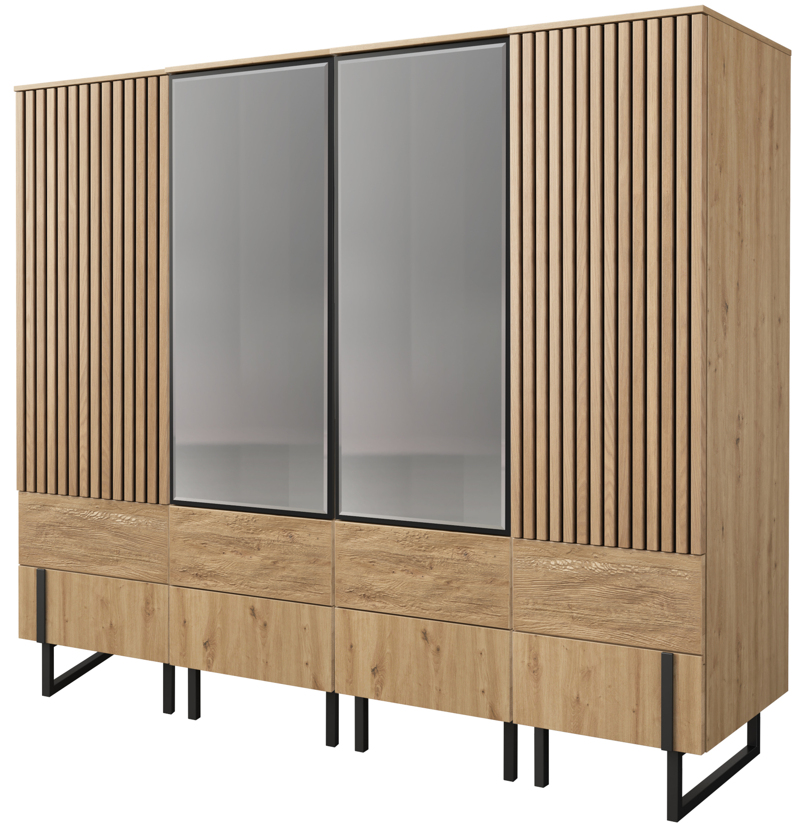 Moderní šatní skříň IV Gintaro 6D4SZ vás zaujme svým jedinečným designem. Černé lamely na přední straně nábytku dodají nádech elegance a kovové a neobyčejně tvarované nohy provzdušní váš interiér. Skříň je vyrobena z masivního dubového dřeva a přírodní dubové dýhy. Kvalitní technologie lakování a moření navodí přírodní vzhled dřeva a zvýrazní tak jeho léta. Dvířka i zásuvky v celém systému mají tichý jednoduchý dotykový systém otevírání a zavírání - Push to open.