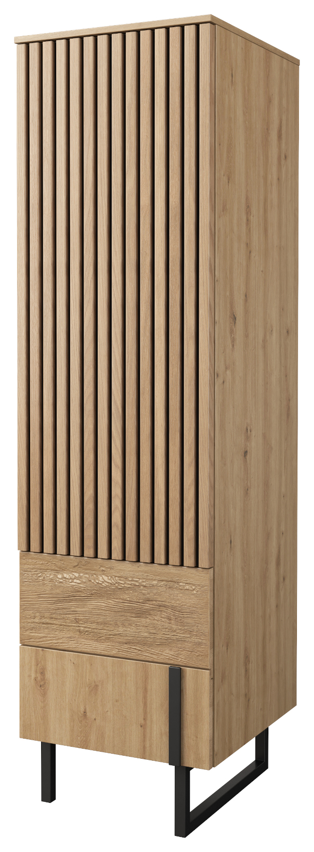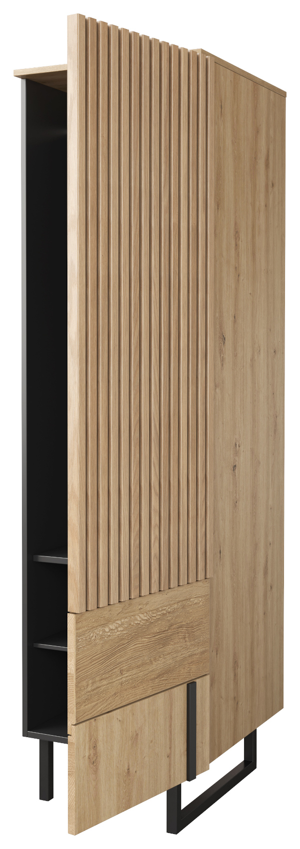 Moderní šatní sloupek Gintaro 2D bez zrcadla vás zaujme svým jedinečným designem. Černé lamely na přední straně nábytku dodají nádech elegance a kovové neobyčejně tvarované nohy provzdušní váš interiér. Sloupek je vyroben z masivního dubového dřeva a přírodní dubové dýhy. Kvalitní technologie lakování a moření navodí přírodní vzhled dřeva a zvýrazní tak jeho léta. Dvířka i zásuvky v celém systému mají tichý jednoduchý dotykový systém otevírání a zavírání - Push to open. .