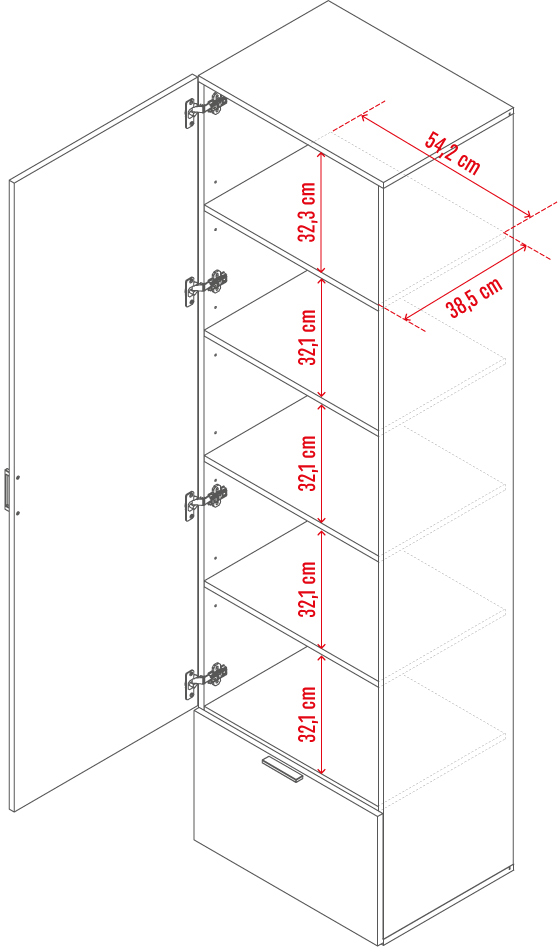 Součástí skříně jsou 4 police s libovolně nastavitelnou výškou. Ve spodní části je zásuvka na kovových pojezdech Quadro.
