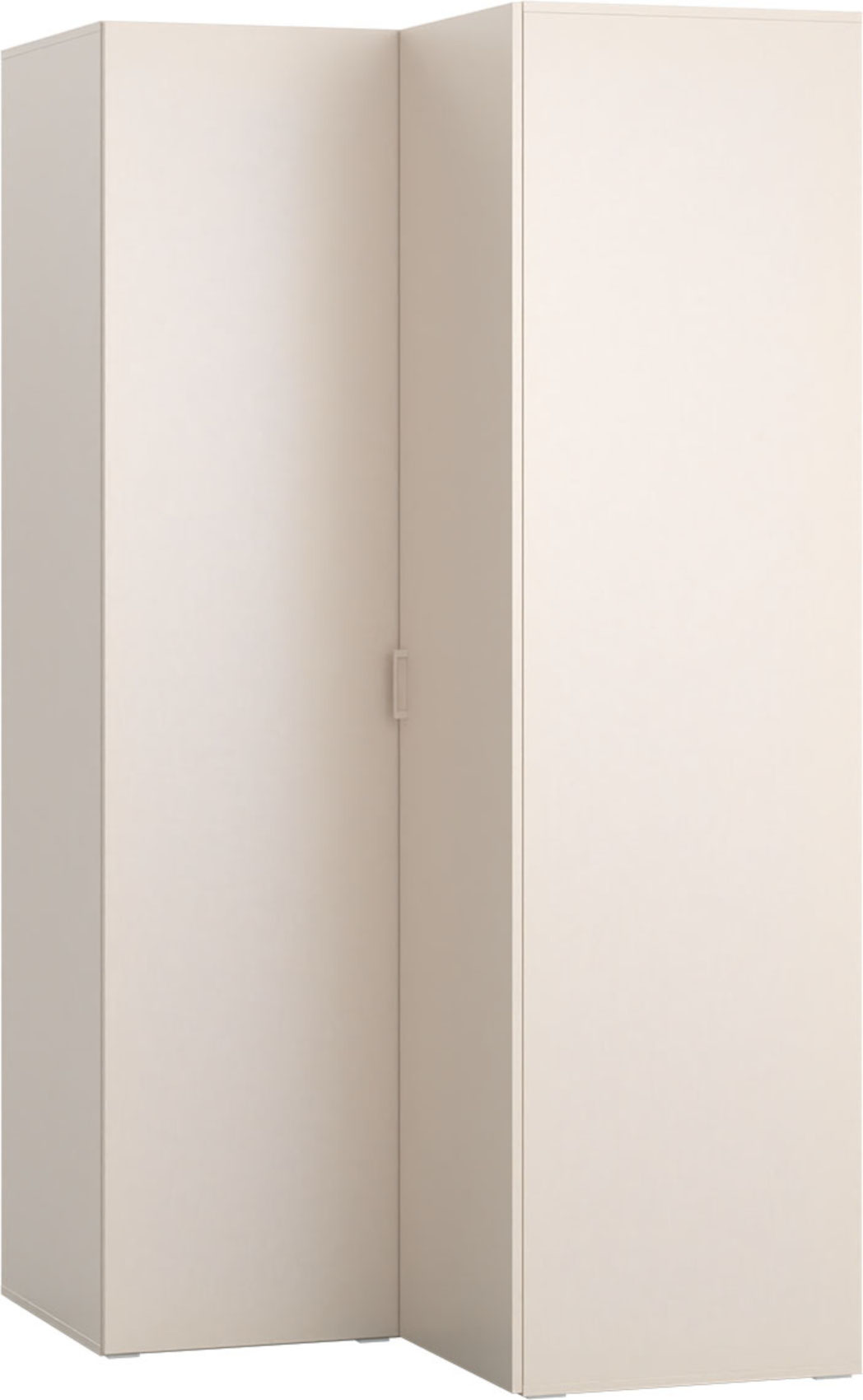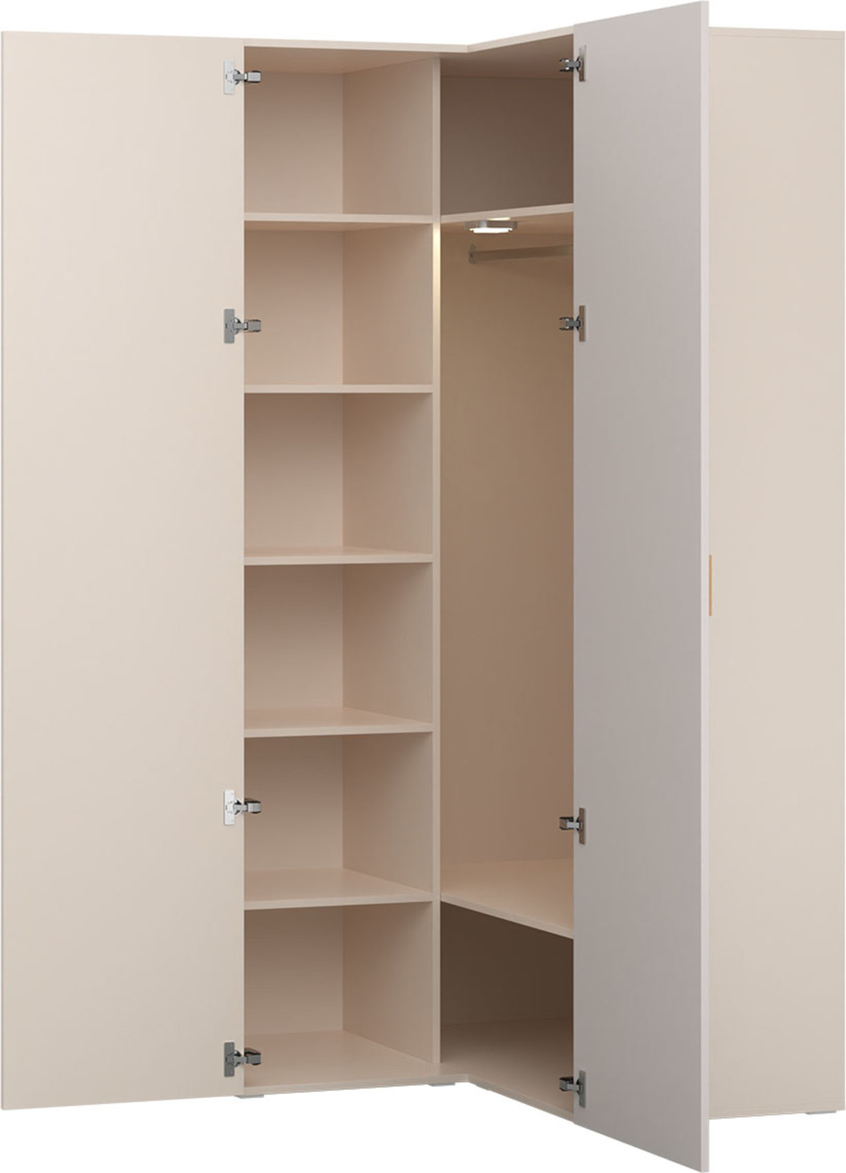 Rohová šatní skříň 4You vás zaujme svým moderní designem. Je vyrobena z kvalitního lamina o síle 16 mm odolného vůči poškrábání a nečistotám. Dvířka mají zabudovaný systém tichého dovírání. V naší nabídce naleznete 2 odstíny - pískově béžová a bílá.