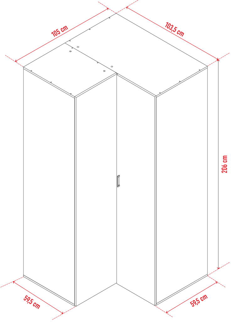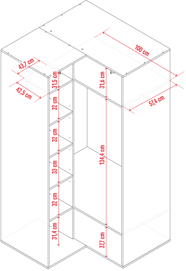 V levé části skříně je vloženo 5 polic, z nichž prostřední 3 mají libovolně nastavitelnou výšku. Za pravými dvířky je vložena šatní tyč a 2 prostorné police. Uprostřed horní desky skříně je namontováno LED osvětlení, které se při otevření automaticky rozsvítí.