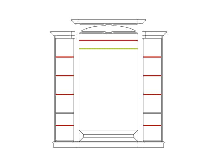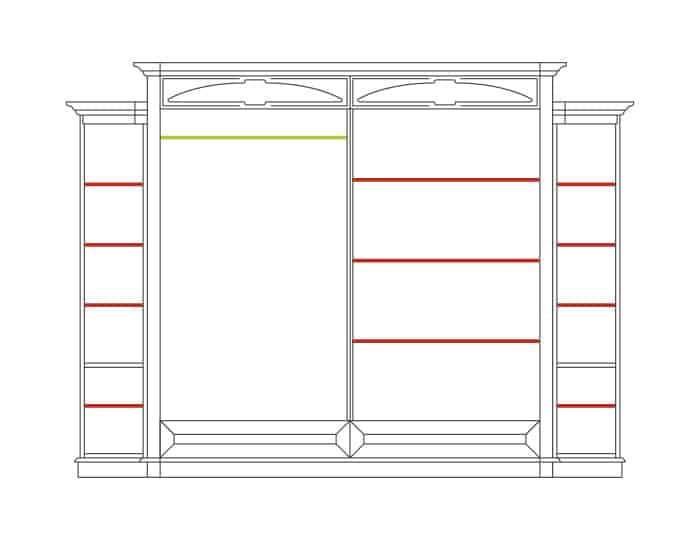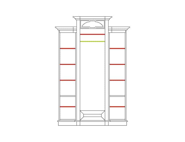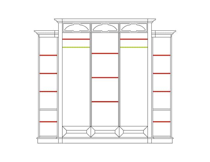 Skříň má na bočních stranách 2 plná dvířka s 8 lakovanými policemi. Ve vnitřním prostoru prostřední části je v základním rozměru skříně vložena 1 šatní tyč a nad ní 1 lakovaná police.