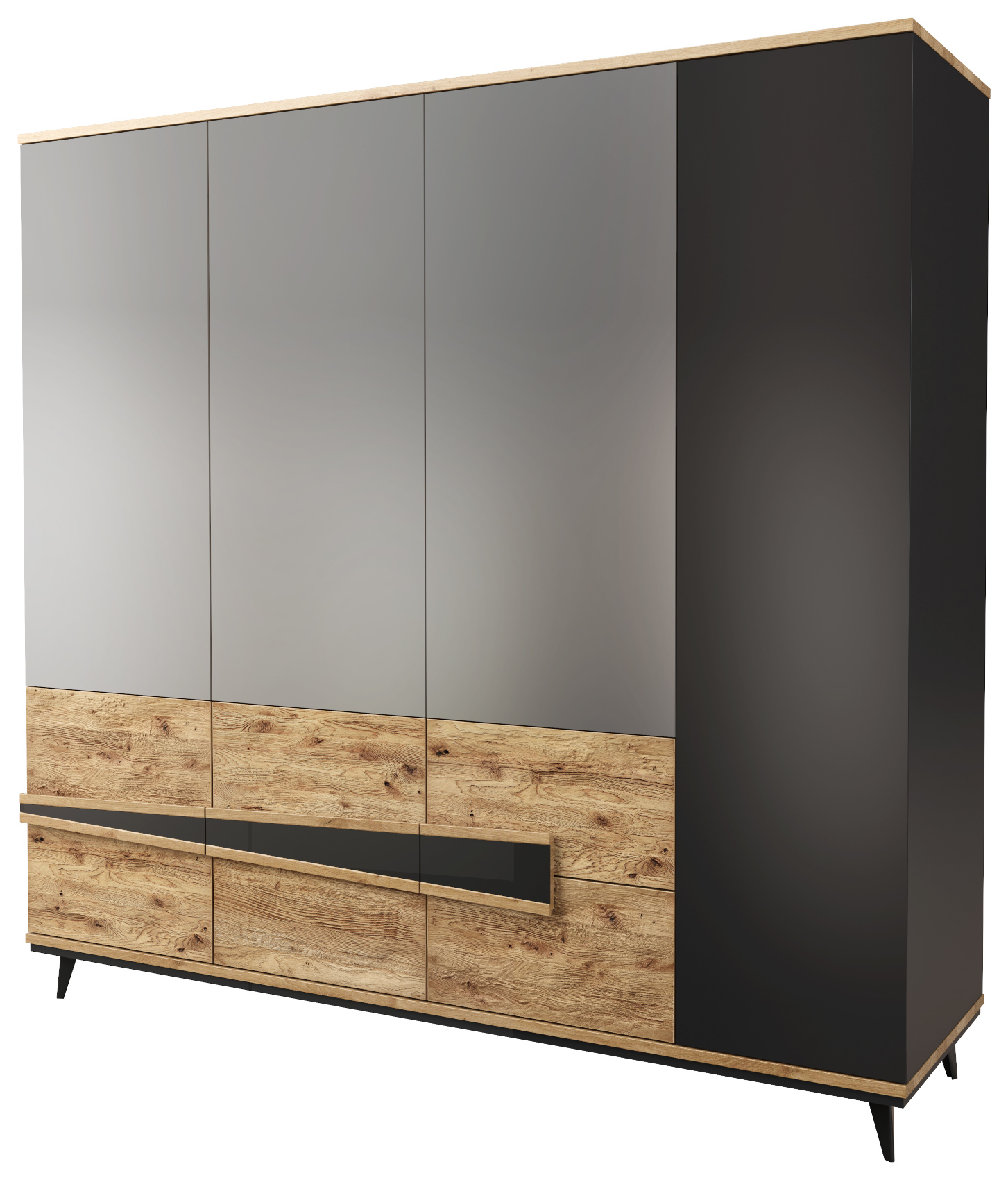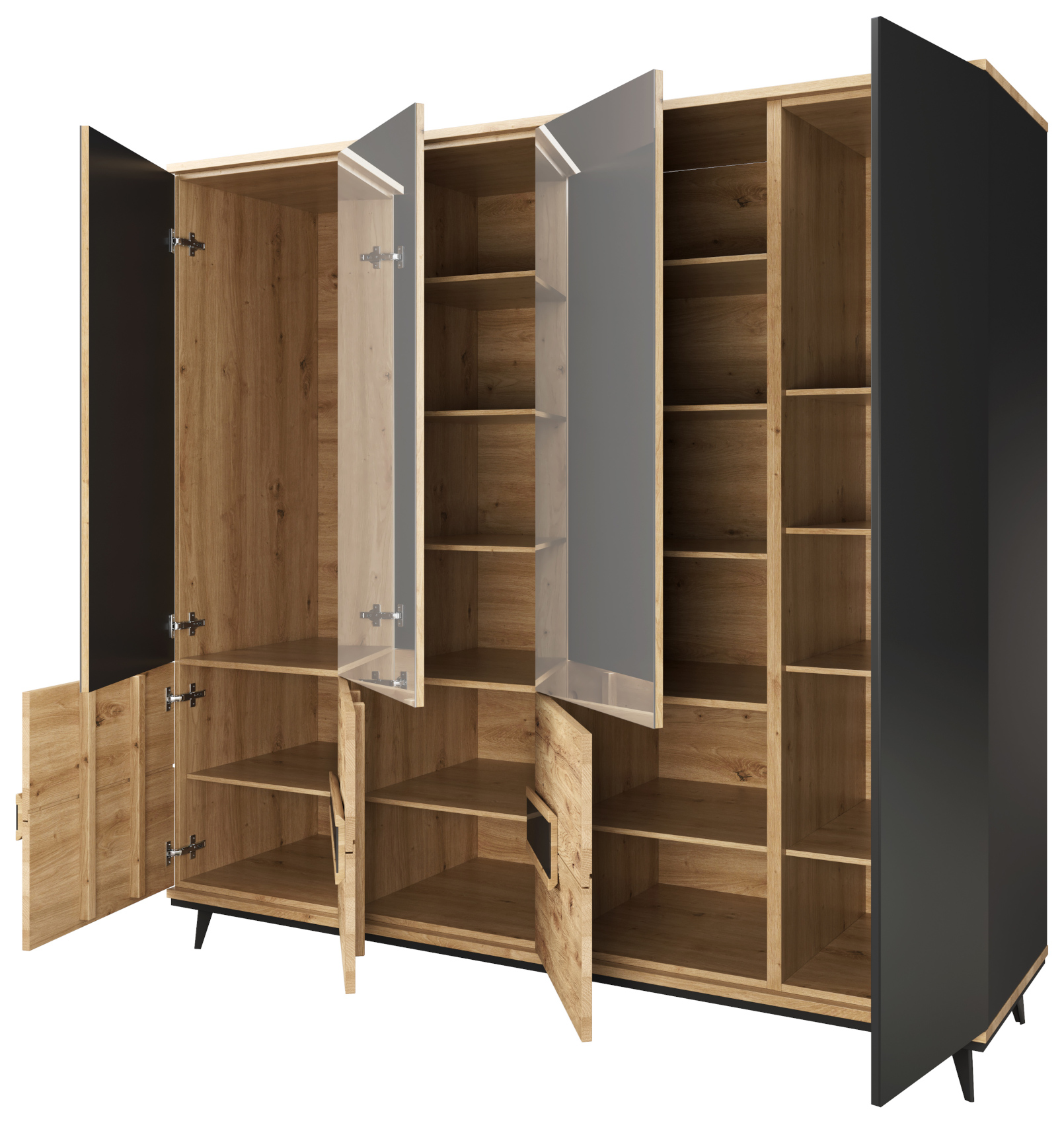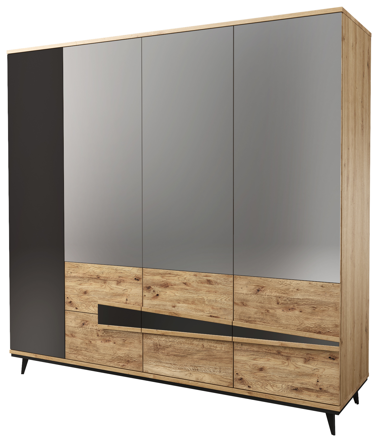 Moderní šatní skříň Etna IV 7D vás zaujme svým industriálním designem. Jedinečným prvkem jsou zvláštní rukojeti na dvířkách, které dodají nábytku nádech elegance. Skříň je vyrobena z masivního dubového dřeva a přírodní dubové dýhy s černými skleněnými prvky a dvířky. Kvalitní technologie lakování a moření navodí přírodní vzhled dřeva a zvýrazní tak jeho léta. Nábytek stojí na černých kovových nožkách, které provzdušní váš celkový prostor. Dvířka i zásuvky v celém systému mají jednoduchý systém tichého dovírání.