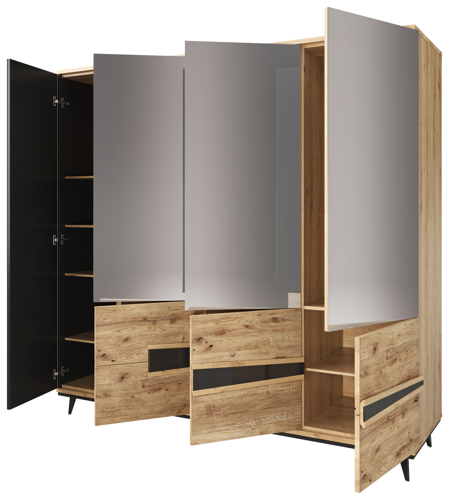 Součástí skříně je 7 dvířek se 3 zrcadly (lze si vybrat pravé či levé provedení). Ve vnitřním prostoru je vloženo 16 lakovaných polic.