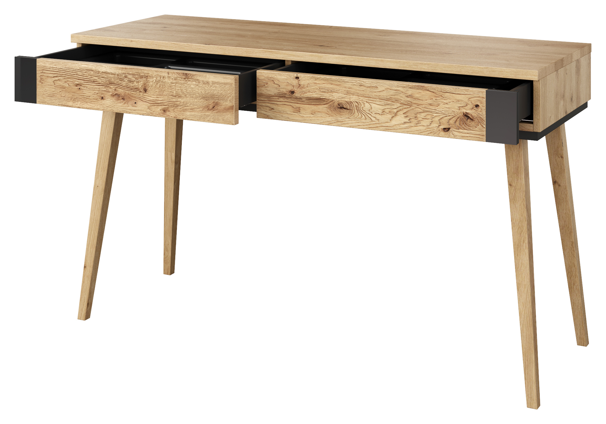 Moderní toaletní stolek Etna zaujme svým jednoduchým designem. Je vyroben z masivního dubového dřeva a přírodní dubové dýhy s černými lakovanými detaily. Kvalitní technologie lakování a moření dodává nábytku přirozený vzhled dřeva a zvýrazňuje strukturu lét.