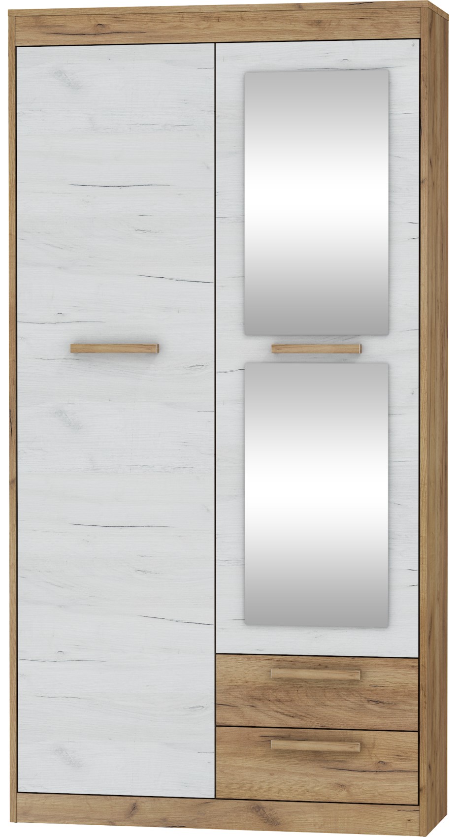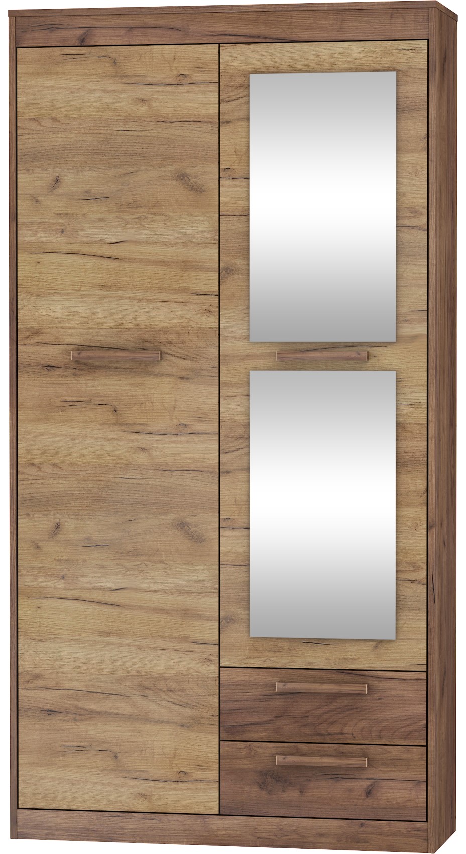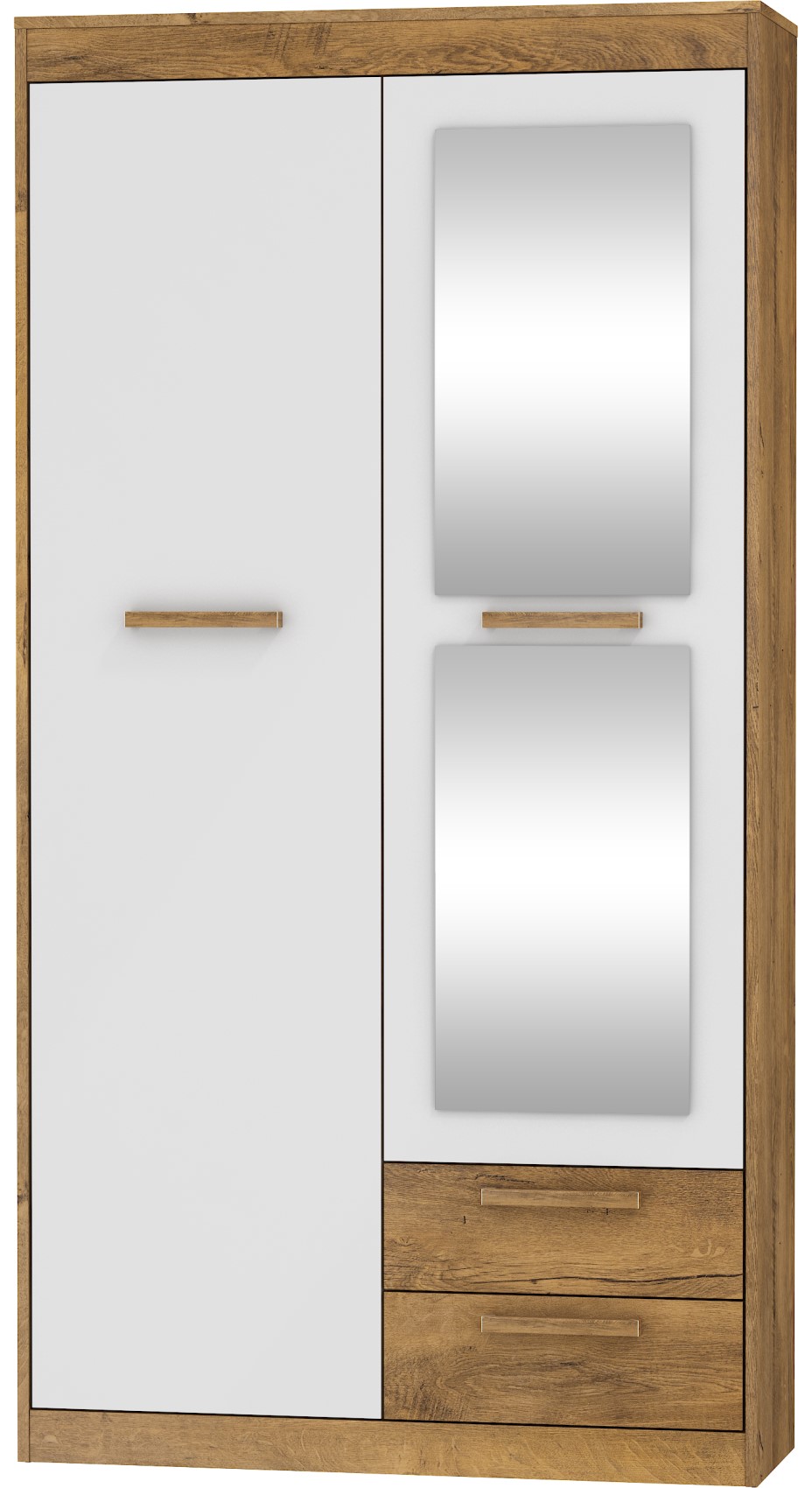 Uvnitř skříně na pravé straně se nacházejí tři police, které můžete využít na uskladnění různých nezbytností. Na straně levé se nachází šatní tyč s 1 policí. Skříň má také k dispozici dvě zásuvky na kovových pojezdech.