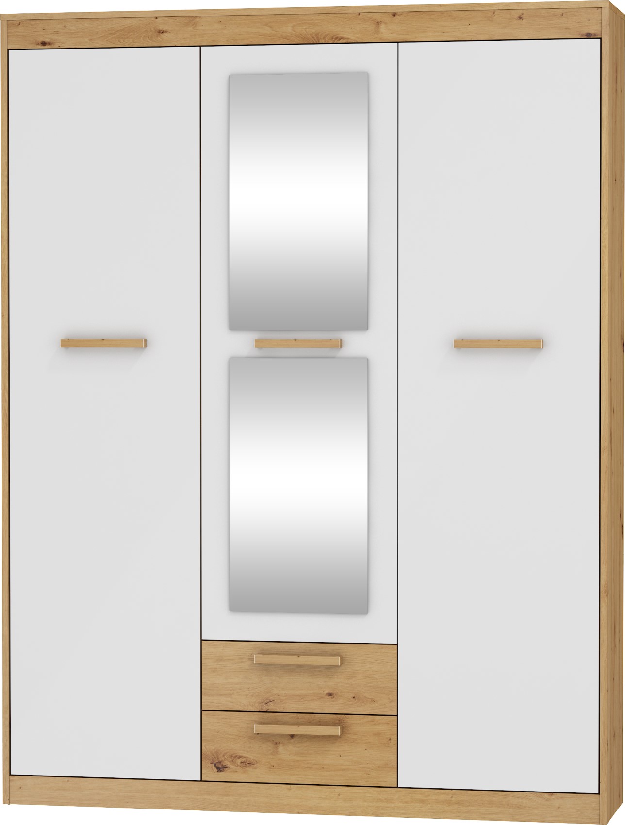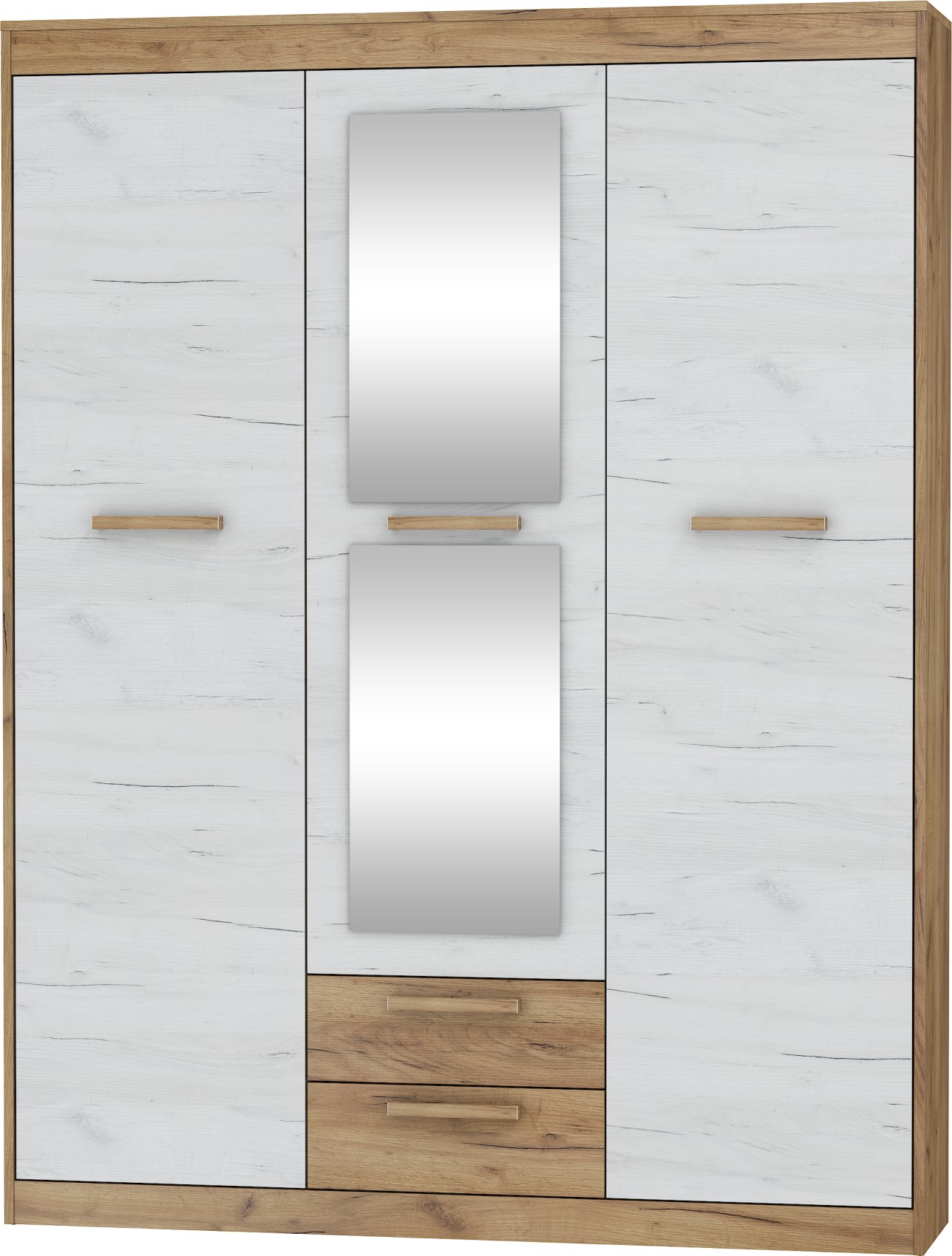 Uvnitř skříně se uprostřed nacházejí tři police, které můžete využít na uskladnění různých nezbytností. Po stranách se nachází nachází prostor s šatními tyčemi a 2 policemi. Skříň má také k dispozici dvě spodní zásuvky na kovových pojezdech.