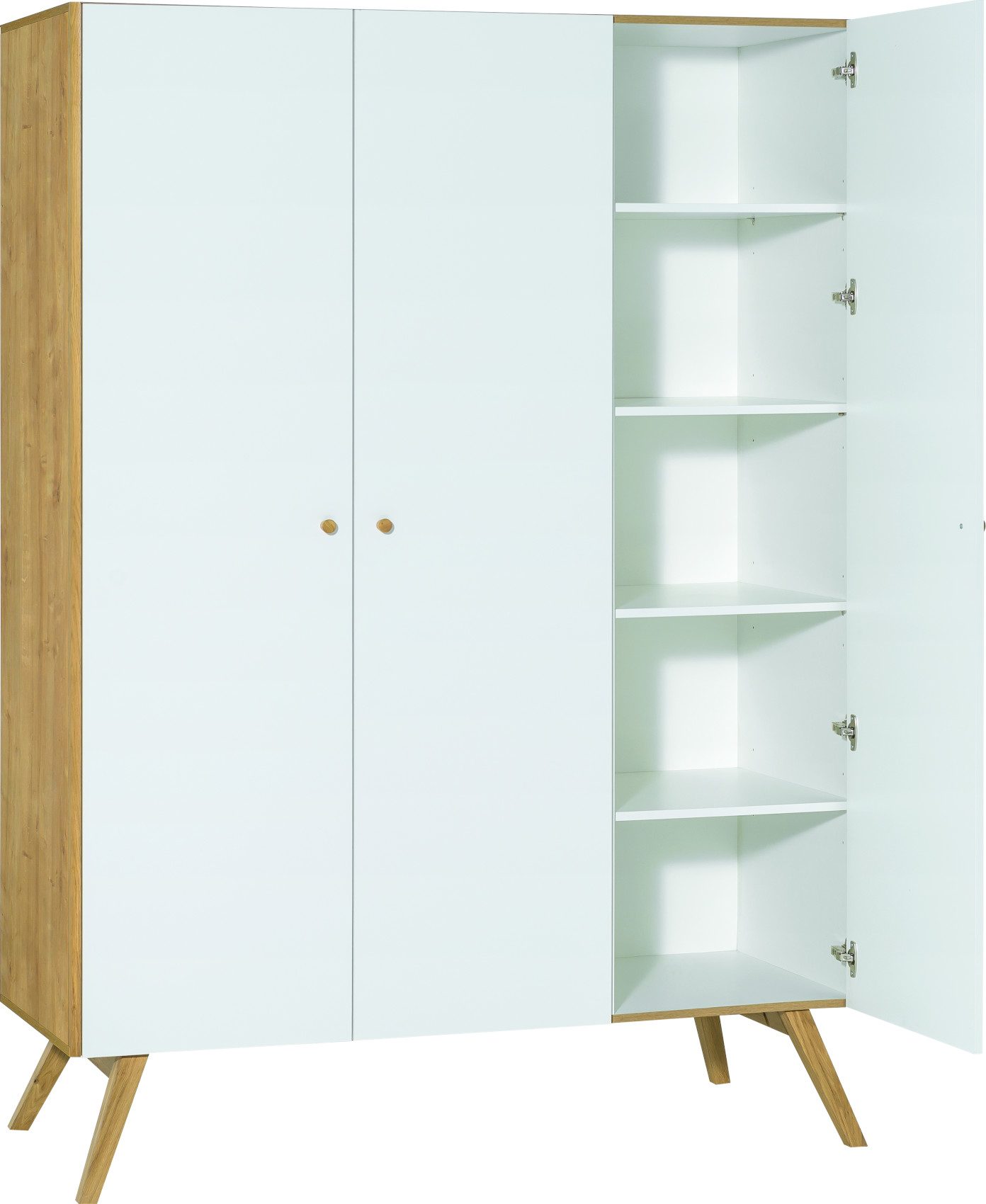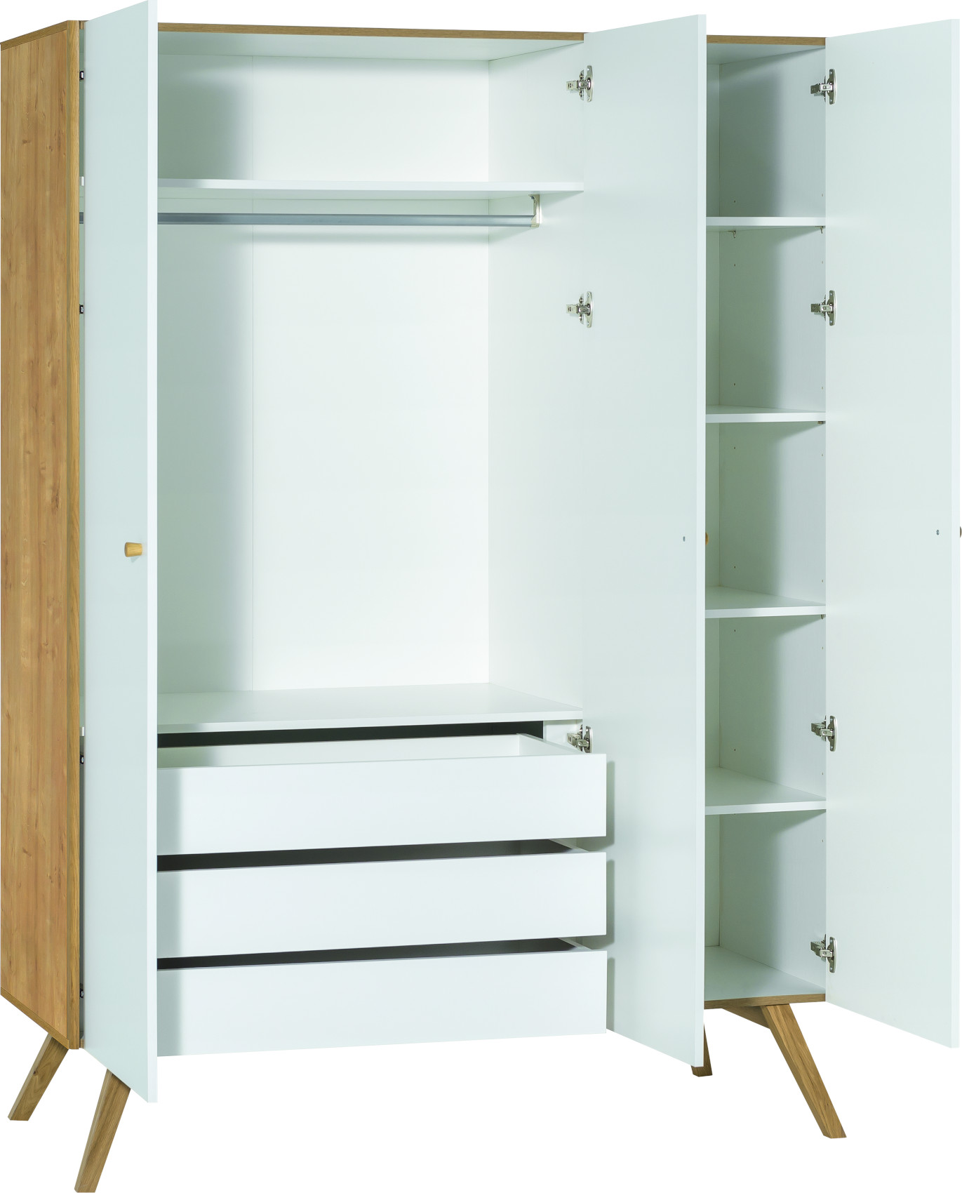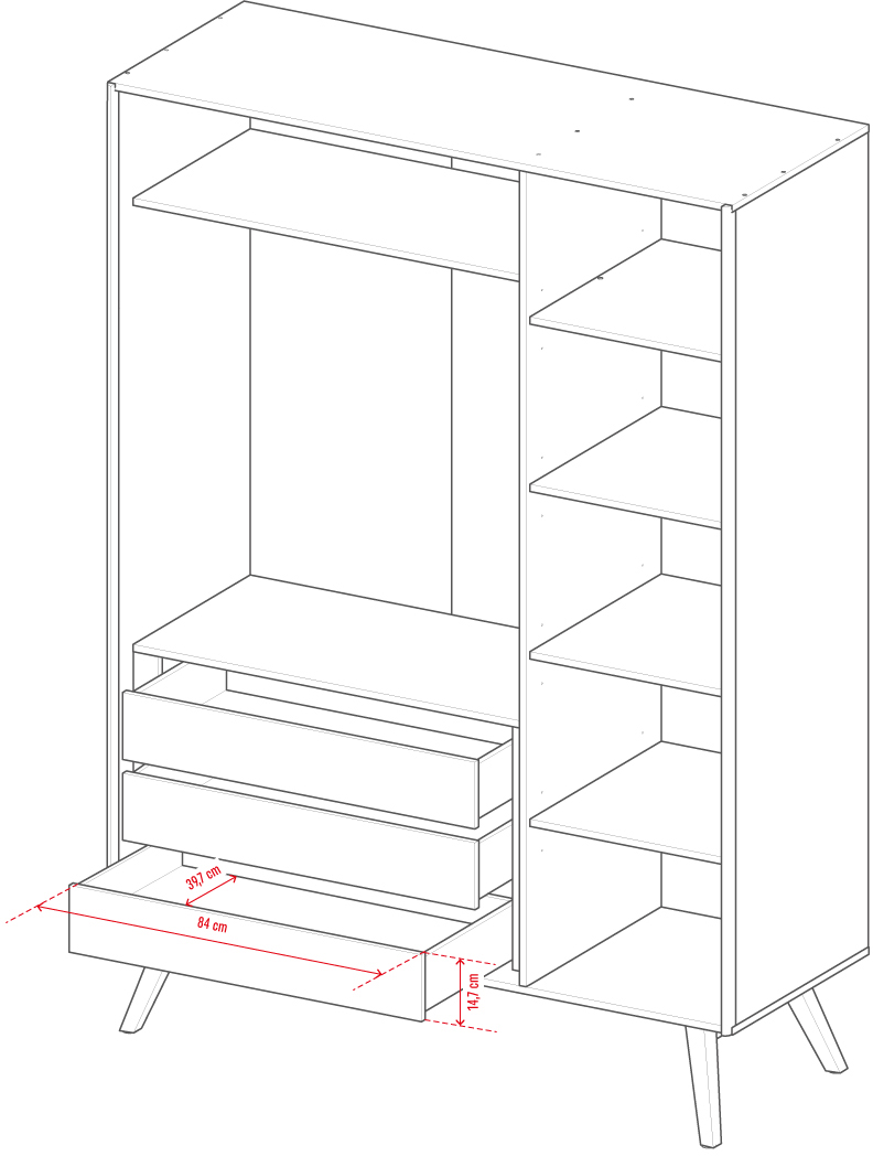 Skříň má 3 dveře. Ve vnitřním prostoru v levé části je vložena 1 šatní tyč a 3 zásuvky na kovových pojezdech. Na pravé straně jsou 4 police s libovolně nastavitelnou výškou a krátká šatní tyč.