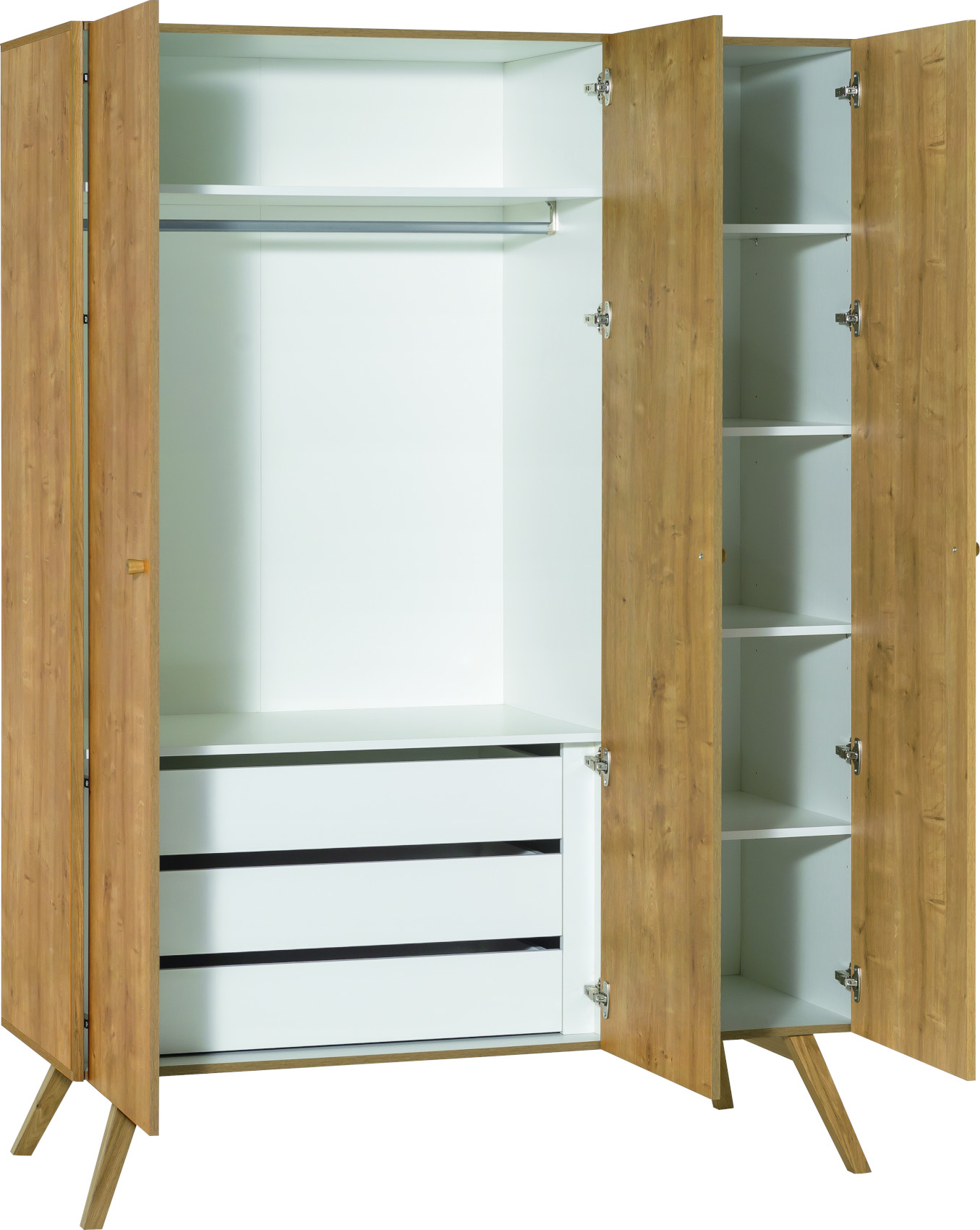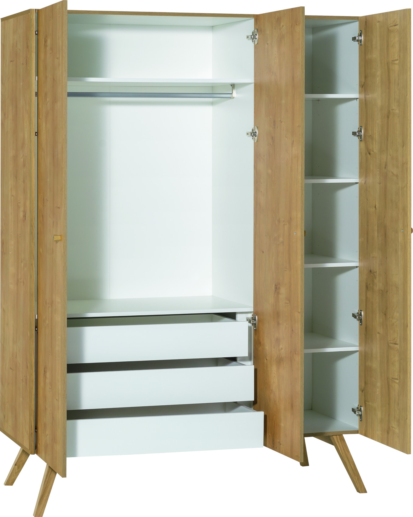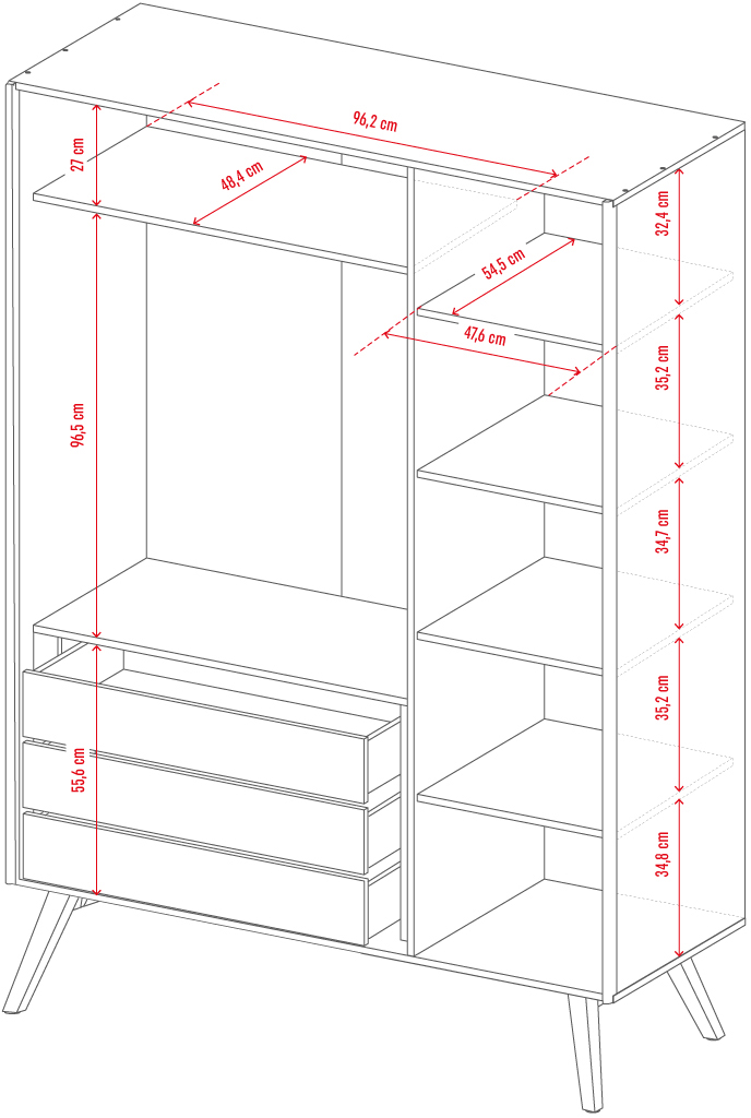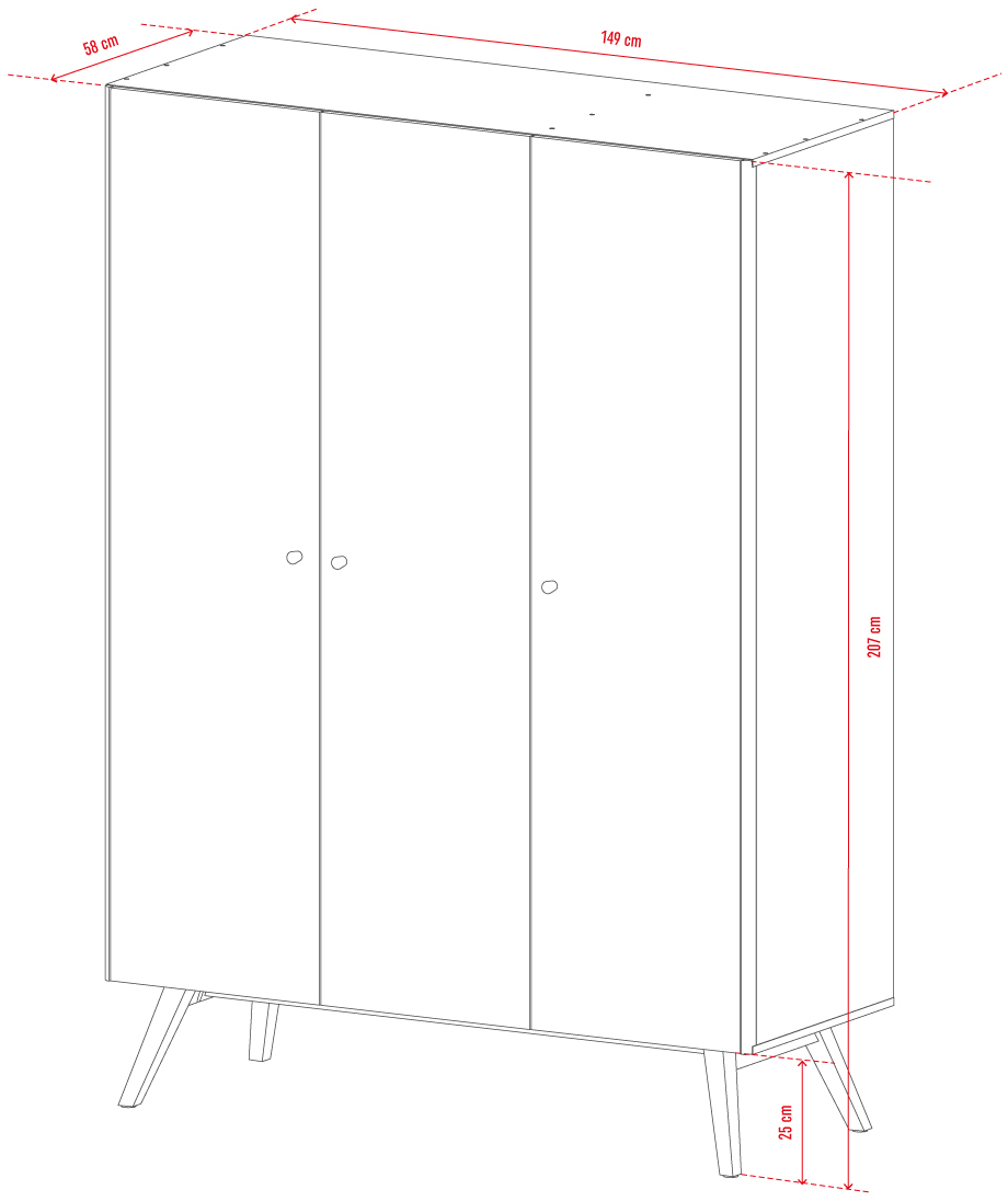 Skříň má 3 dveře. Ve vnitřním prostoru v levé části je vložena 1 šatní tyč a 3 zásuvky na kovových pojezdech. Na pravé straně jsou 4 police s libovolně nastavitelnou výškou a krátká šatní tyč.