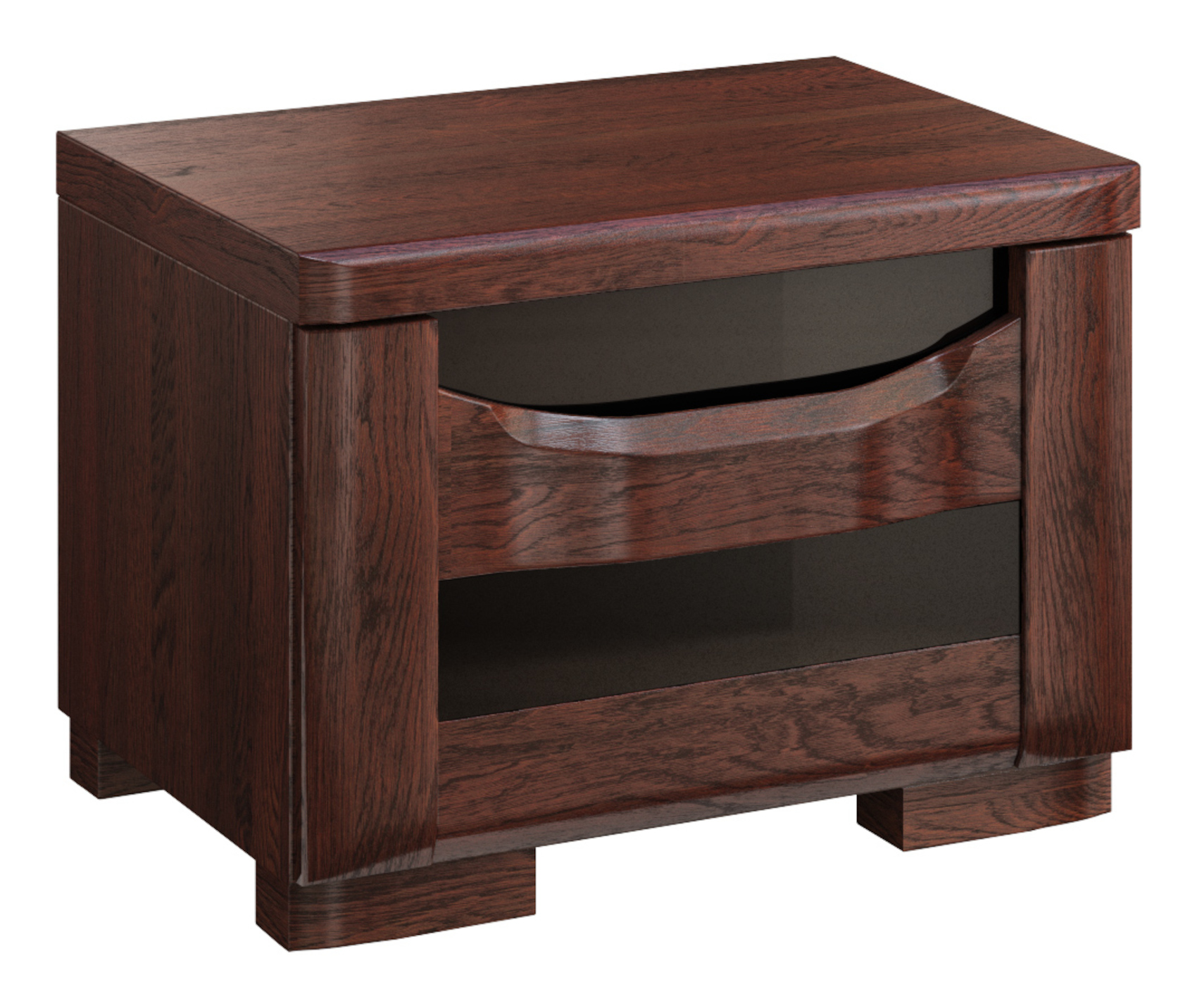 Luxusní noční stolek Riva je vyroben z masivního dubového dřeva a přírodní dubové dýhy s černými prvky ze skla Lacobel. Vzhledem k použitému materiálu se jedná o velmi kvalitní a stabilní nábytek. Čtyřvrstvá technologie povrchového moření a lakování dává nábytku jedinečný design s výraznou strukturou lét masivního přírodního dřeva. Úchyty stolku jsou z přírodního masivu.