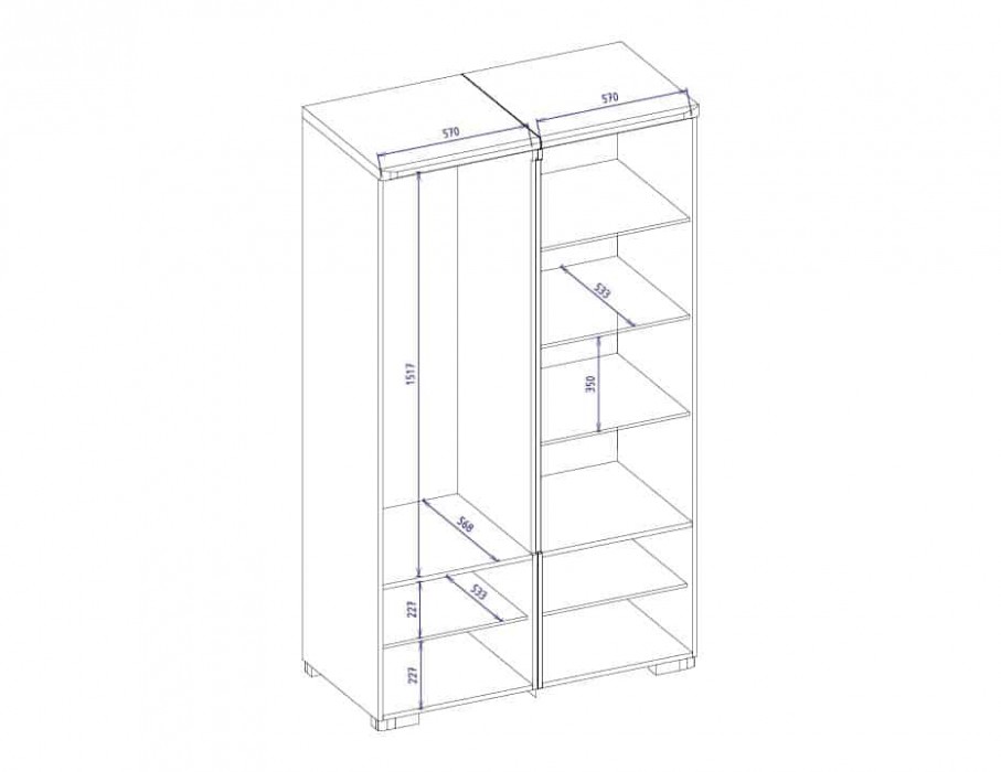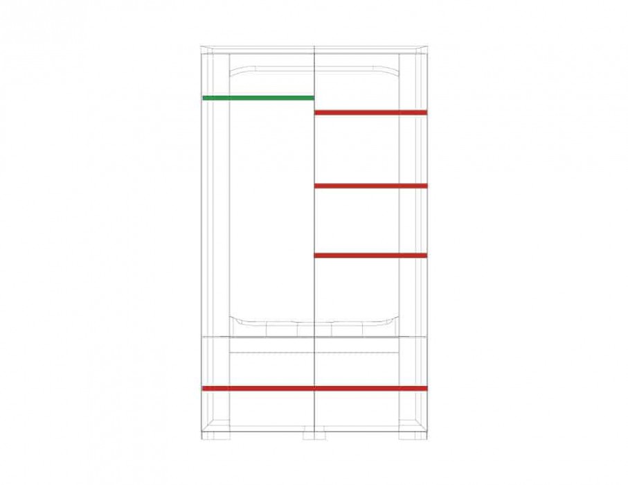Šatní skříň je rozdělena do 4 částí. Horní dveře jsou očalouněné ekologickou kůží, ve vnitřním prostoru je vložena šatní tyč a na druhé straně jsou 3 lakované police. Spodní část má 2 plná dvířka s 2 lakovanými policemi.