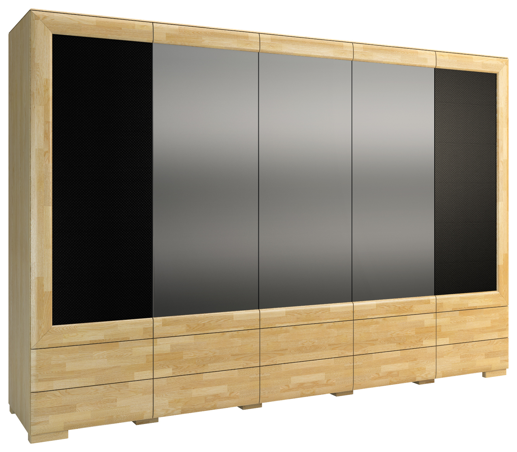Šatní skříň Rossano 5D vás zaujme svým moderním a jednoduchým designem. Je vyrobena z masivního dubového dřeva. Kvalitní technologie lakování a moření dodává nábytku přirozený vzhled a zvýrazňuje jeho strukturu lét. Za příplatek si můžete zvolit variantu s masivní dubovou hranou. Celkový systém má jednoduchý dotykový systém otevírání dvířek a zásuvek - Push to open. Máte na výběr ze 2 moření dřeva a 2 výšek skříně - 204 cm a 224 cm