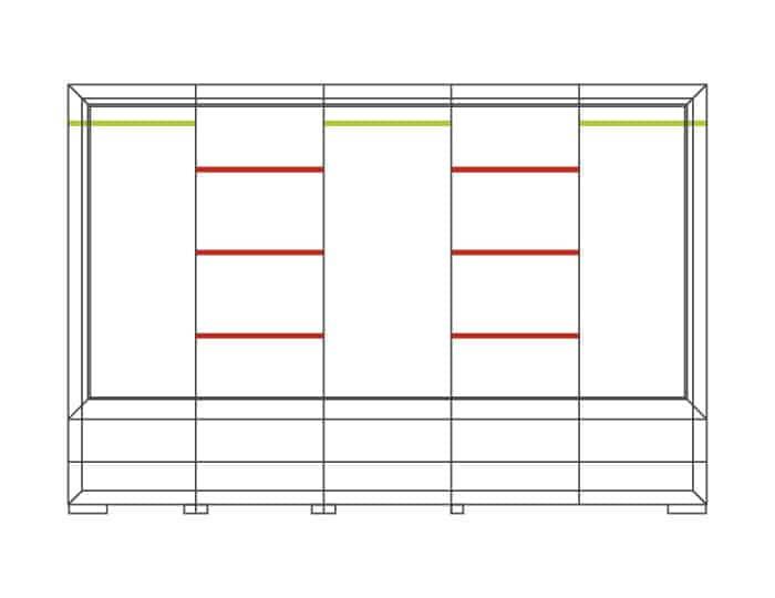 Skříň má v horní části 2 očalouněné dveře potahovou látkou a 3 dveře se zrcadly. Ve vnitřním prostoru jsou vloženy 3 čatní tyče a 6 lakovaných polic. Ve spodní části jsou na krajích 2 nízká dvířka a uprostřed 6 zásuvek na kovových pojezdech. Vyšší varianta skříně má 9 zásuvek na kovových pojezdech.