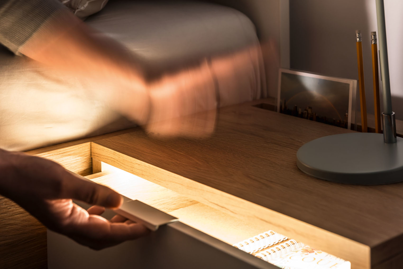 Pod horní deskou jsou 2 zásuvky na kovových pojezdech a LED osvětlení, které dodá nábytku nádech elegance. V zadní části je klapka, pod kterou je otevřený prostor k uložení zásuvky.