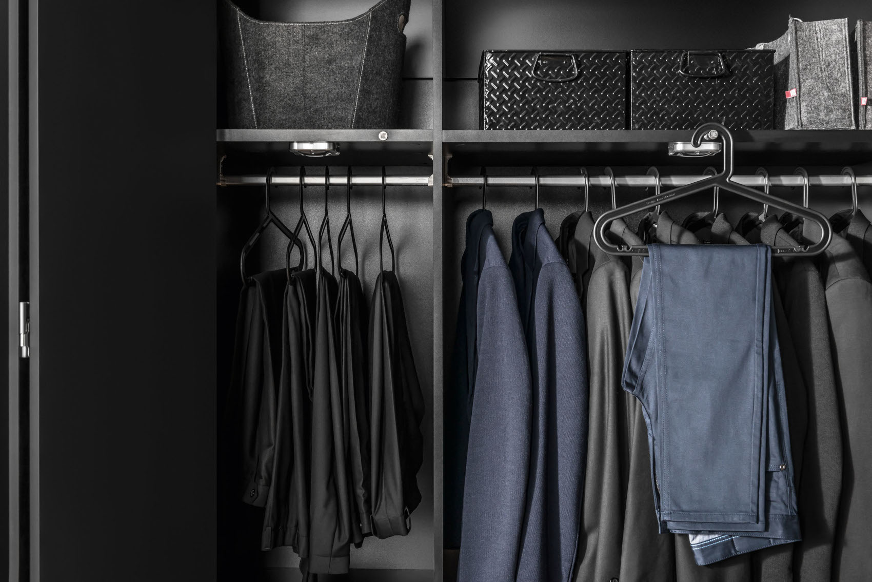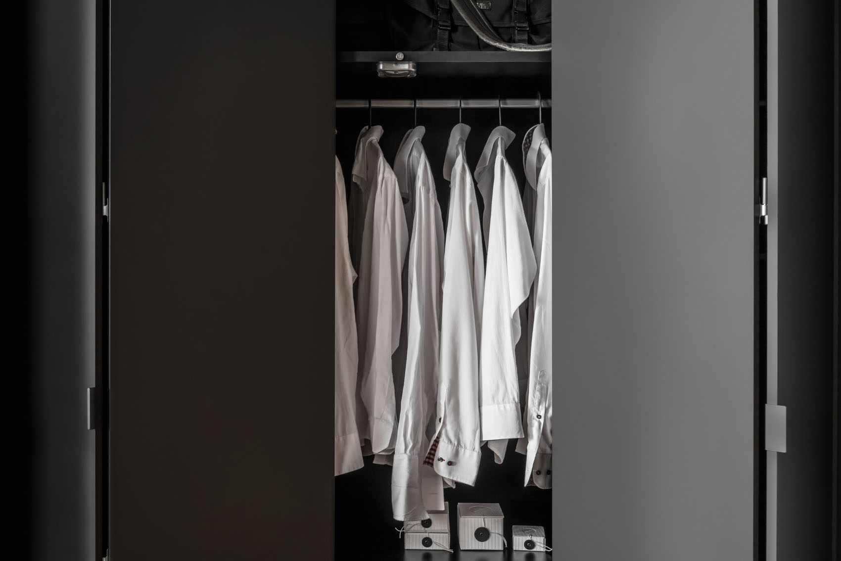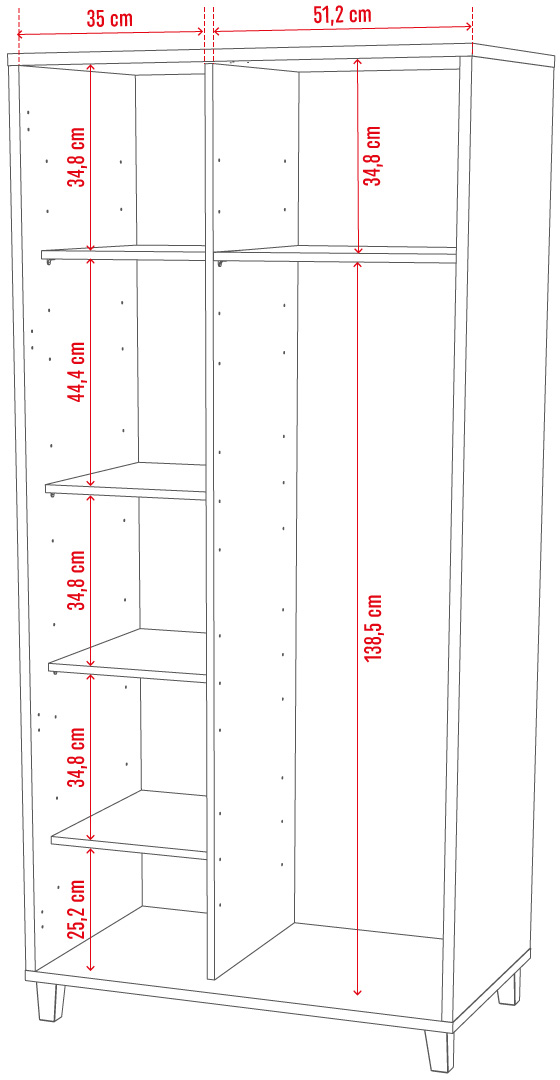 Ve vnitřním prostoru je vložena 1 šatní tyč a 5 polic s libovolně nastavitelnou výškou. Součástí skříně je LED osvětlení s pohybovým senzorem, které se rozsvítí při otevření skříně.